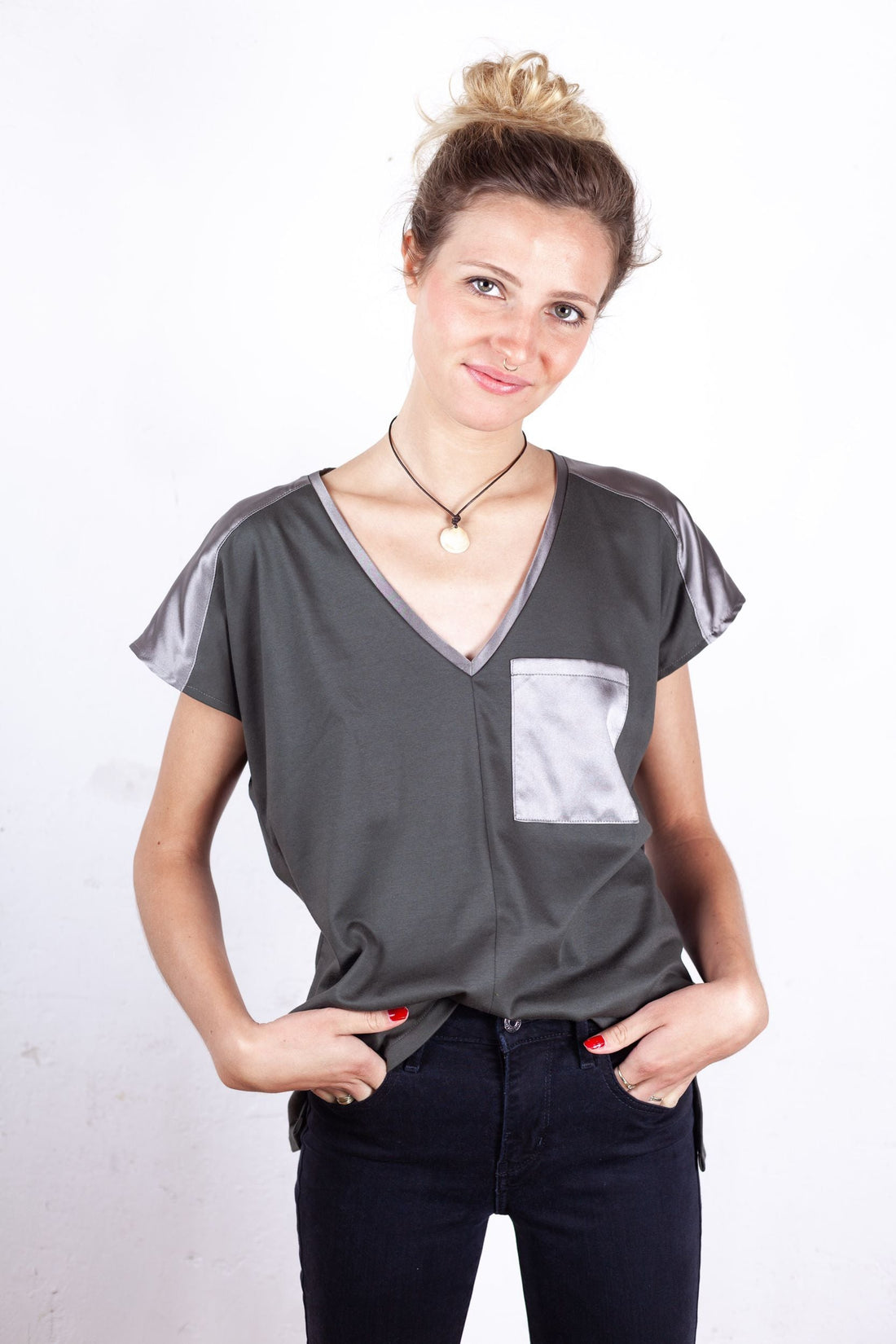 Wer denkt, Shirt ist doch gleich Shirt, sieht am Beispiel unseres Schnittmusters Olga, dass es auch in diesem Bereich unglaublich viele Varianten gibt. Wir sind unserer Liebe zum Patchen von verschiedenen Stoffen auch diesmal treu geblieben und haben daraus ein tolles und lässiges Shirt mit überschnittenen Schultern für euch entworfen. Die Besonderheit liegt wie immer im Detail: Die einteilige Schulterpasse, die aufgesetzte Tasche und der schmale Streifen im V-Ausschnitt sind aus Kontraststoff gefertigt. Die Länge in der hinteren Mitte beträgt: 72-76 cm.