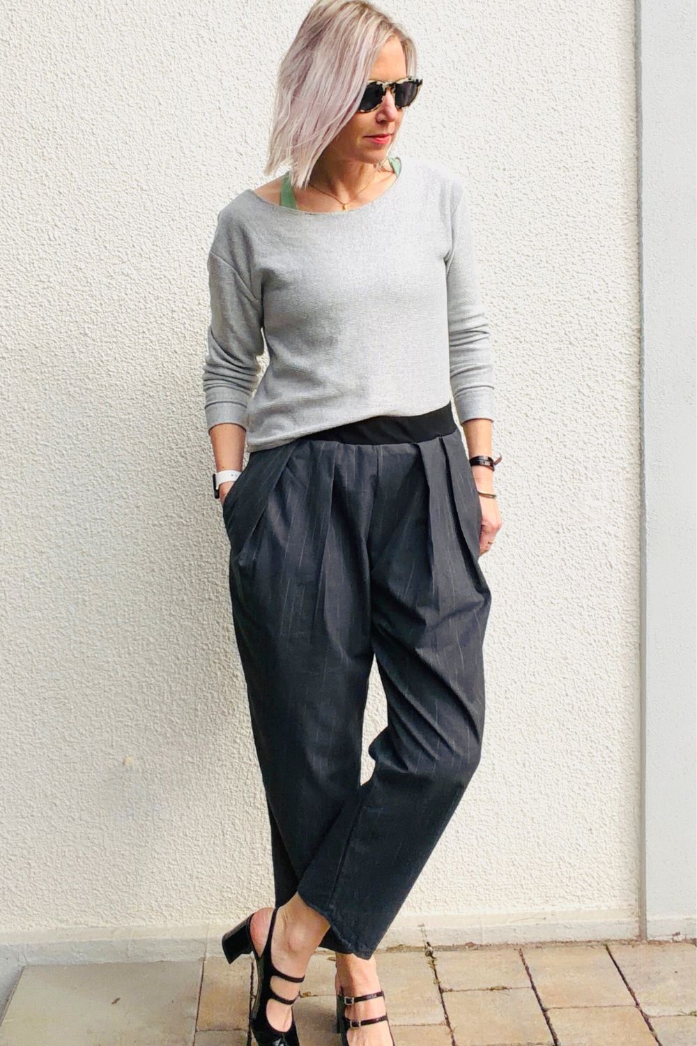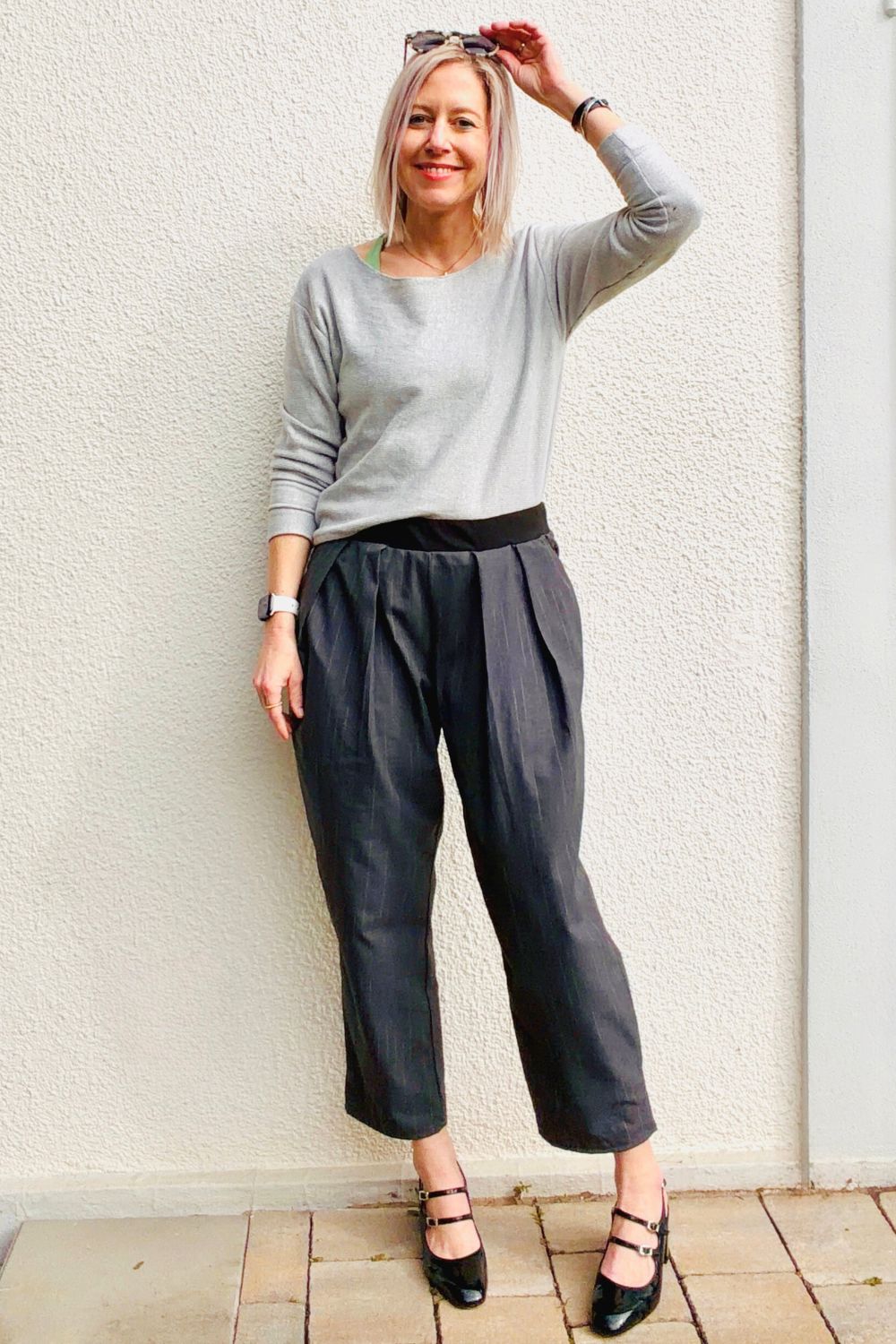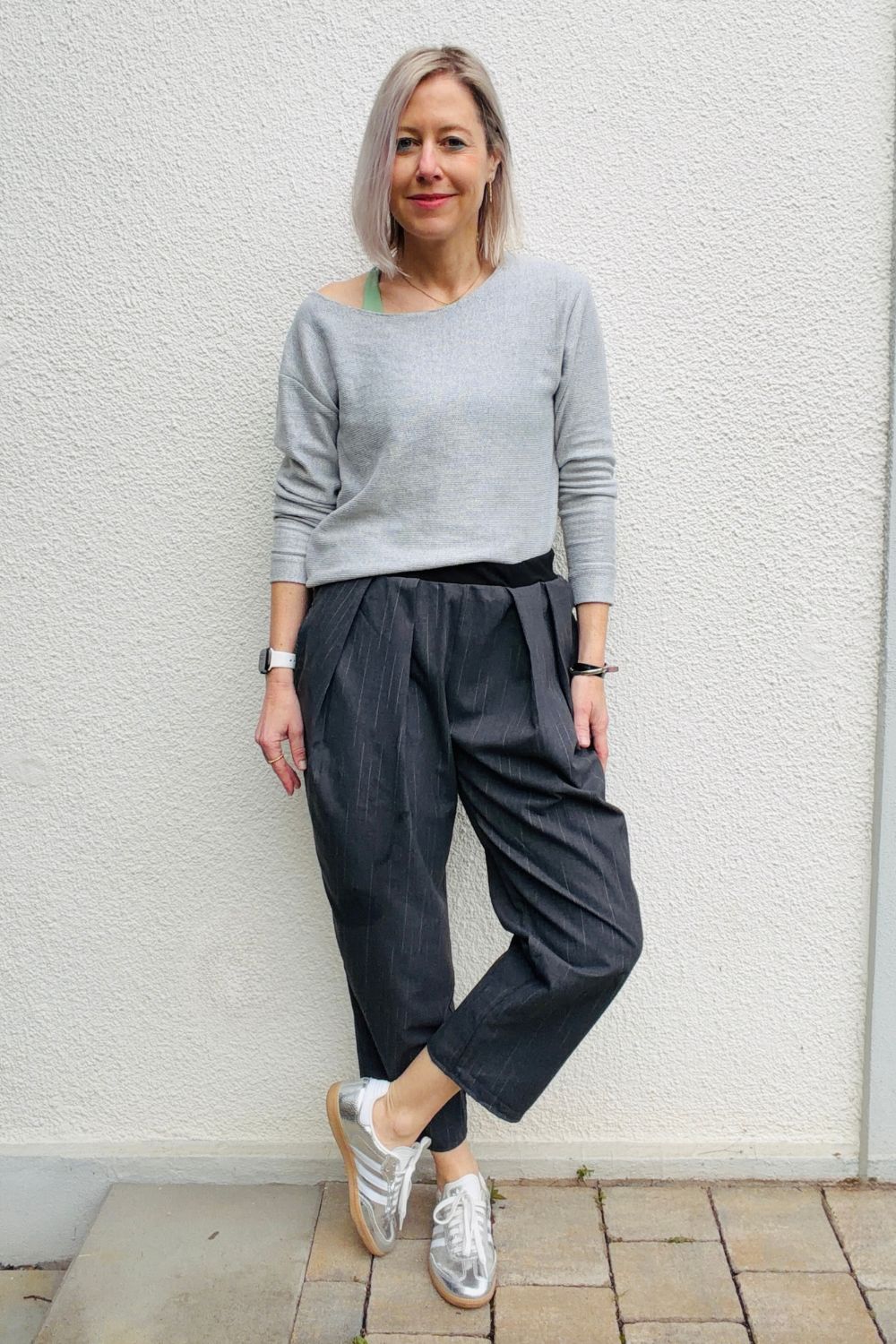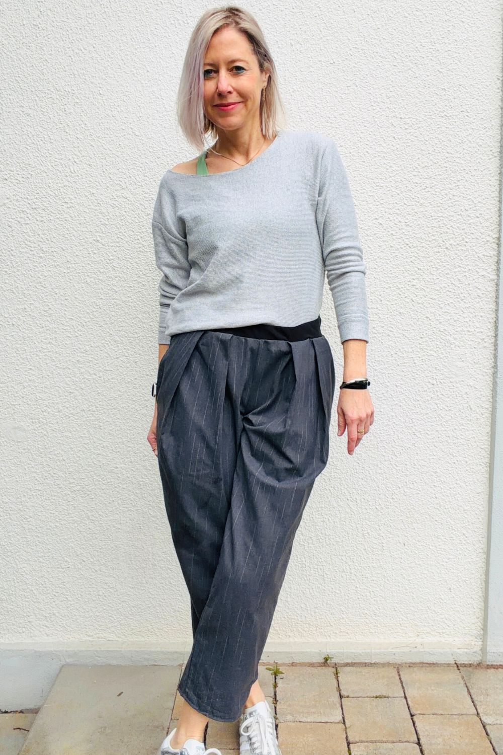 Die Bundfaltenhose funktioniert aber auch gut in Leinen oder Baumwolle, wenn du sie mit etwas mehr Stand haben möchtest.