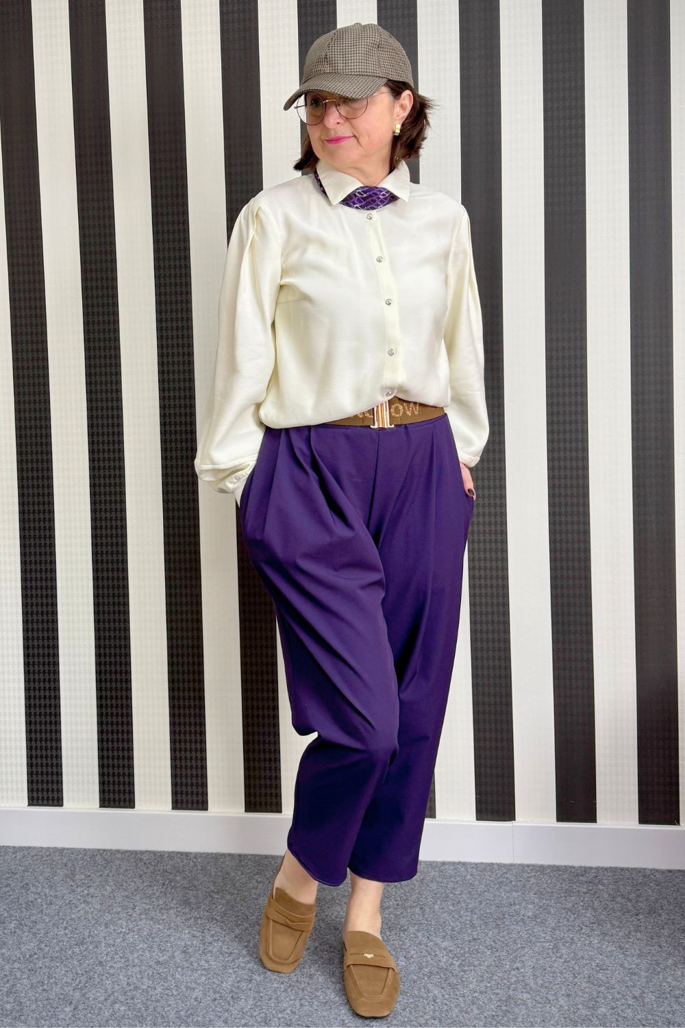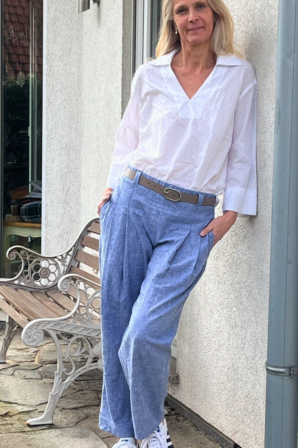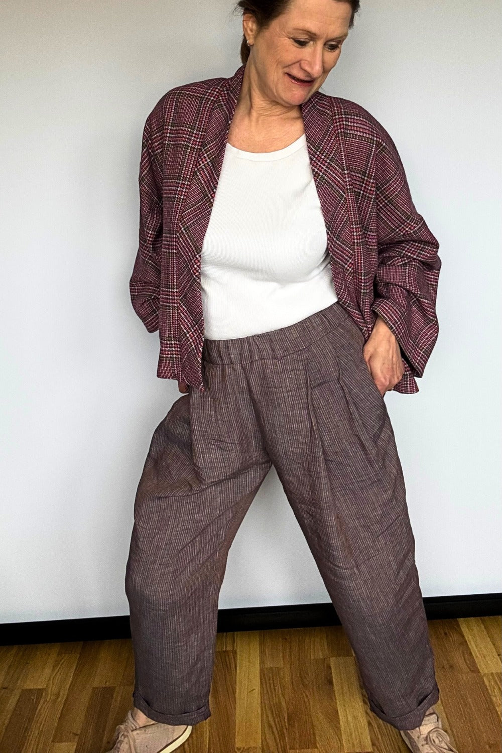 Die Bundfaltenhose funktioniert aber auch gut in Leinen oder Baumwolle, wenn du sie mit etwas mehr Stand haben möchtest.