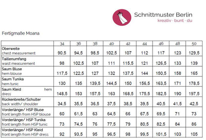 With the pattern of the Moana tunic you can sew three different models: the short-length blouse , the medium-length tunic and the full-length dress . The different options are shown in the section, you just have to decide. Moana is a summery and slightly playful model, the hem is flared, resulting in a casual and loose fall around your body. The short sleeves are slightly puffed and the bust darts ensure the right fit despite being casually casual. The V-neckline and the tie, which comes out of the back neckline, are the clear details that make up this tunic . You can simply leave the ribbon hanging or tie it in a playful bow.