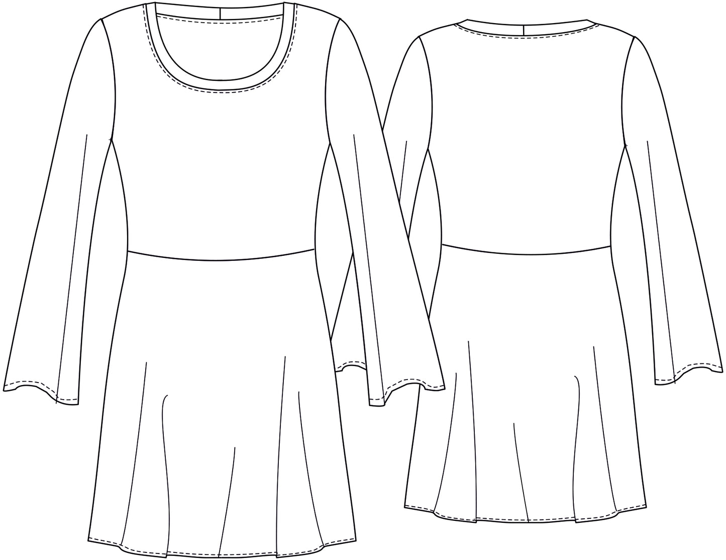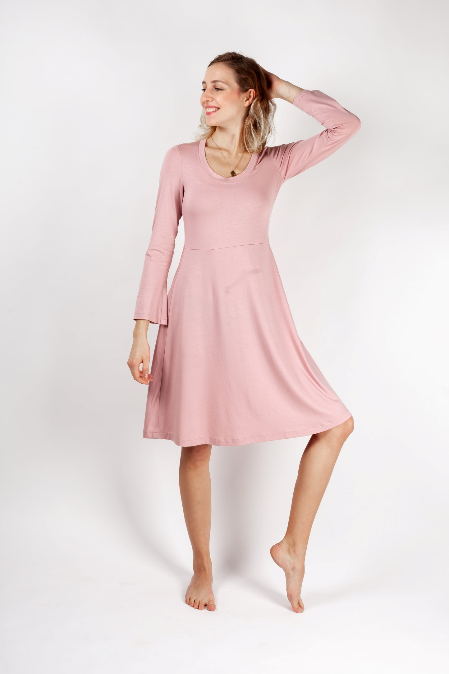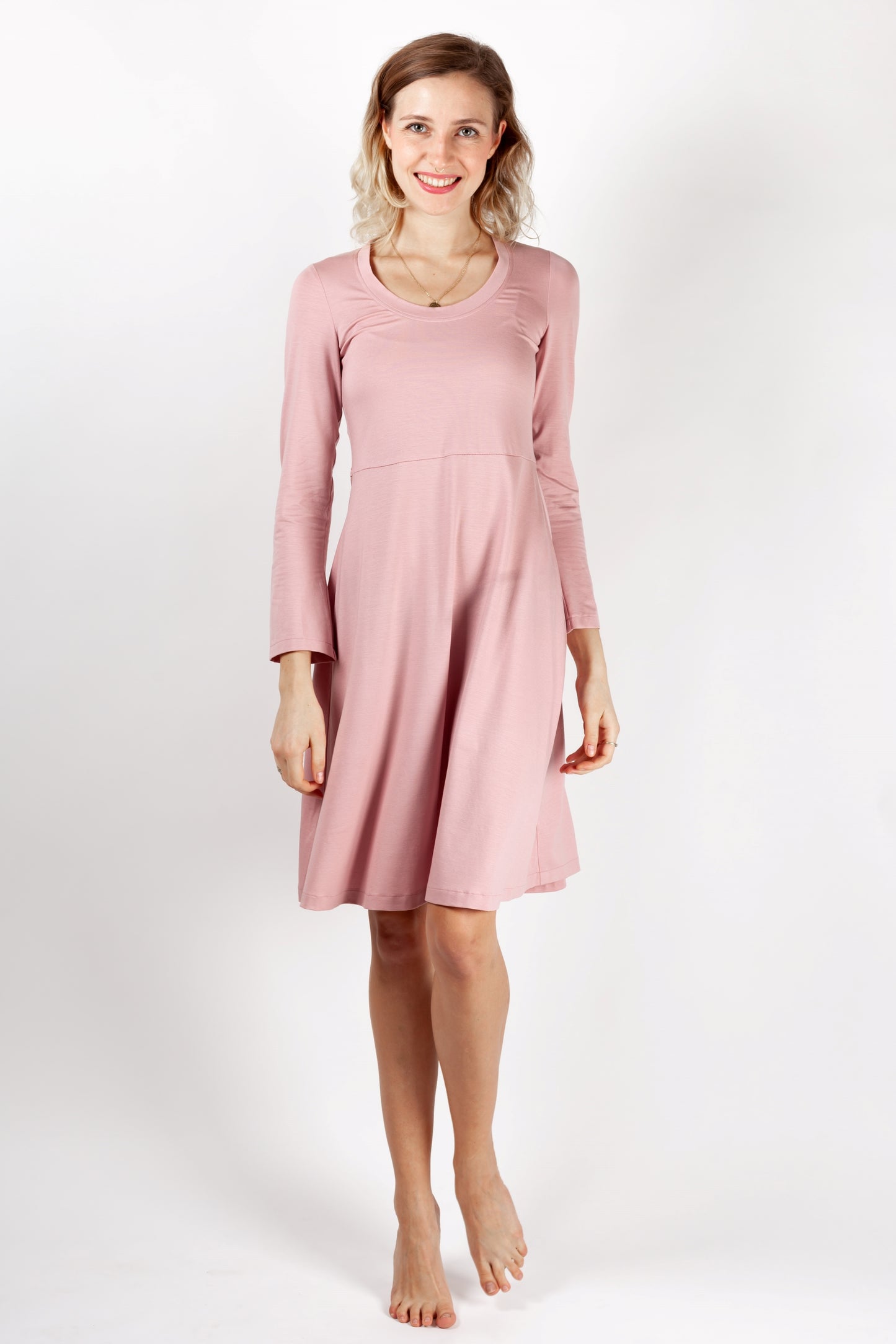 The Dalia nightgown is simple and easy to sew. The dress has a seam at the waist, the bodice has a large round neckline and a slightly flared swinging skirt. You can use a different color for the trim at the neckline, which gives a nice contrast. You can also wear Dalia in everyday life.