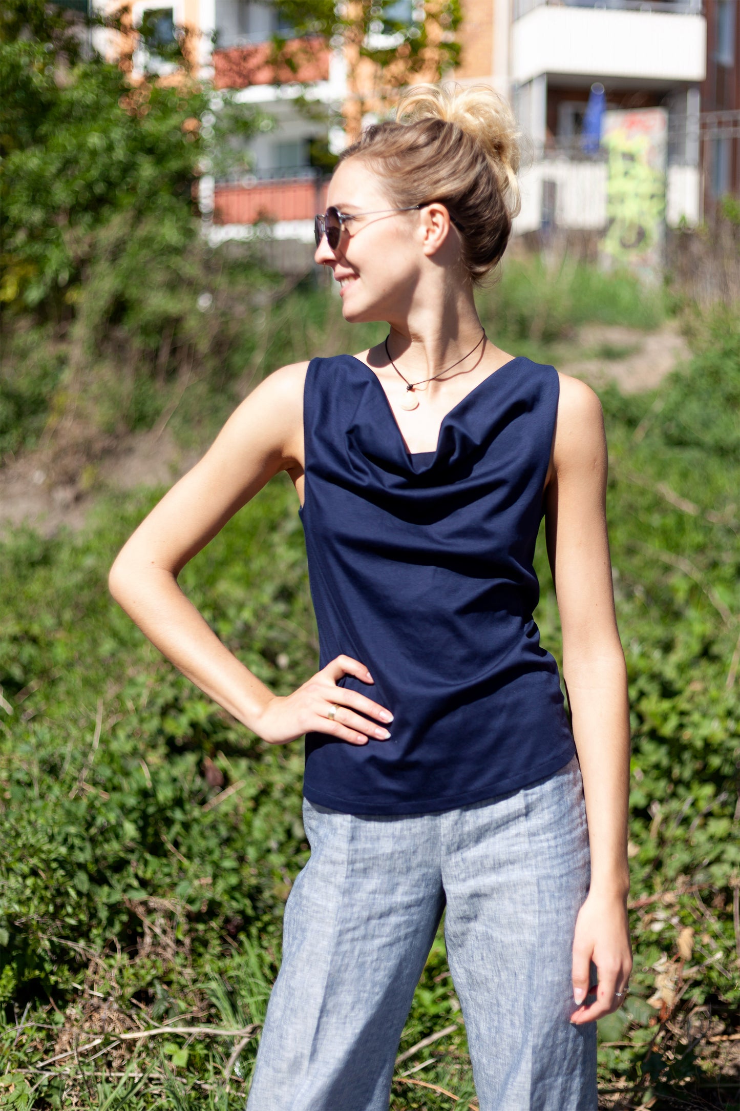 Das TShirt ist sehr schön, vor allem der Wasserfall-Kragen fällt perfekt. Das Armloch ist etwas weit. Ich habe es etwas kleiner geschnitten. Unbedingt wie beschrieben einen elastischen Stoff wählen, zumindest das Rückenteil sollte aus Jersey sein.