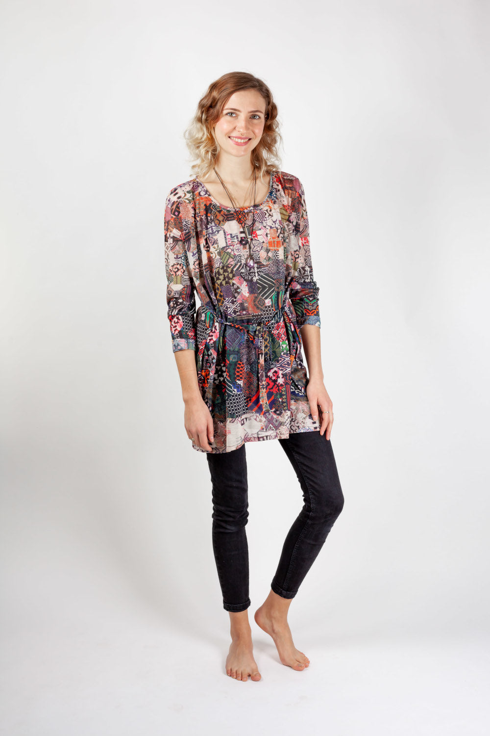 Die Tunika Karla ist eine lässige Longbluse: weit und sehr bequem. Für Nähanfänger sollte Karla kein Problem darstellen, da auch die Halslochversäuberung offenkantig verarbeitet wird. Mit den Bindebändern aus der Seitennaht kann die Weite gezügelt und sowohl vorne als auch hinten gebunden werden. Probiere einfach aus, was dir besser gefällt.