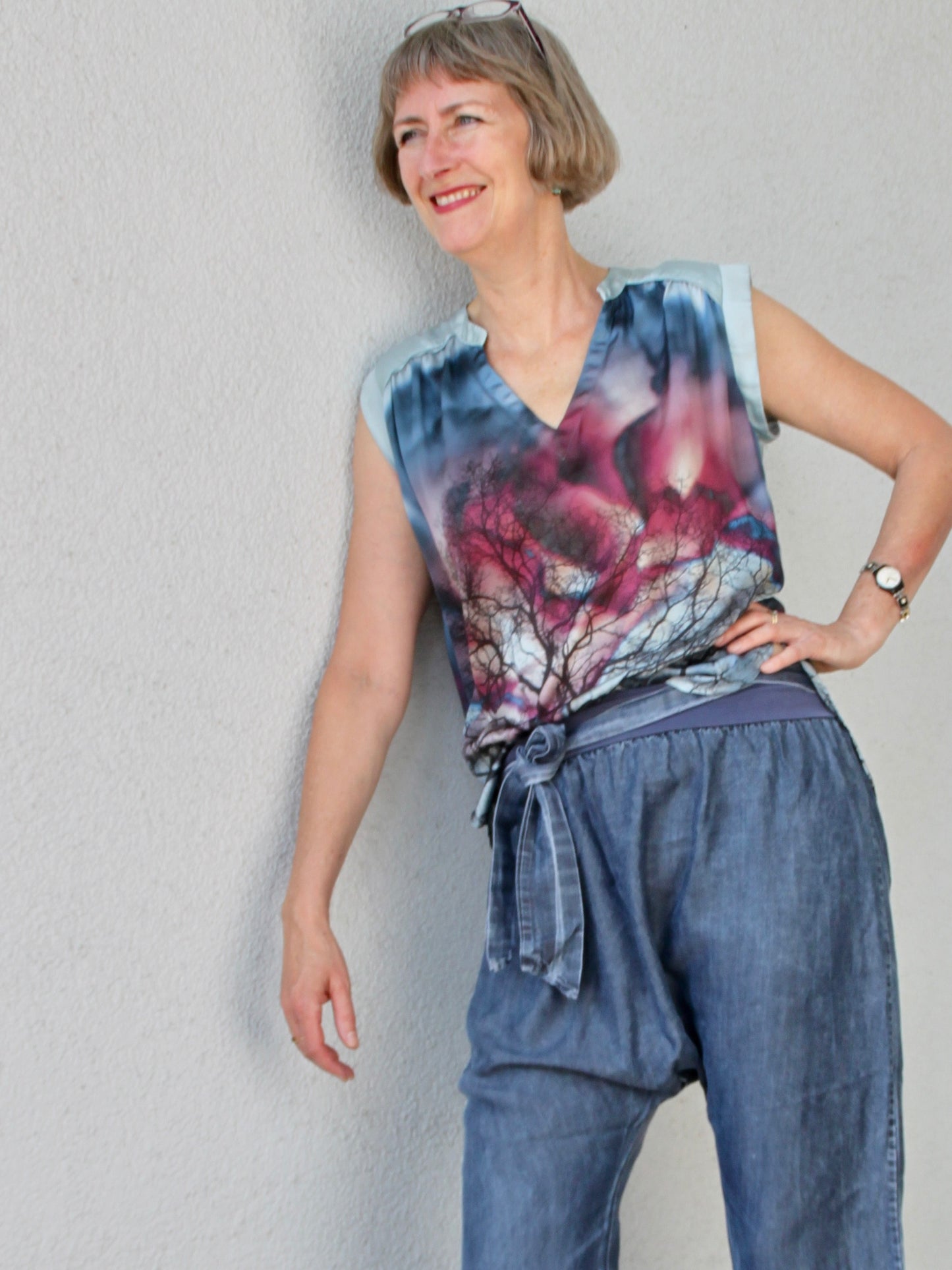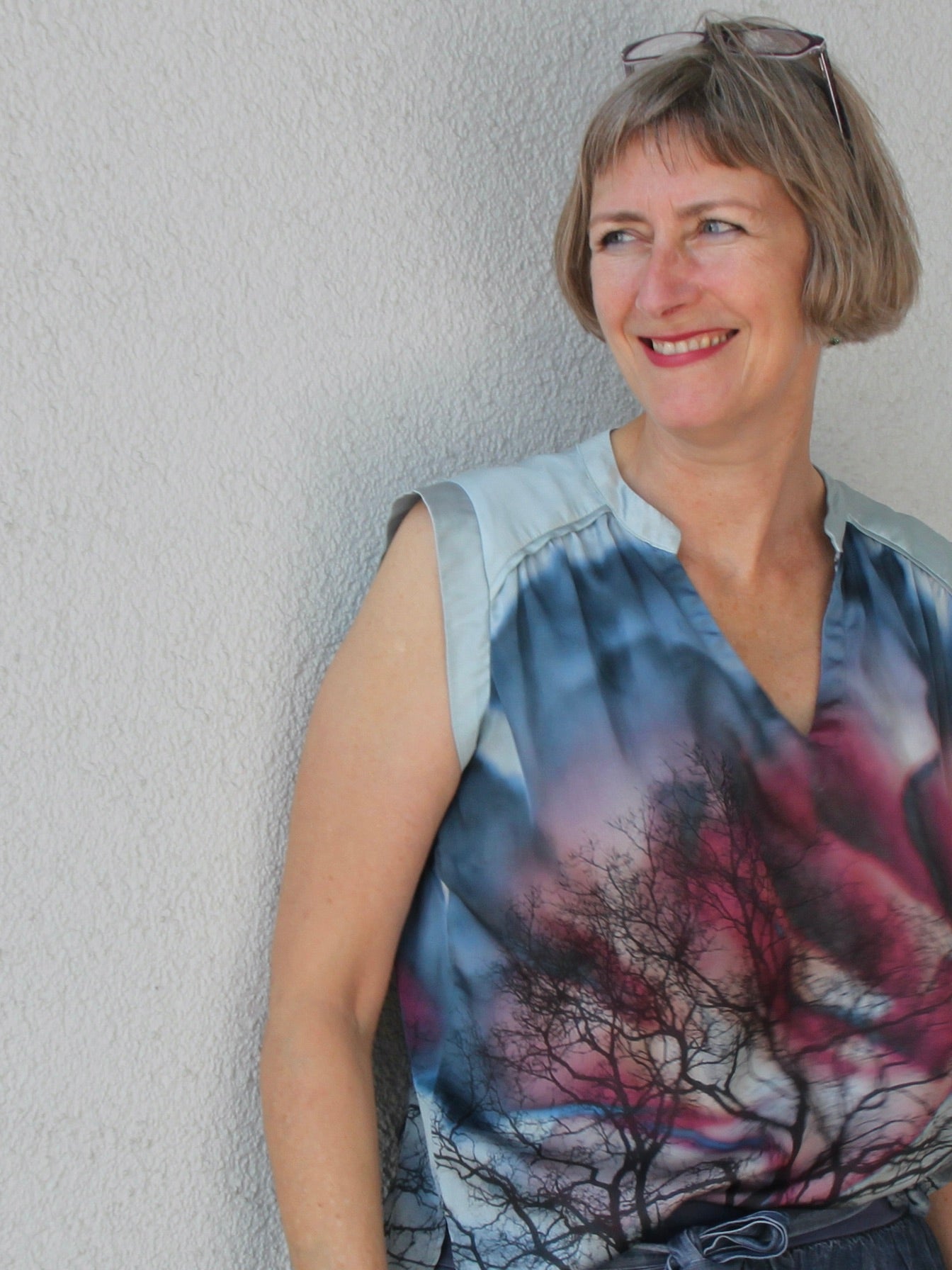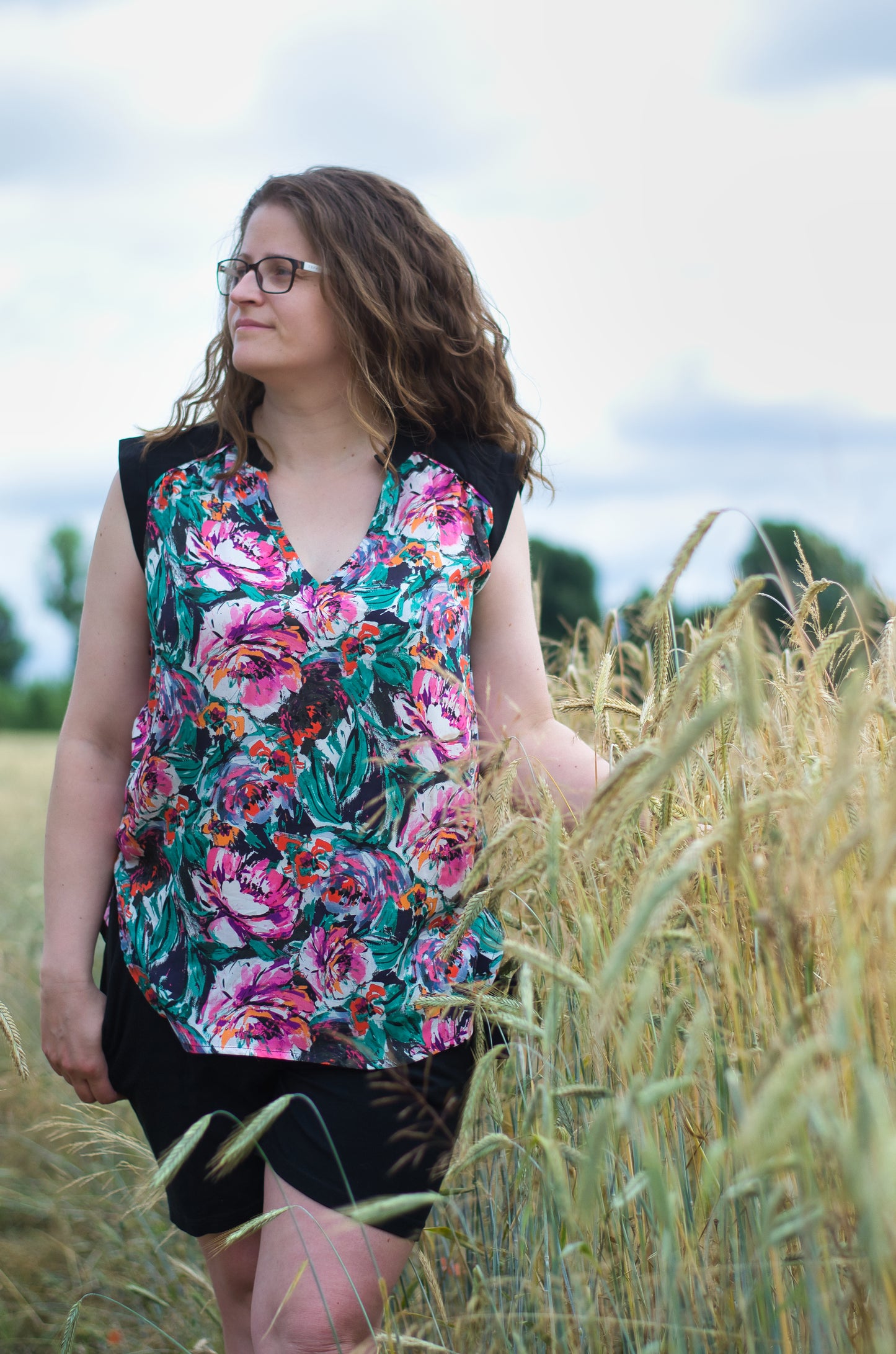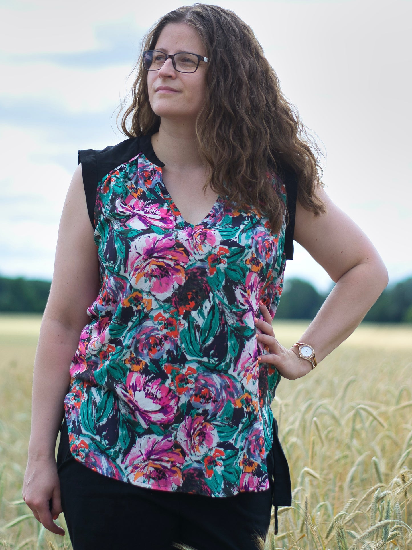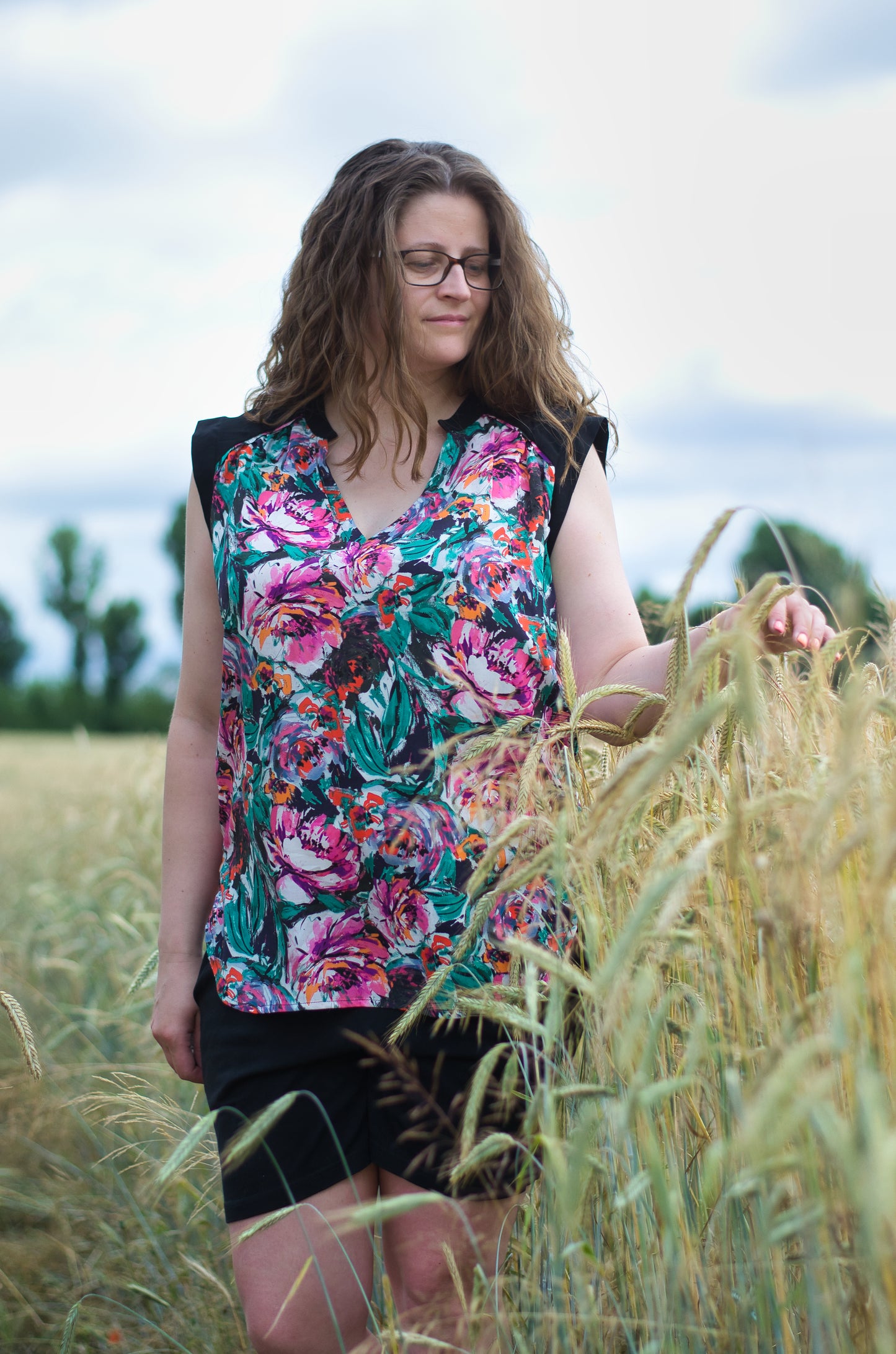 Lässige Blusen wie die Sommerbluse Ina, lassen sich prima zu Hosen und Röcken kombinieren. Der schöne V-Ausschnitt, die Ärmelblenden und der kleine Stehkragen sind die besonderen Details. Ina kannst du wunderbar im Materialmix nähen, am besten einen Druck gemixt mit einem uni Stoff. Durch die angenehme Weite engt die Bluse nirgends ein und ist so ideal für warme Sommertage. Ina kann aber auch mit einer lässigen Strickjacke kombiniert werden und wird so zum Allroundschnitt.