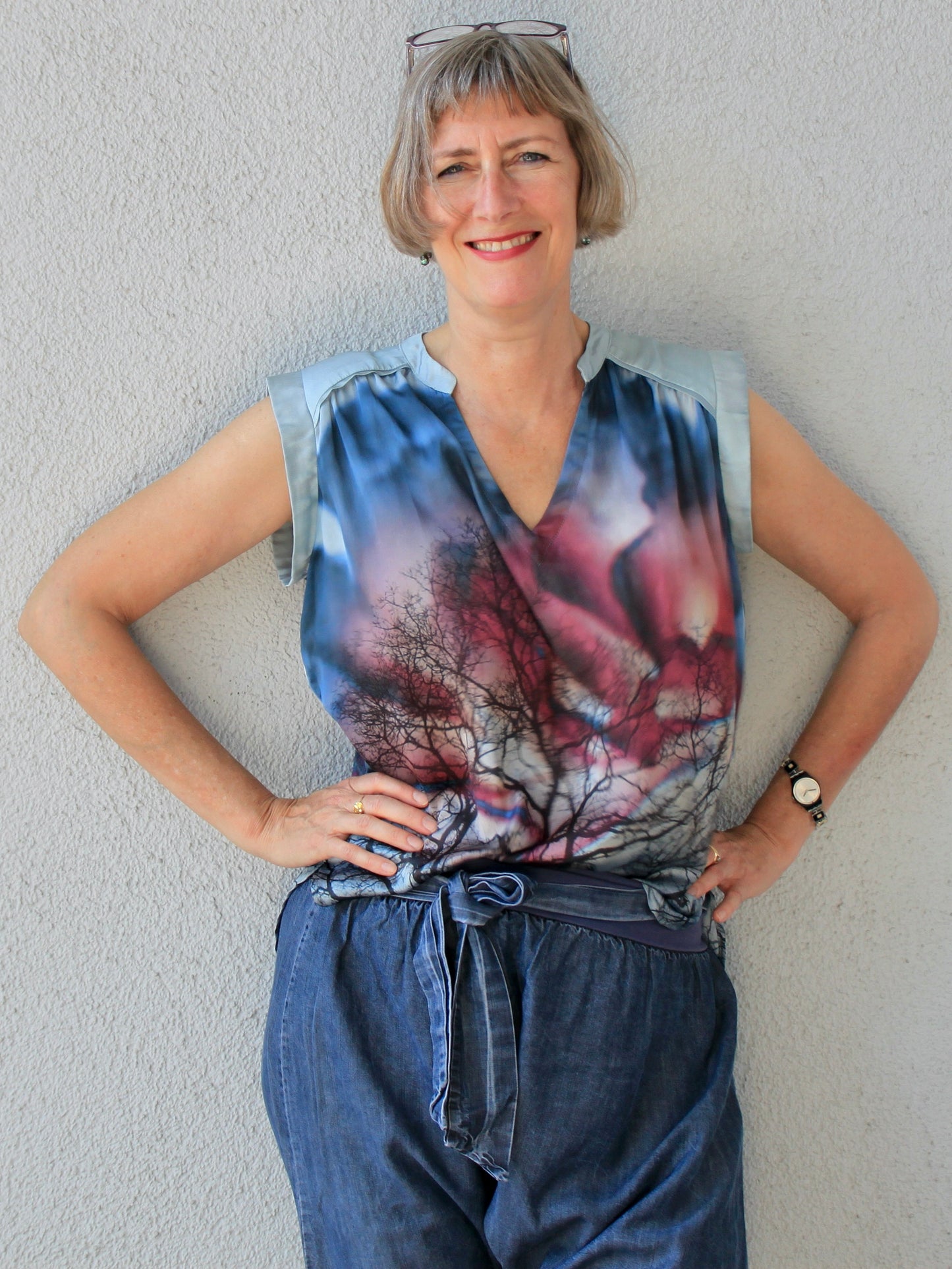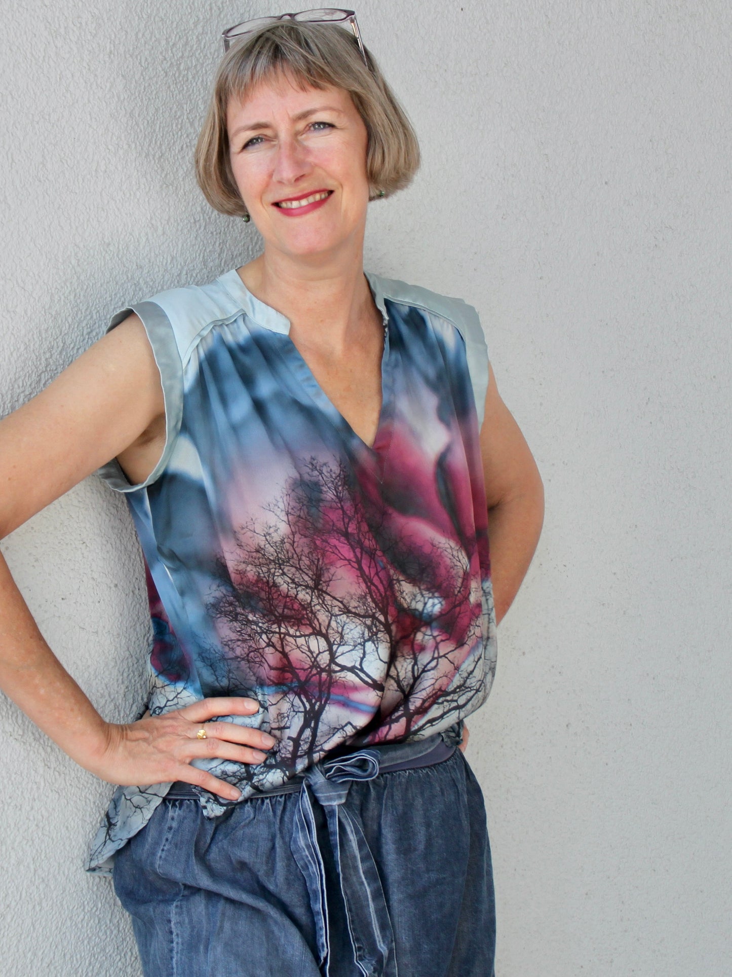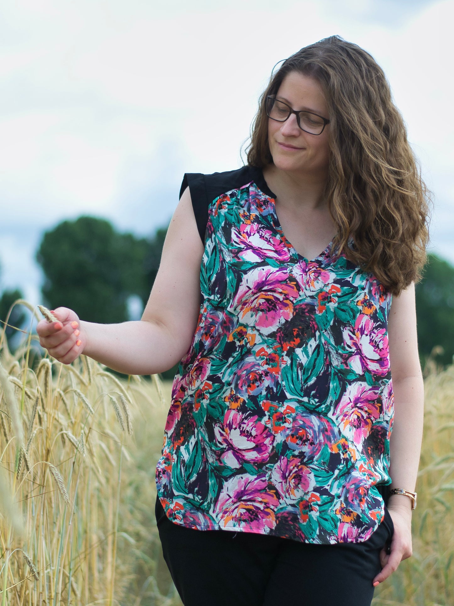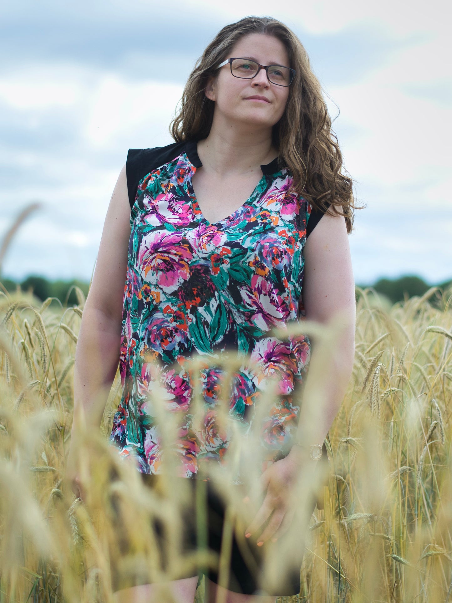 Lässige Blusen wie die Sommerbluse Ina, lassen sich prima zu Hosen und Röcken kombinieren. Der schöne V-Ausschnitt, die Ärmelblenden und der kleine Stehkragen sind die besonderen Details. Ina kannst du wunderbar im Materialmix nähen, am besten einen Druck gemixt mit einem uni Stoff. Durch die angenehme Weite engt die Bluse nirgends ein und ist so ideal für warme Sommertage. Ina kann aber auch mit einer lässigen Strickjacke kombiniert werden und wird so zum Allroundschnitt.