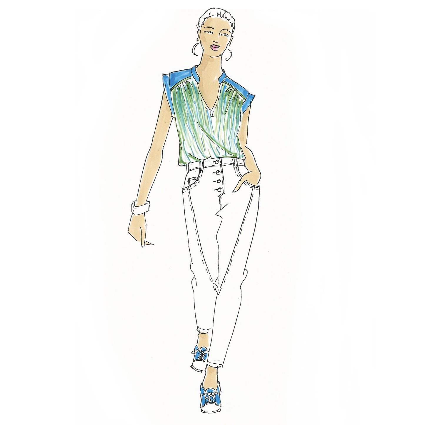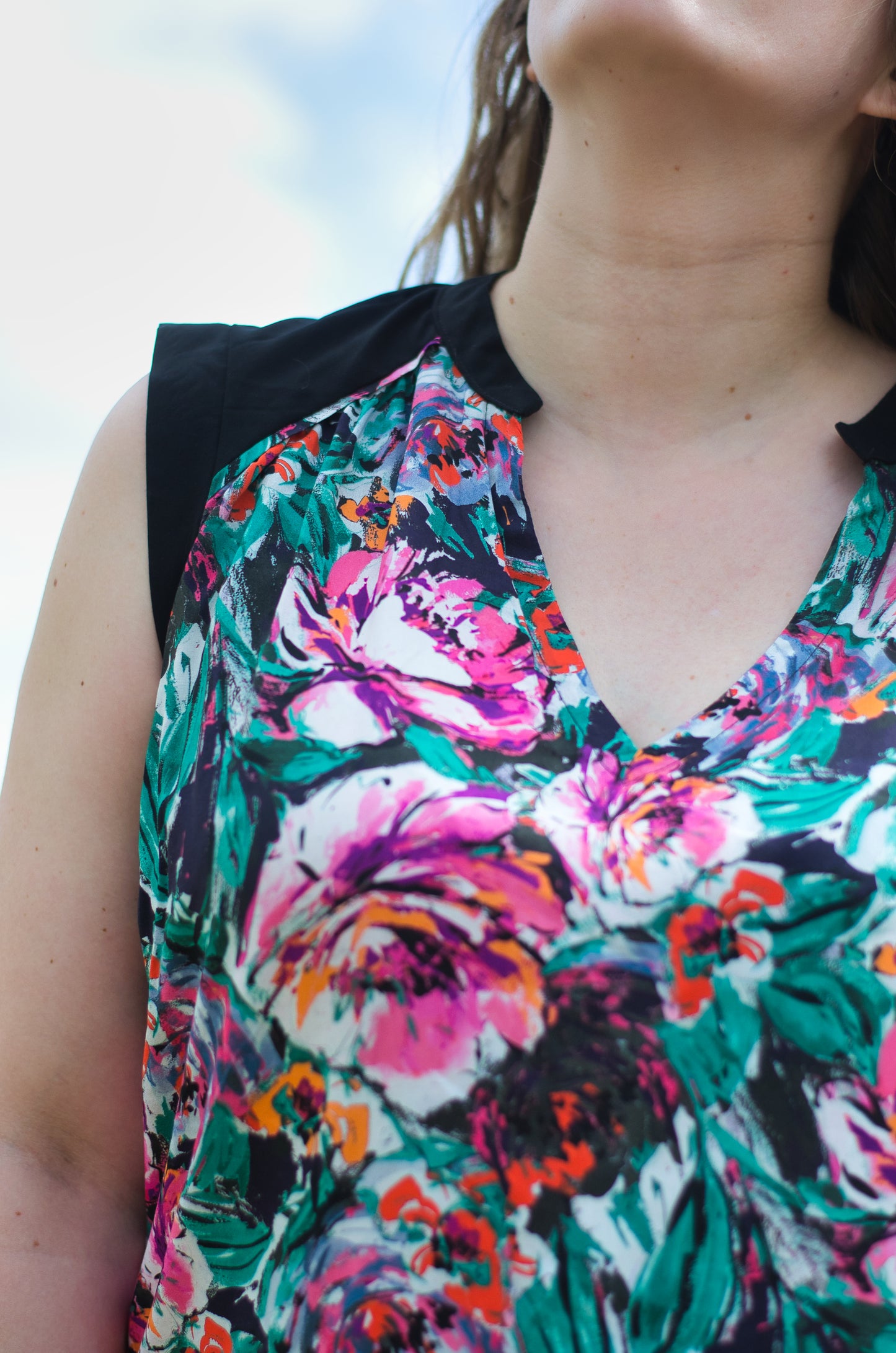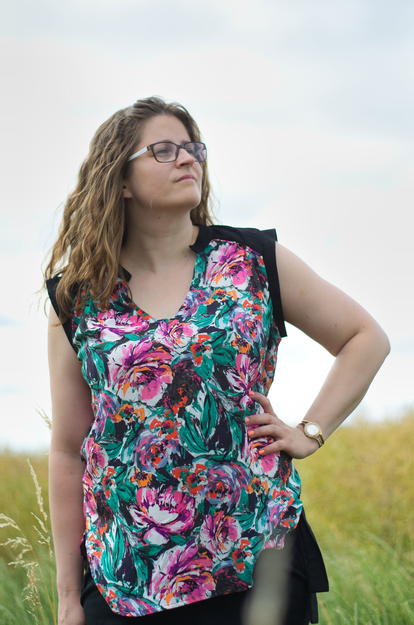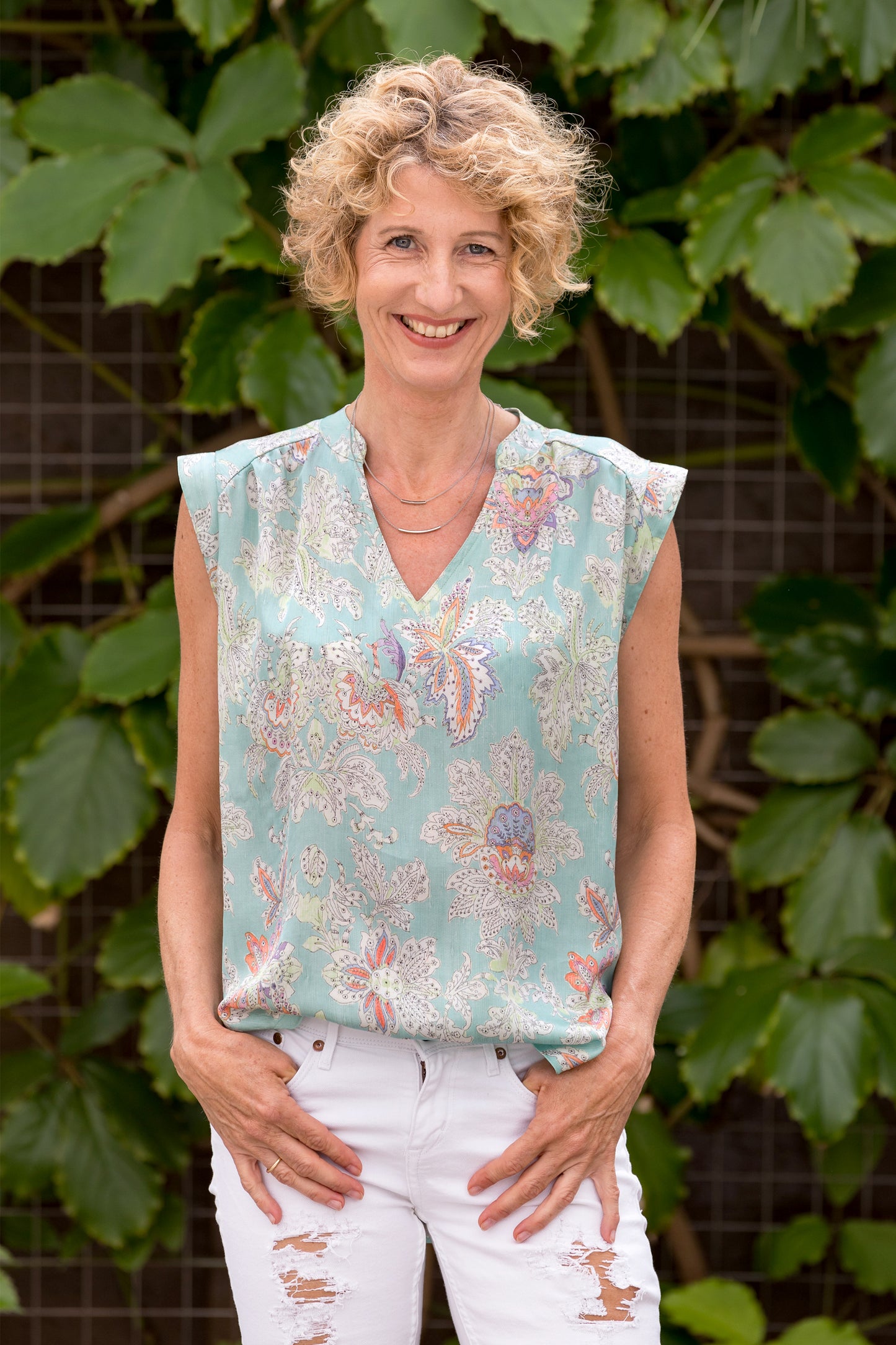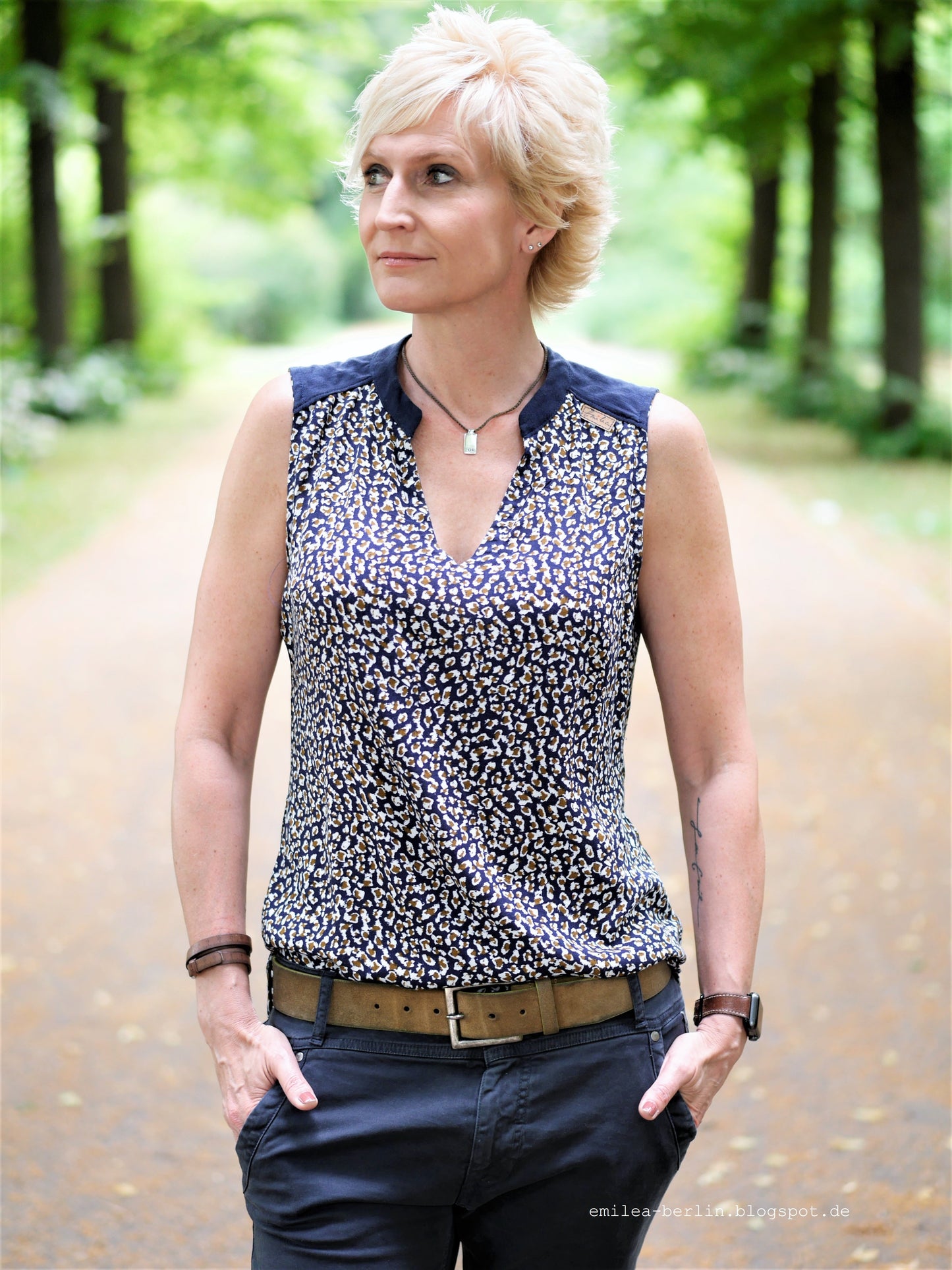 Lässige Blusen wie die Sommerbluse Ina, lassen sich prima zu Hosen und Röcken kombinieren. Der schöne V-Ausschnitt, die Ärmelblenden und der kleine Stehkragen sind die besonderen Details. Ina kannst du wunderbar im Materialmix nähen, am besten einen Druck gemixt mit einem uni Stoff. Durch die angenehme Weite engt die Bluse nirgends ein und ist so ideal für warme Sommertage. Ina kann aber auch mit einer lässigen Strickjacke kombiniert werden und wird so zum Allroundschnitt.