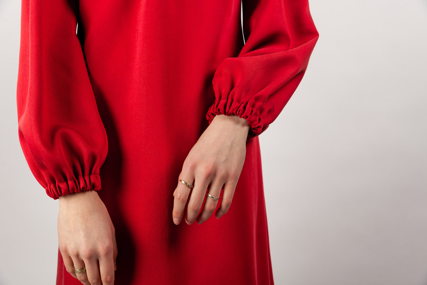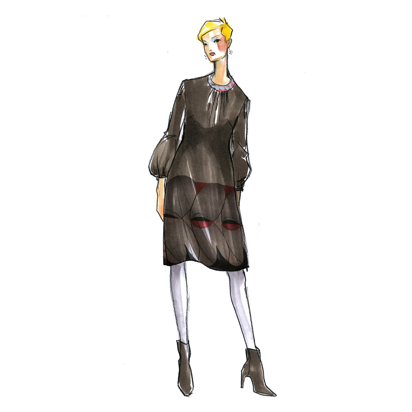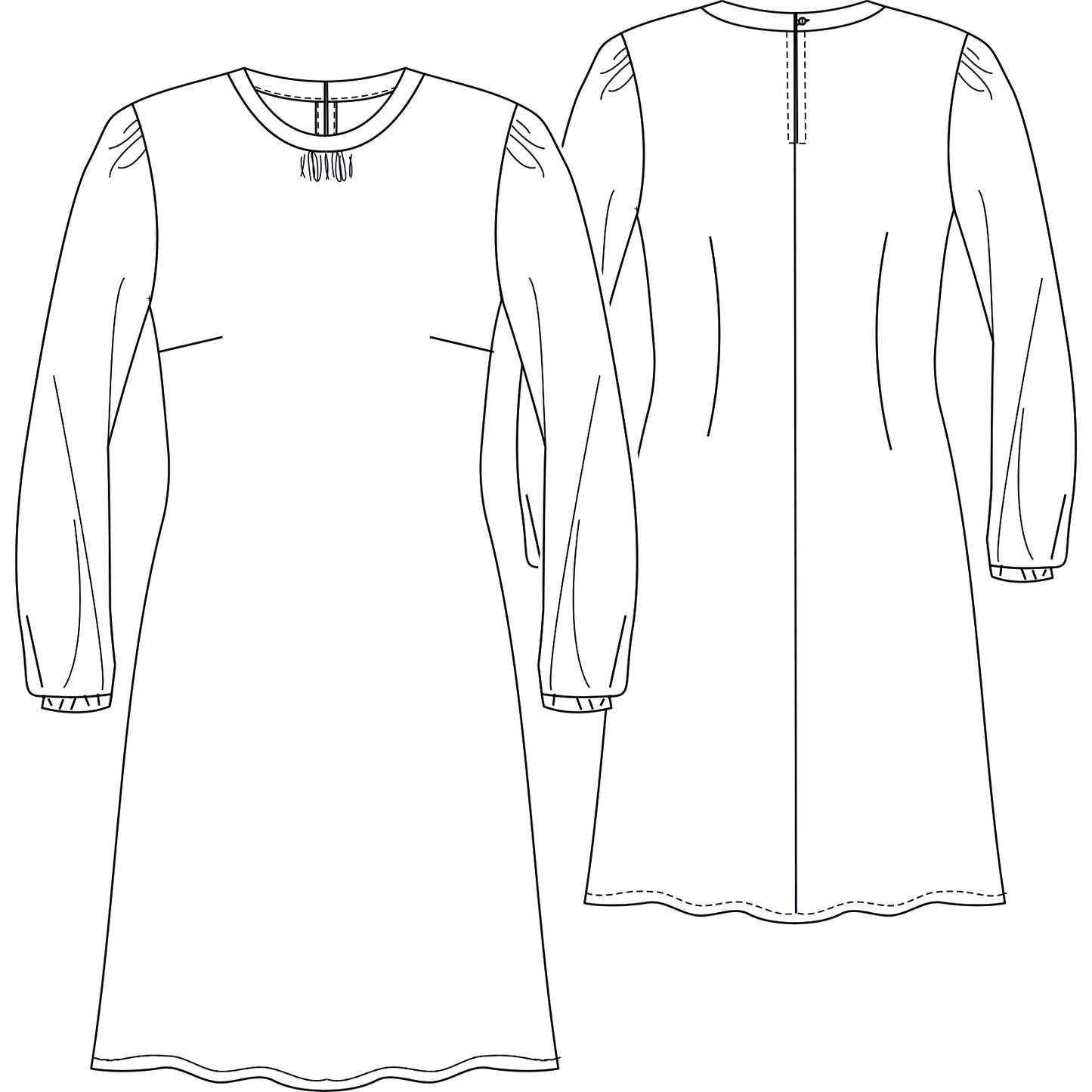 Wir empfehlen dir eine Viskose, dünne Wolle oder Tencel, der Stoff sollte blickdicht sein, da das Kleid ungefüttert ist.
