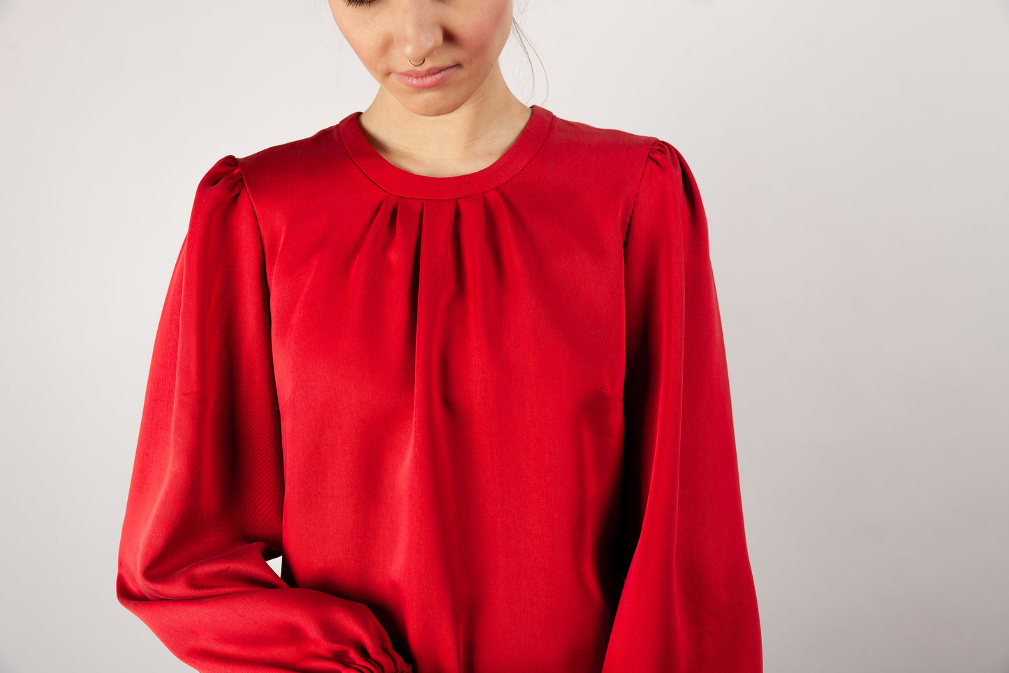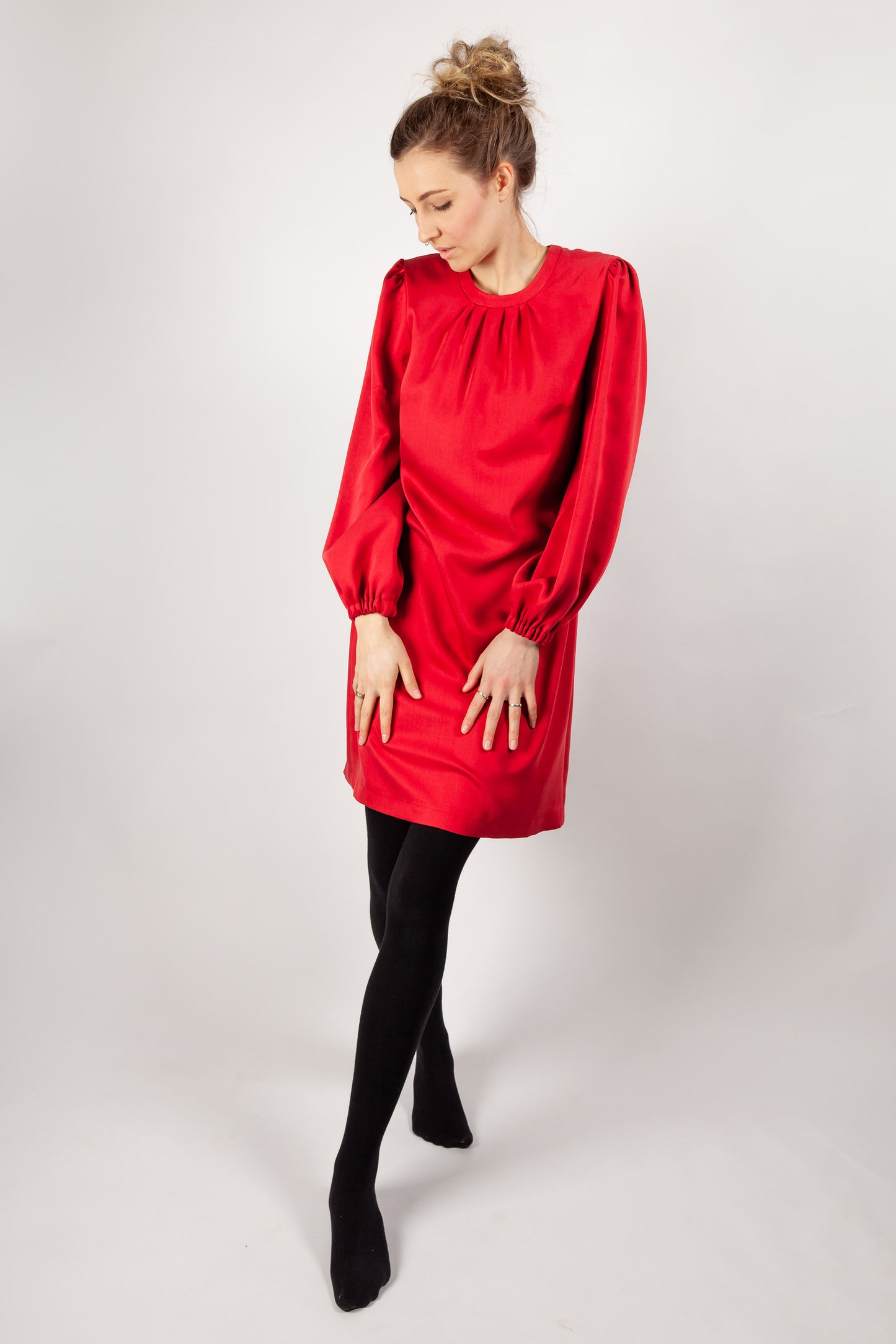 Das Kleid Lena kannst Du je nach Stoffwahl als Alltagskleid oder zu besonderen Anlässen tragen. Die Frontfalten am Ausschnitt laufen über die komplette Länge aus und geben dem Kleid seine luftige Weite. Die leichte Taillierung, die Blende am Halsloch und die weiten Ärmel geben Lena einen sehr femininen Touch.