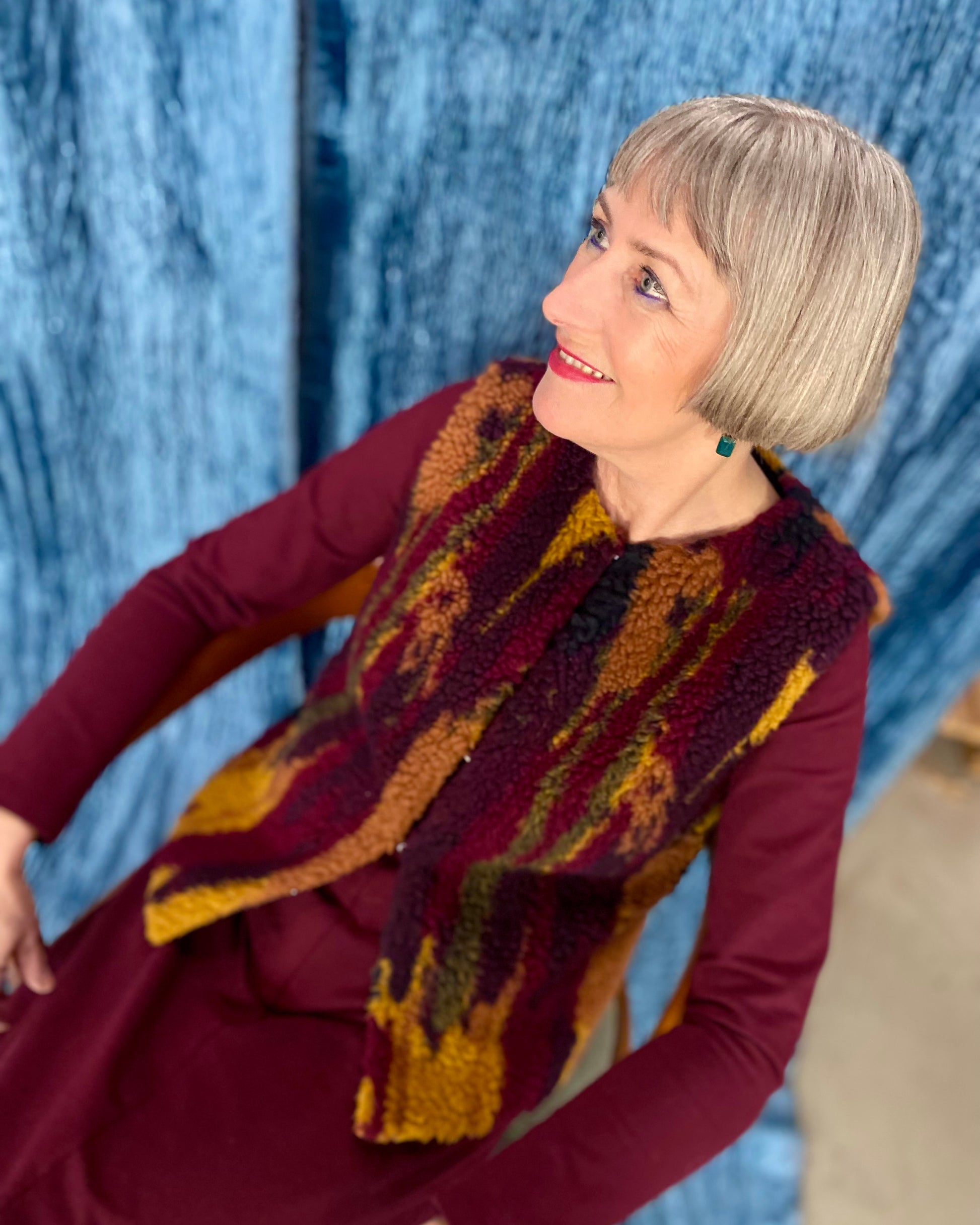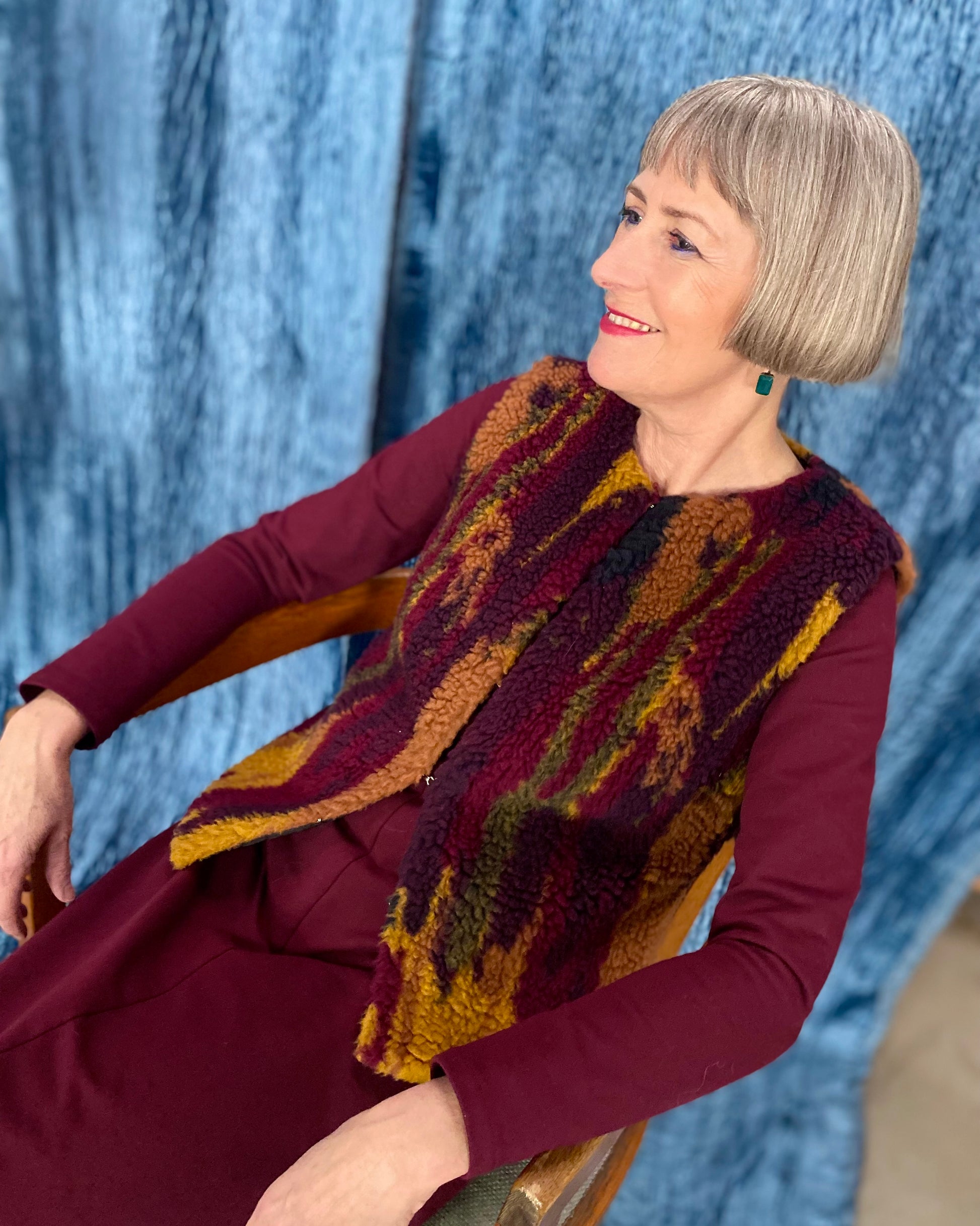Ich habe den Schnitt abgewandelt und die Weste aus Teddyplüsch ohne Futter, mit einem Stehkragen und einem eingefassten Reißverschluss genäht.