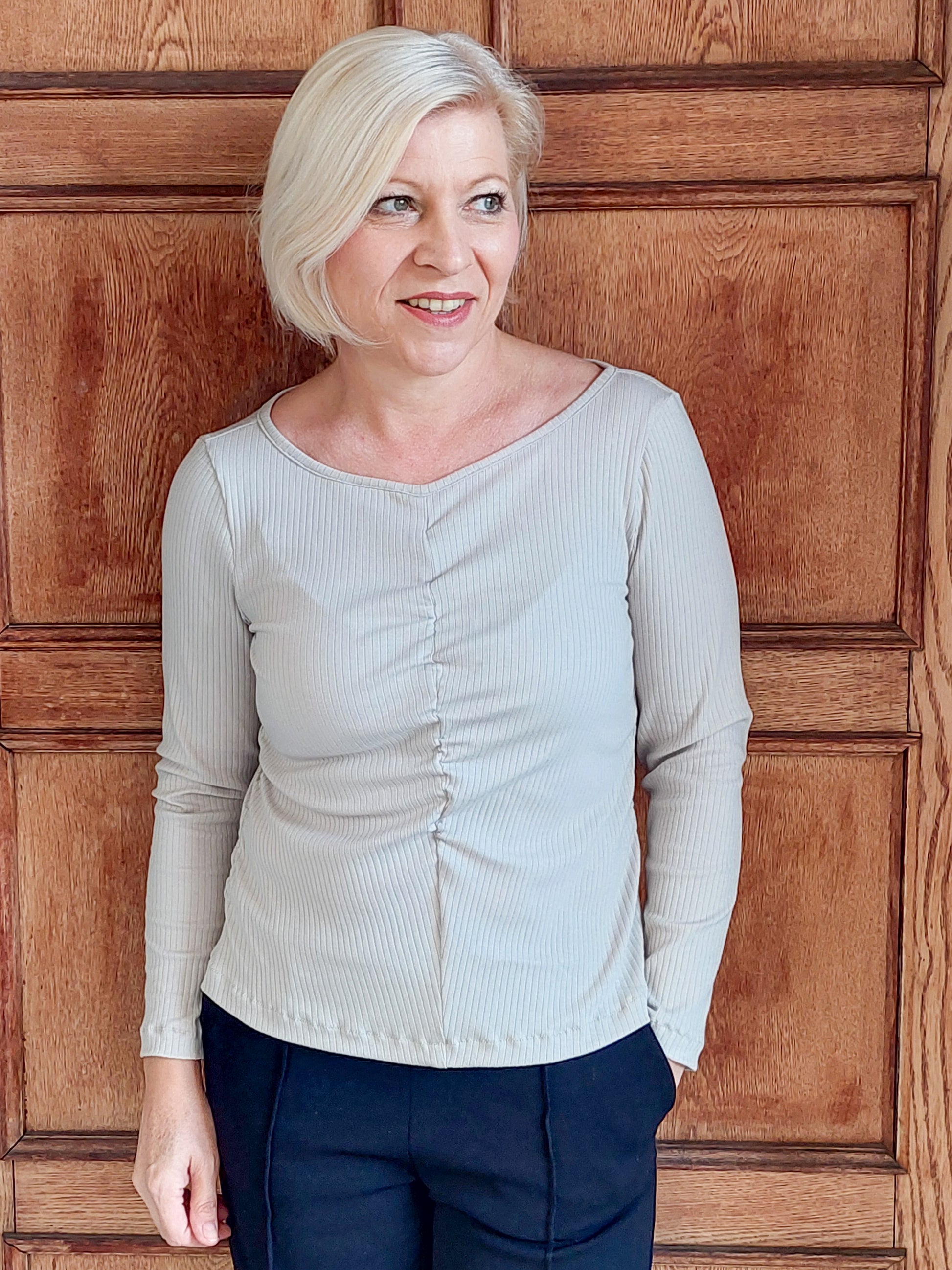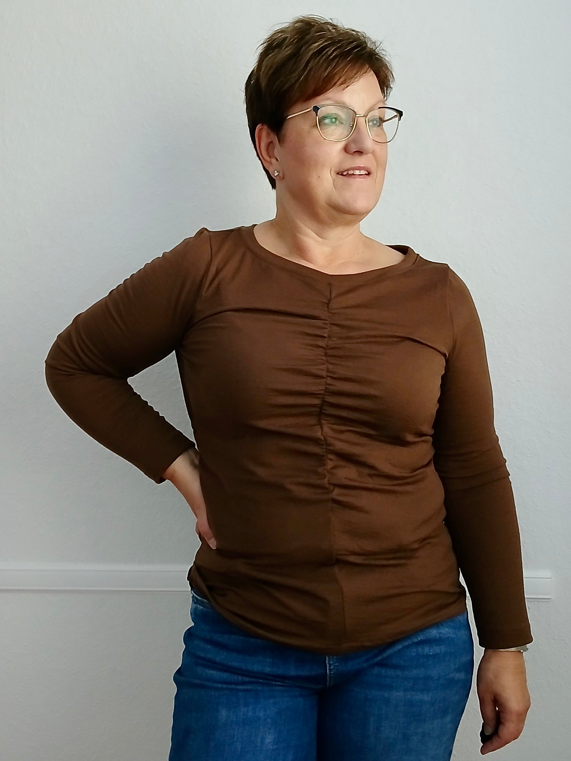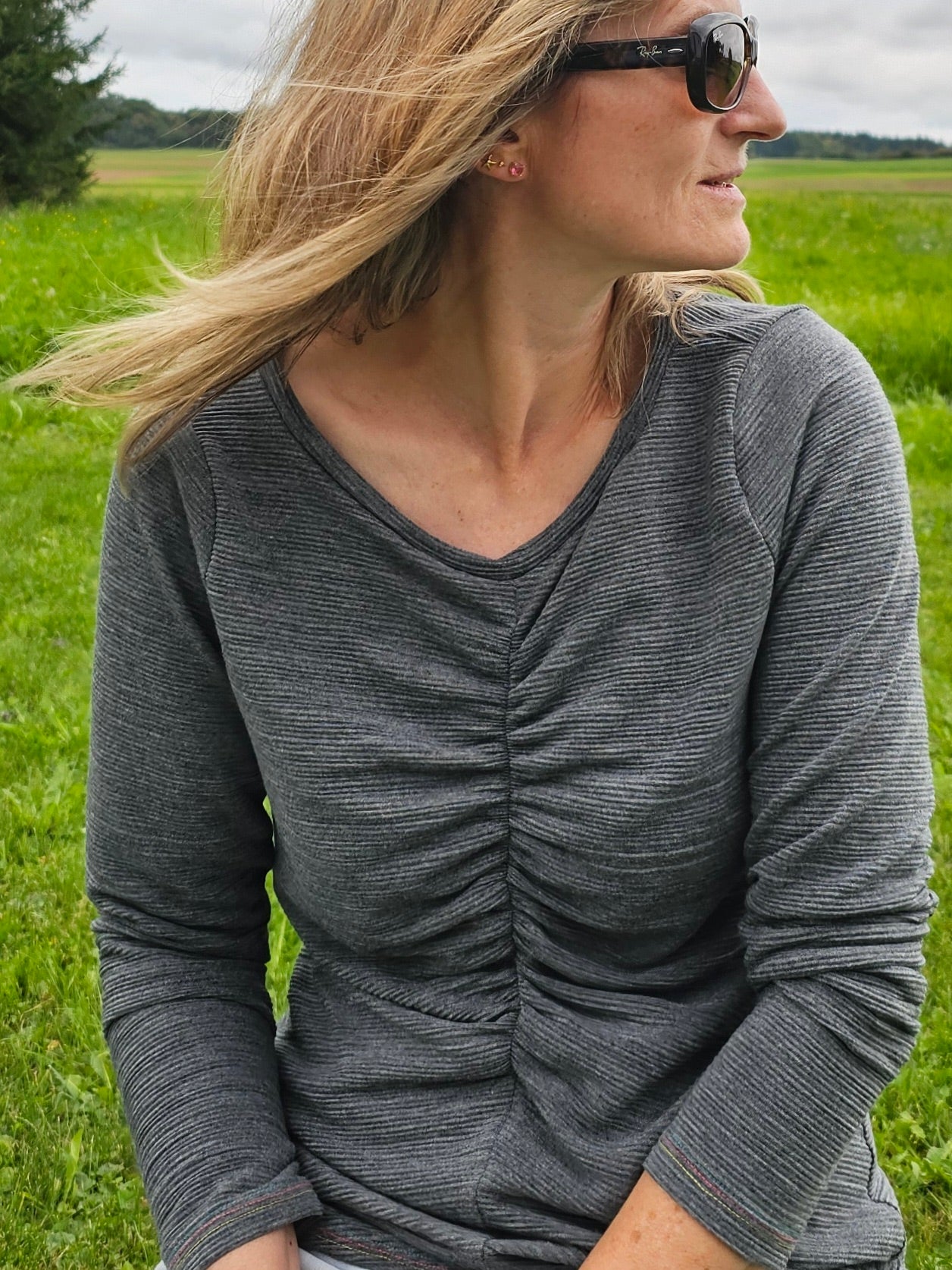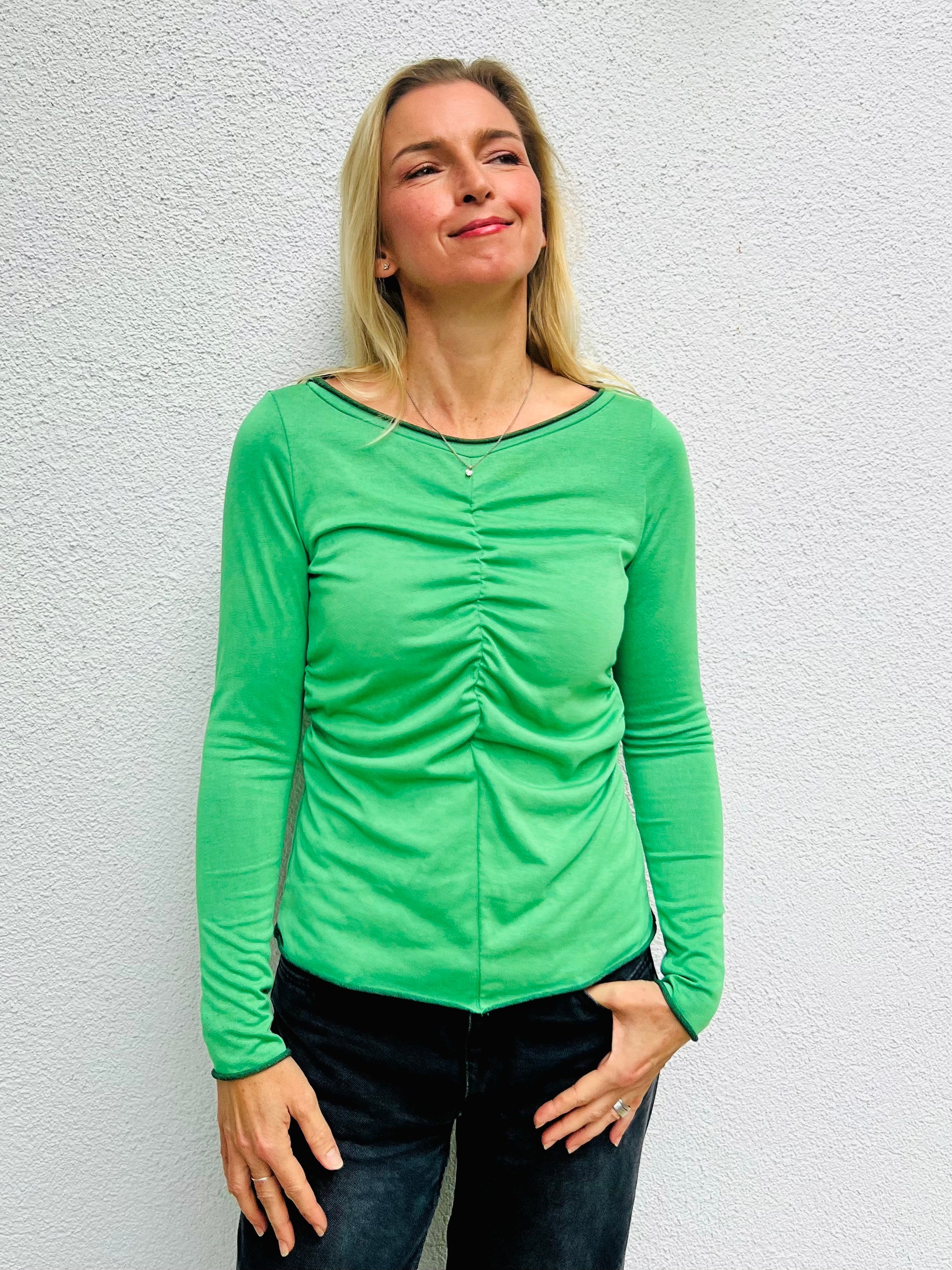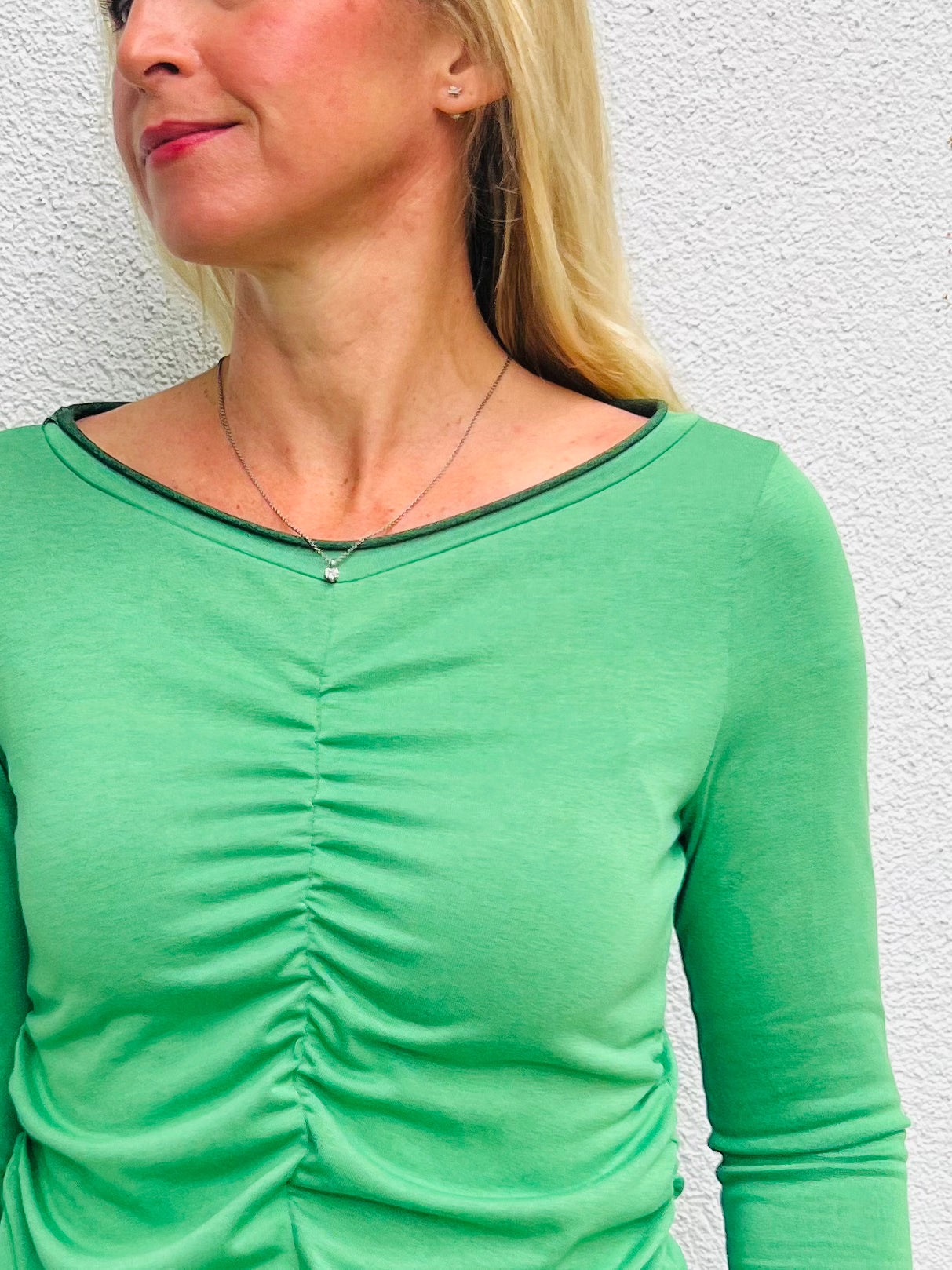Die Teilungsnaht in der vorderen Mitte sorgt für einen spannenden Look und wird lässig eingekraust, was dem Shirt eine extra Portion Coolness und Bewegung schenkt. Diese zarten Raffungen vorne und an den Seiten entstehen durch eingesteppte Gummis und zaubern wunderschöne Falten ins Vorderteil – feminin, aber nicht verspielt, edgy, aber nicht übertrieben.