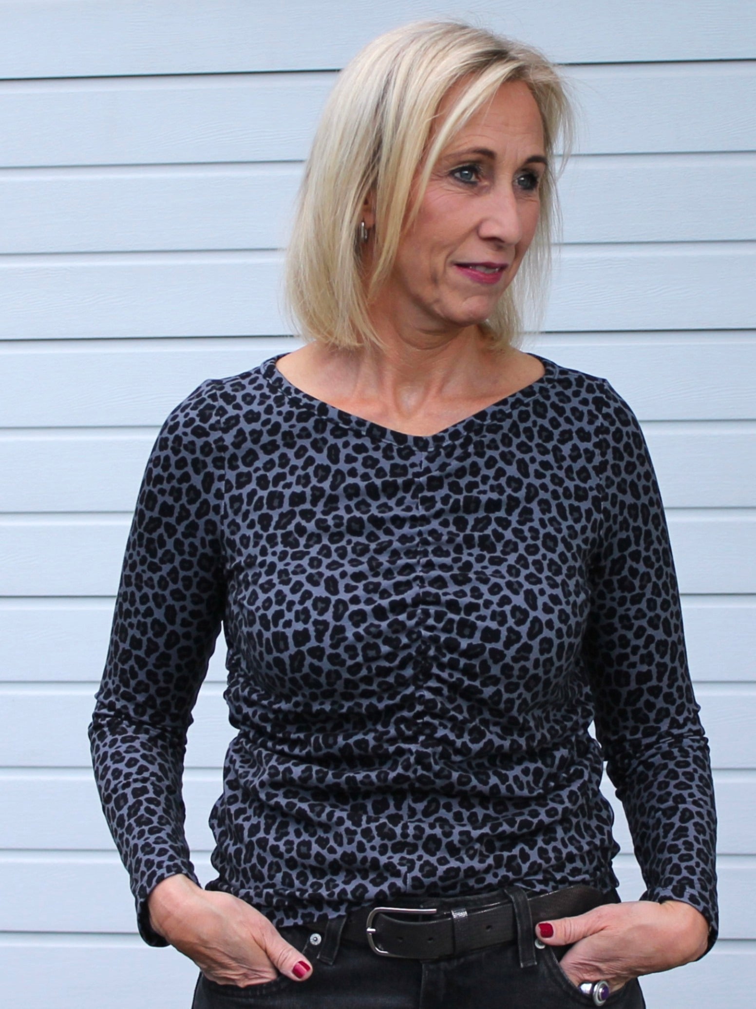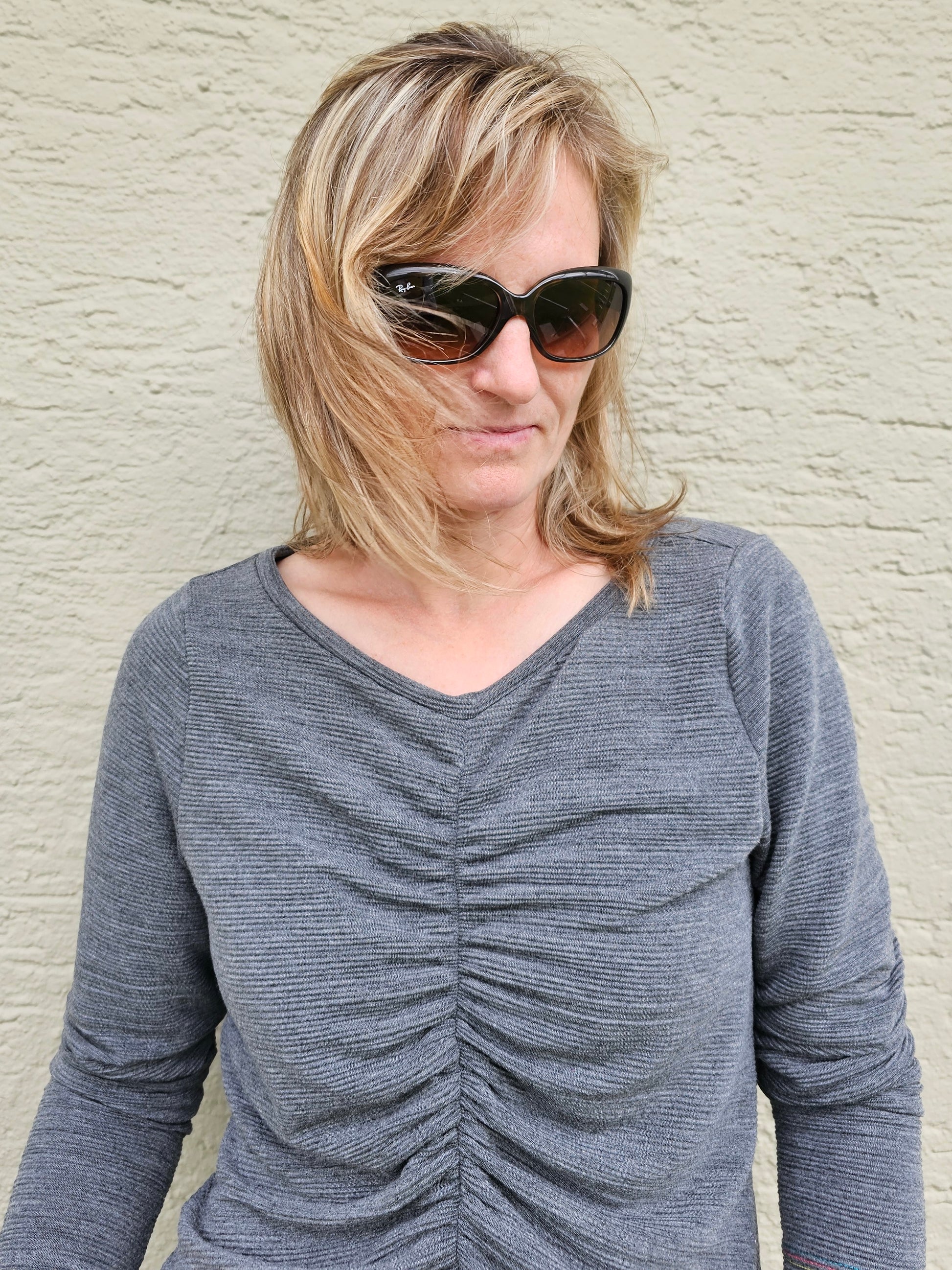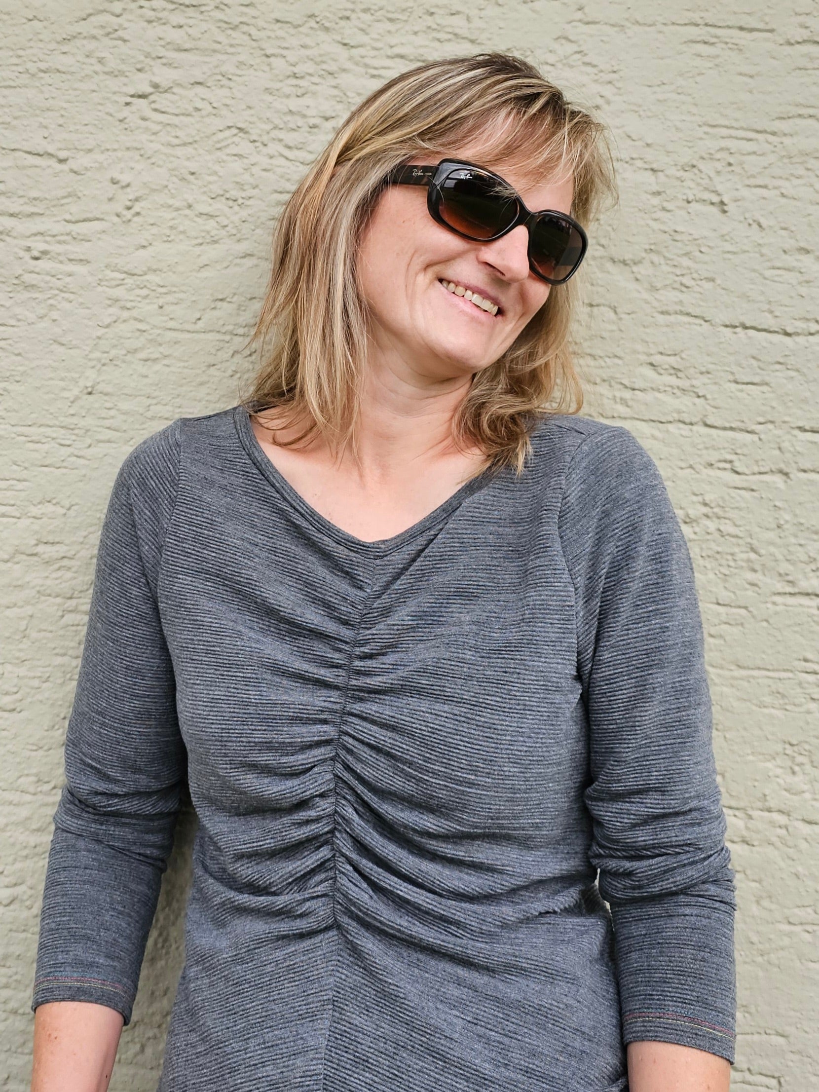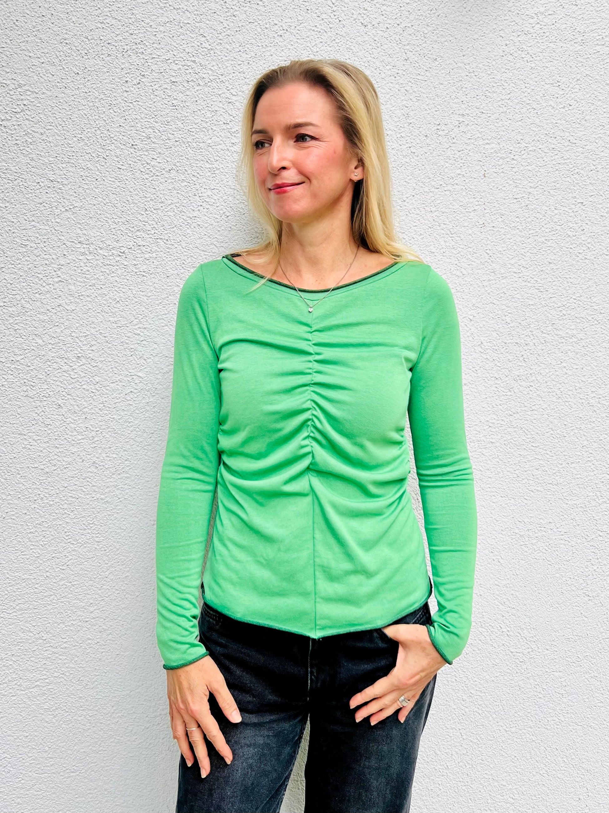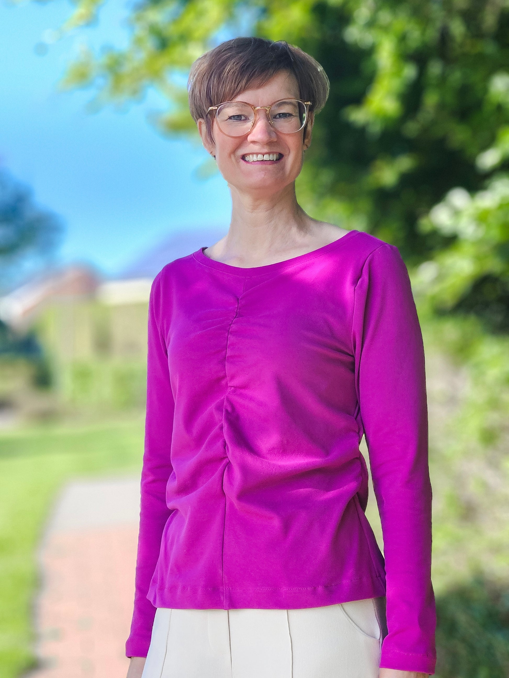 Die Teilungsnaht in der vorderen Mitte sorgt für einen spannenden Look und wird lässig eingekraust, was dem Shirt eine extra Portion Coolness und Bewegung schenkt. Diese zarten Raffungen vorne und an den Seiten entstehen durch eingesteppte Gummis und zaubern wunderschöne Falten ins Vorderteil – feminin, aber nicht verspielt, edgy, aber nicht übertrieben.