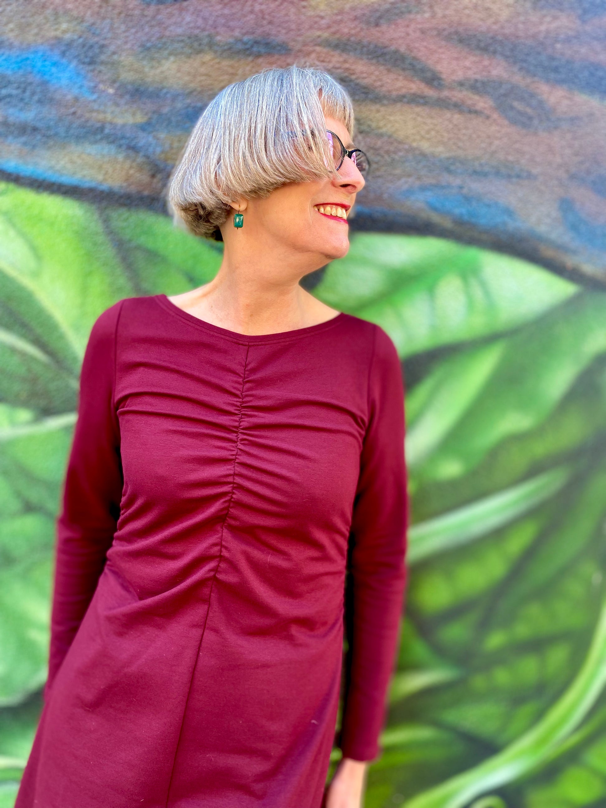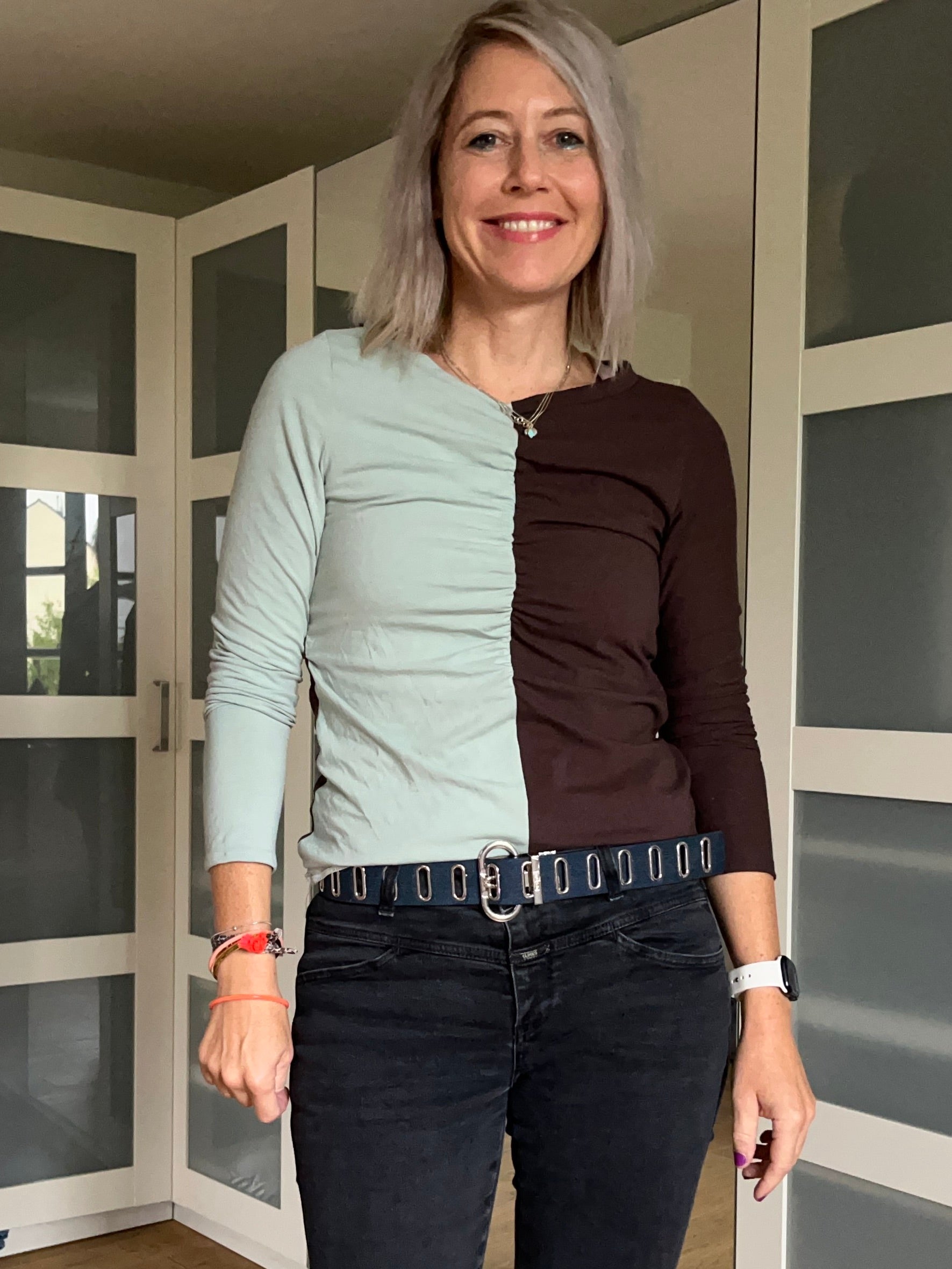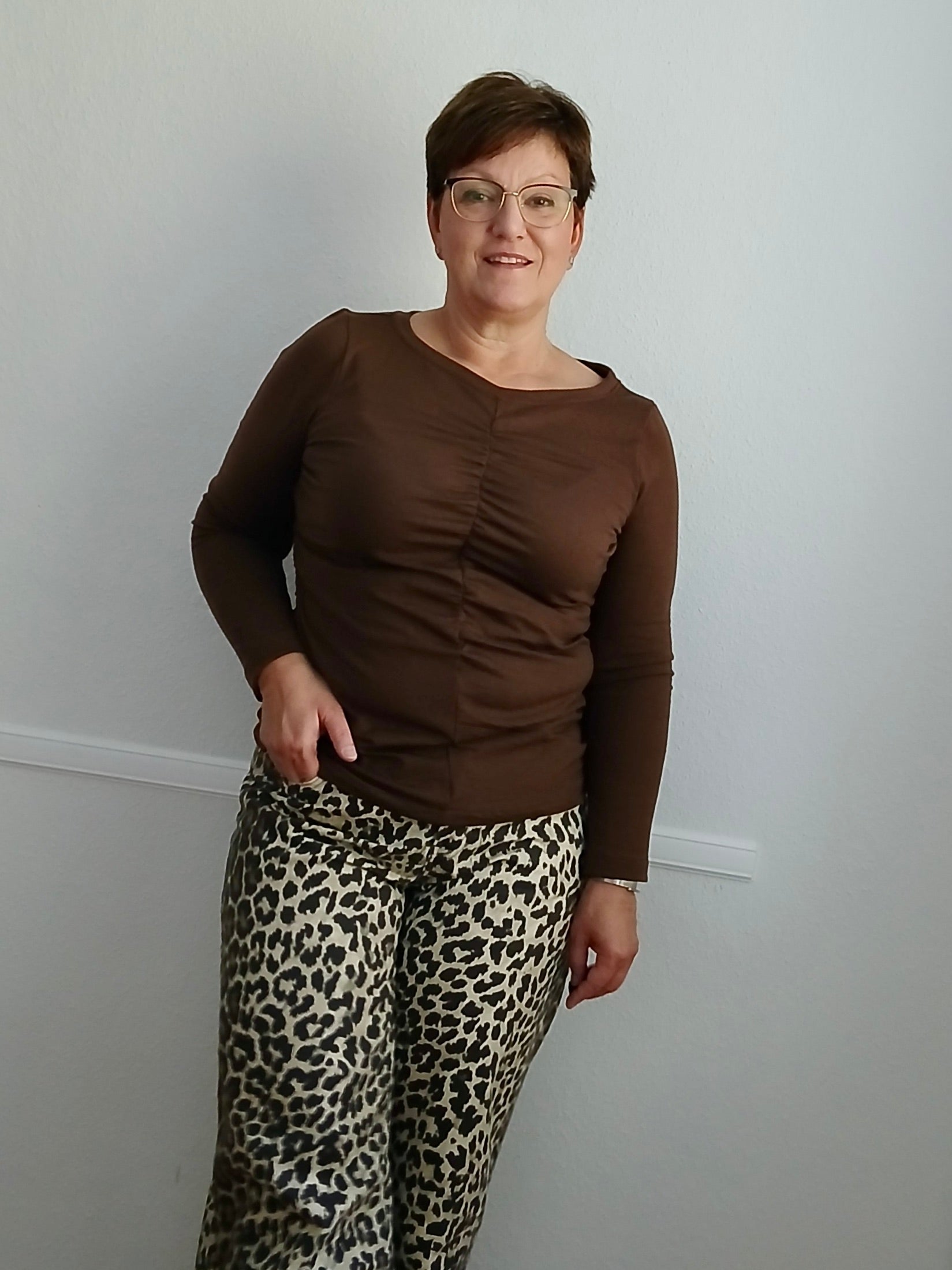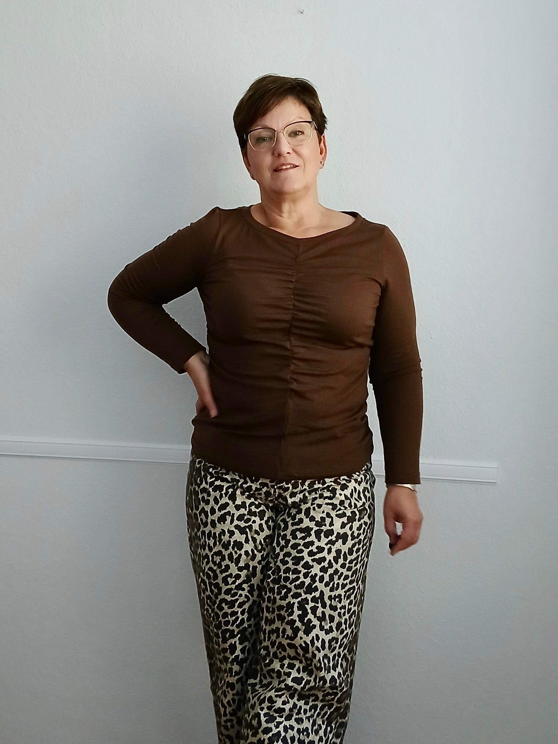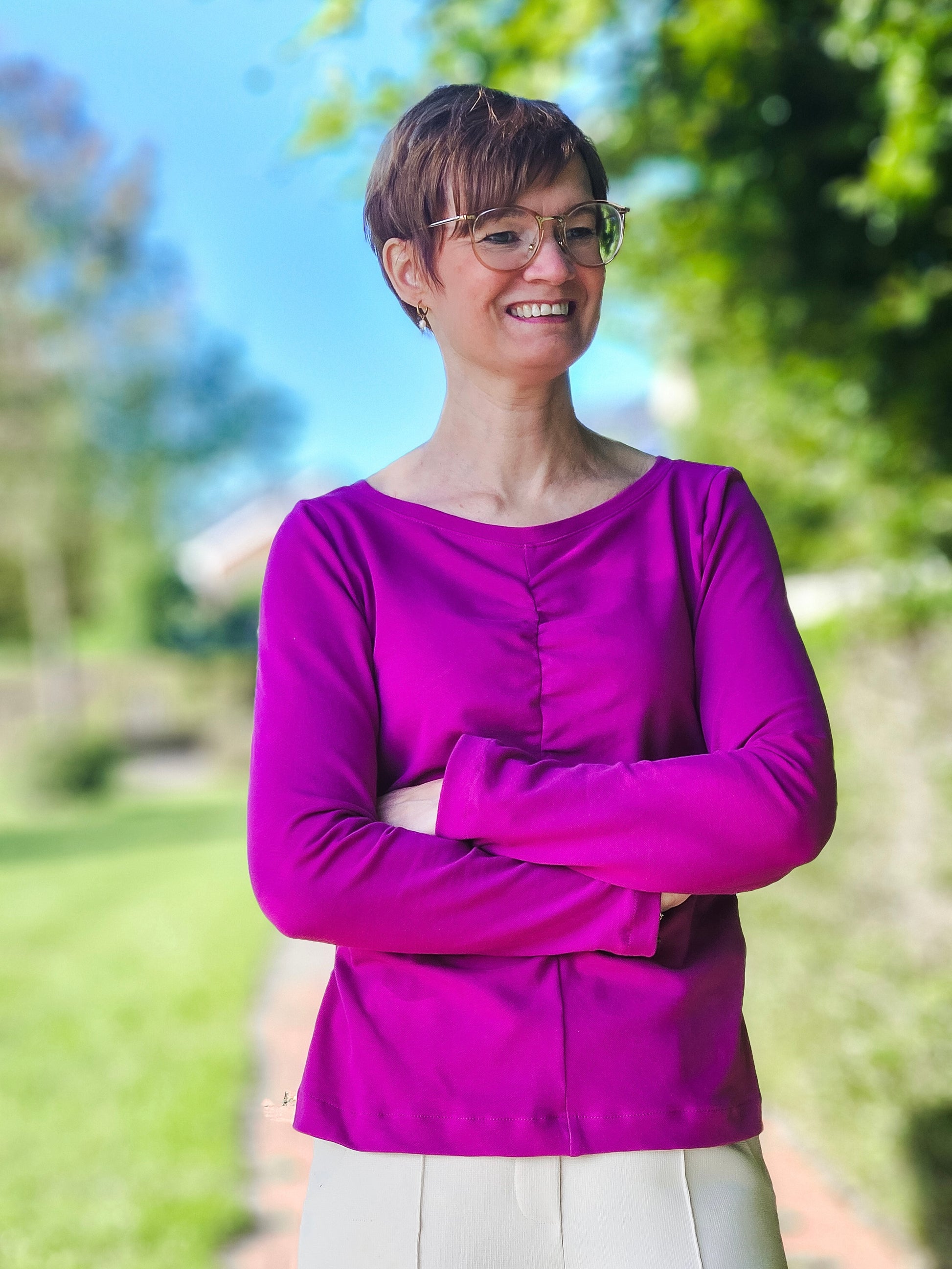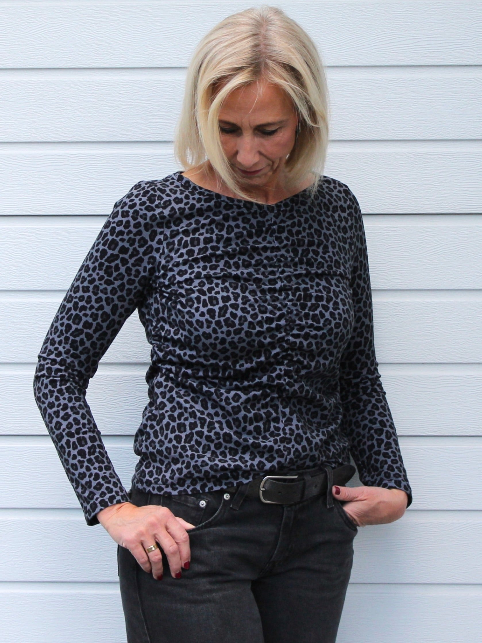 Die Teilungsnaht in der vorderen Mitte sorgt für einen spannenden Look und wird lässig eingekraust, was dem Shirt eine extra Portion Coolness und Bewegung schenkt. Diese zarten Raffungen vorne und an den Seiten entstehen durch eingesteppte Gummis und zaubern wunderschöne Falten ins Vorderteil – feminin, aber nicht verspielt, edgy, aber nicht übertrieben.