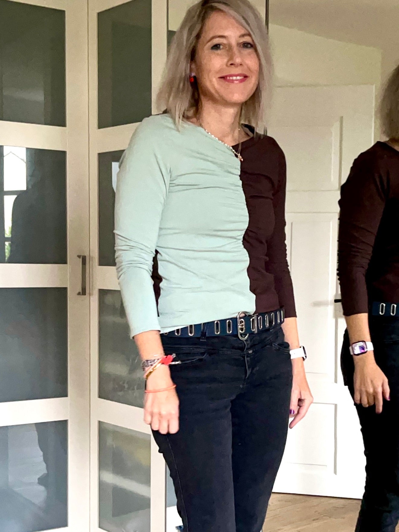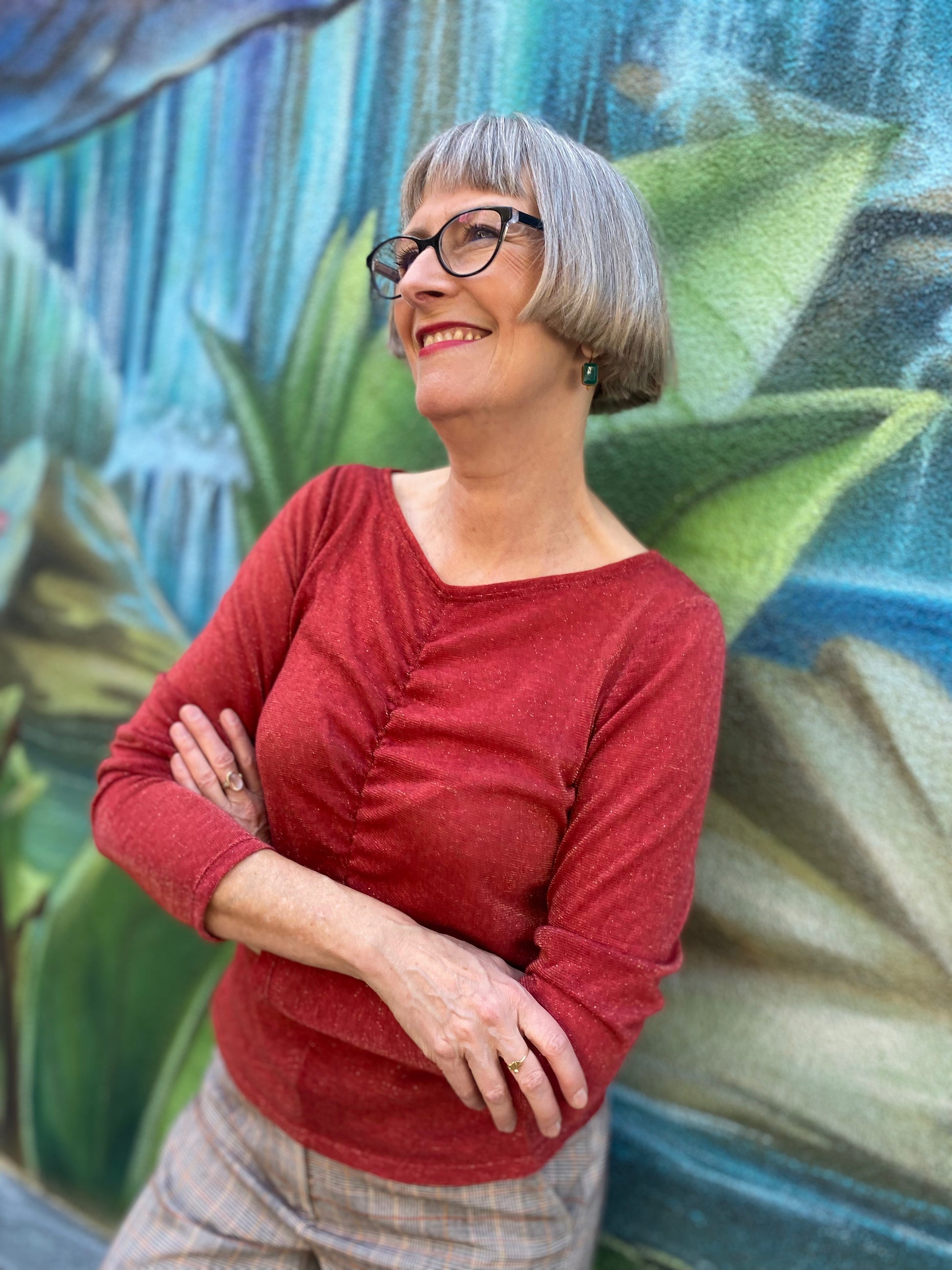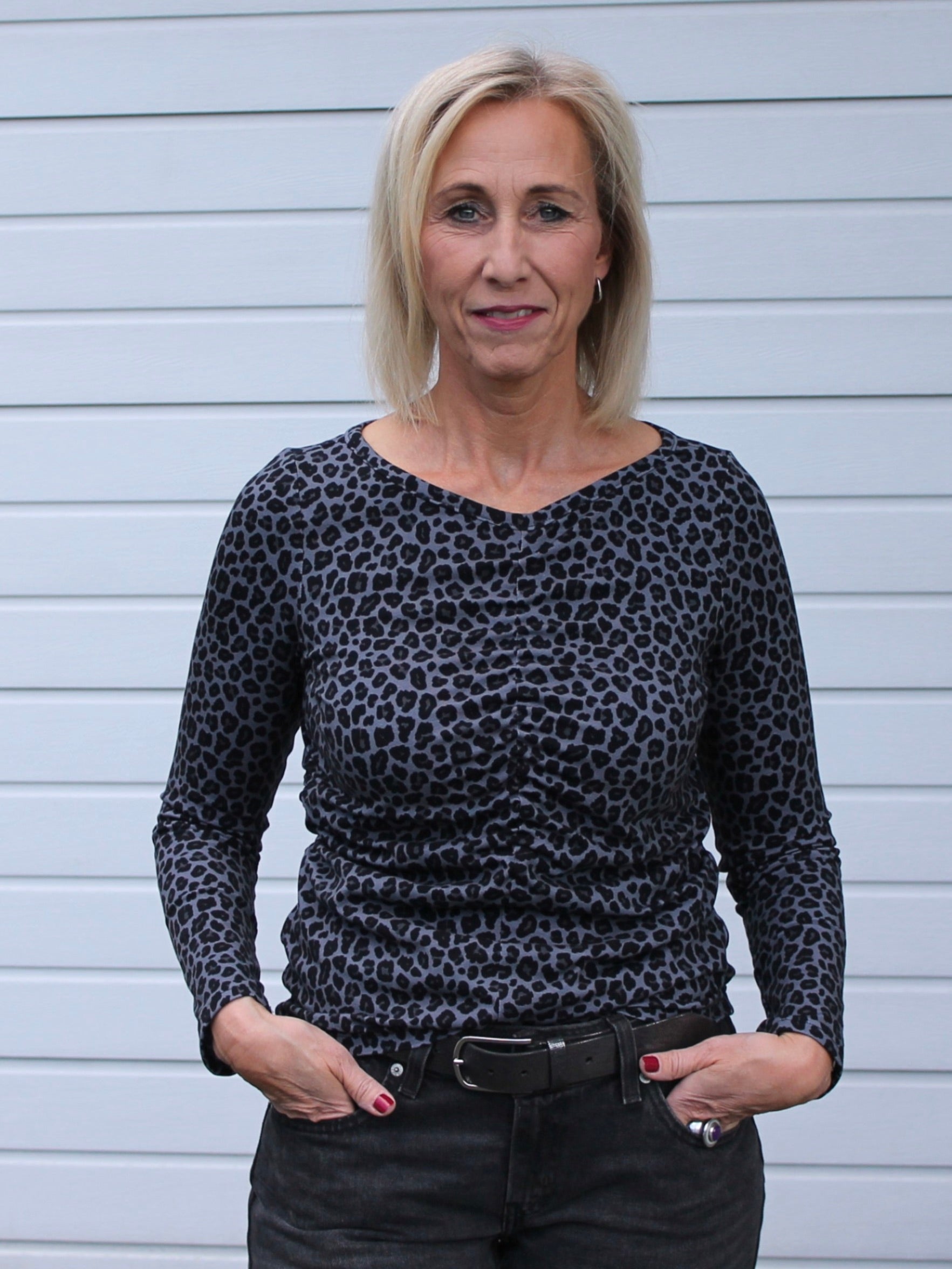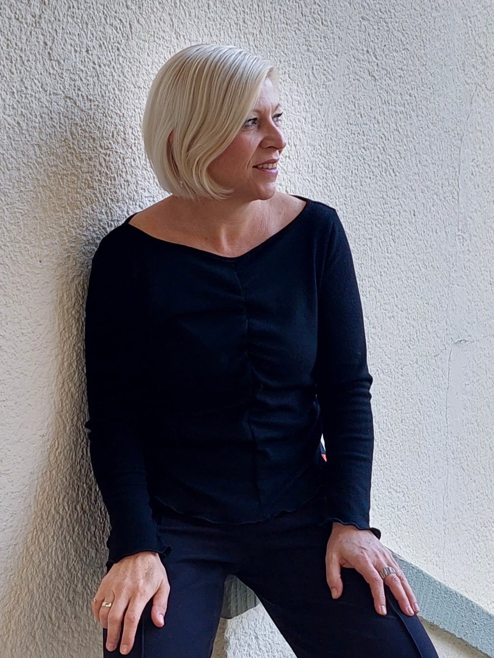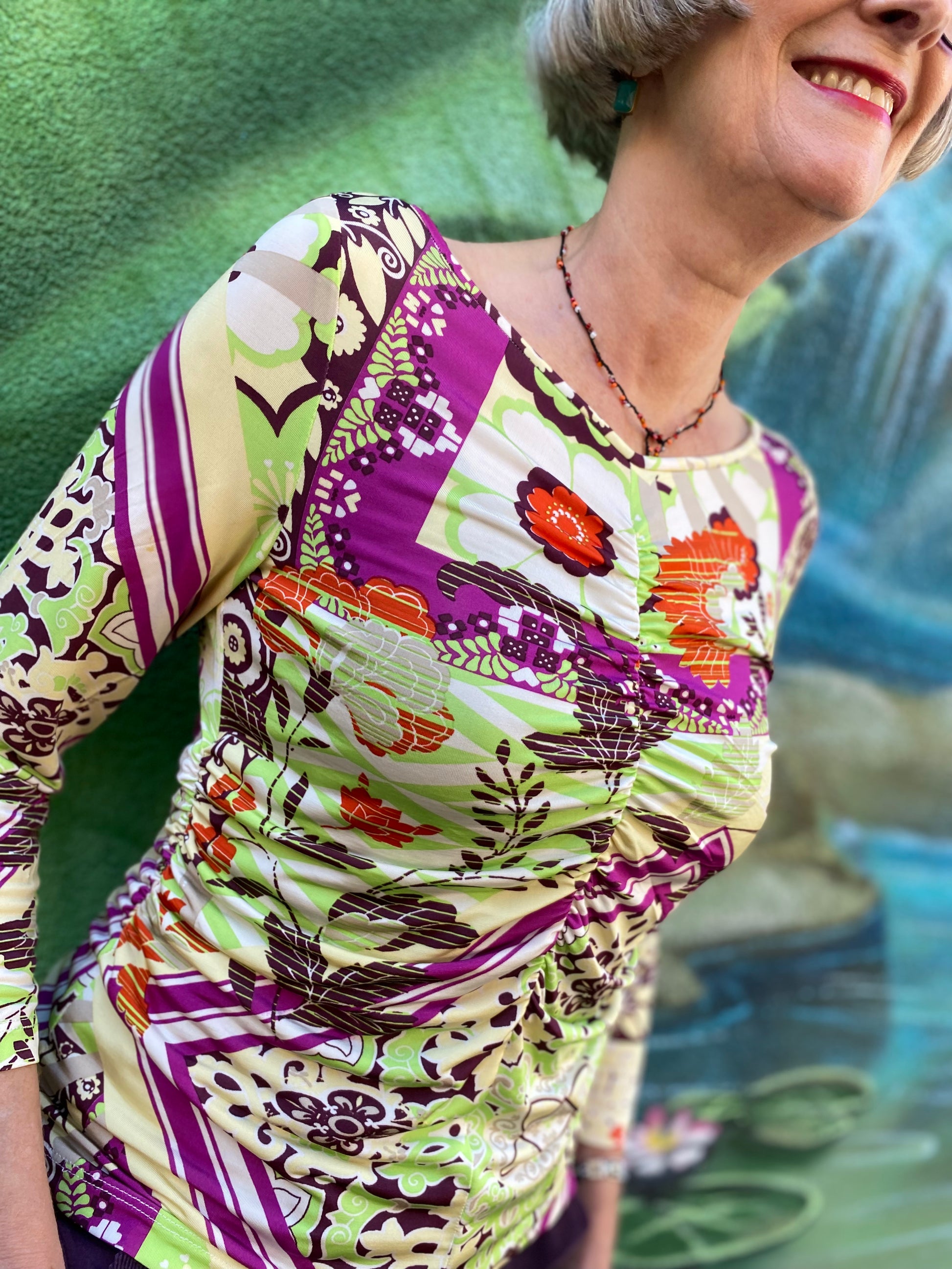 Die Teilungsnaht in der vorderen Mitte sorgt für einen spannenden Look und wird lässig eingekraust, was dem Shirt eine extra Portion Coolness und Bewegung schenkt. Diese zarten Raffungen vorne und an den Seiten entstehen durch eingesteppte Gummis und zaubern wunderschöne Falten ins Vorderteil – feminin, aber nicht verspielt, edgy, aber nicht übertrieben.