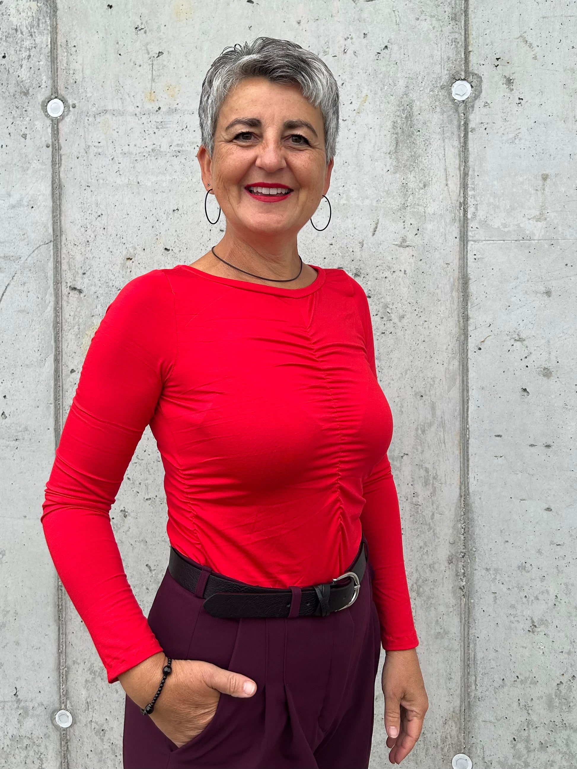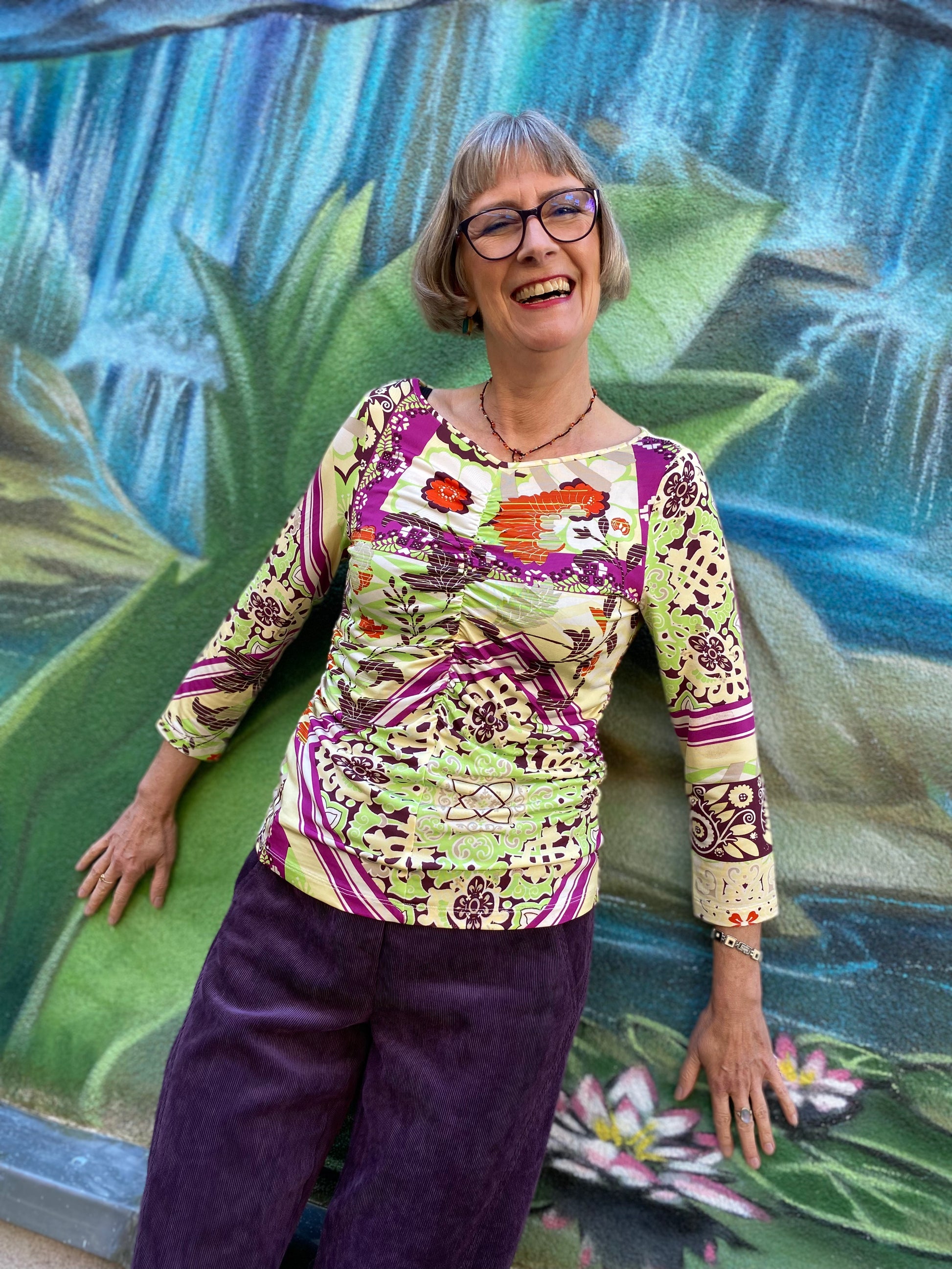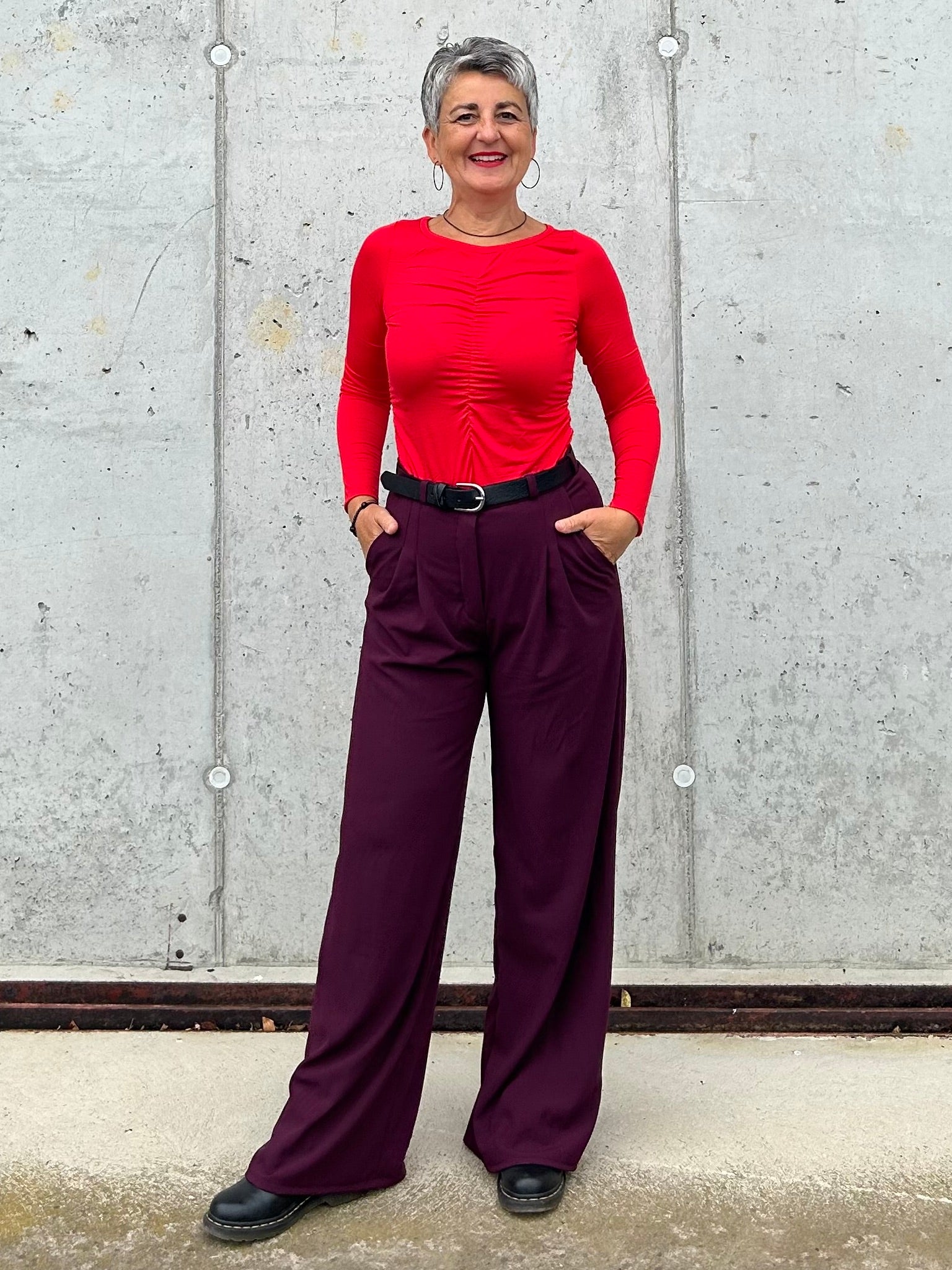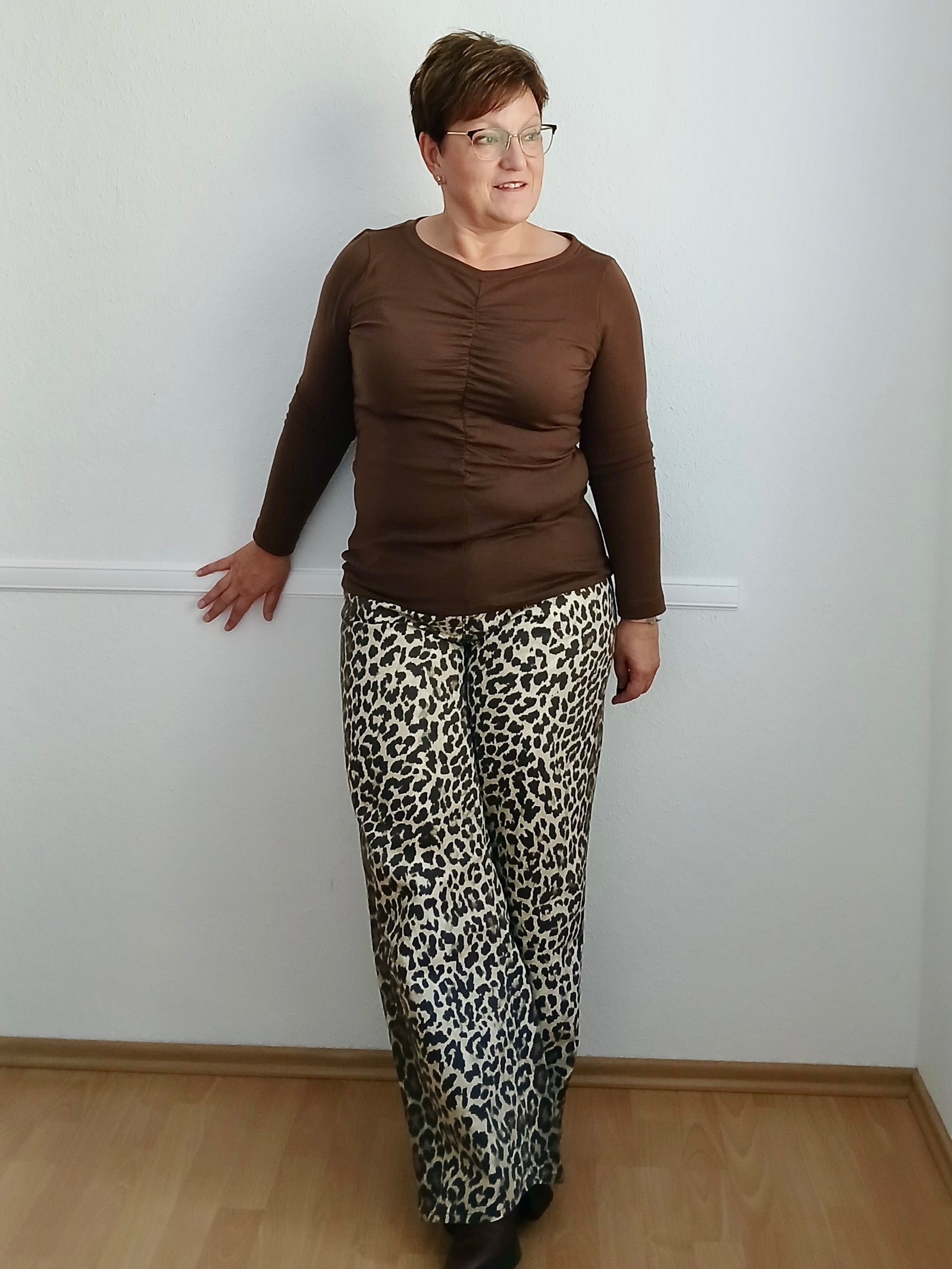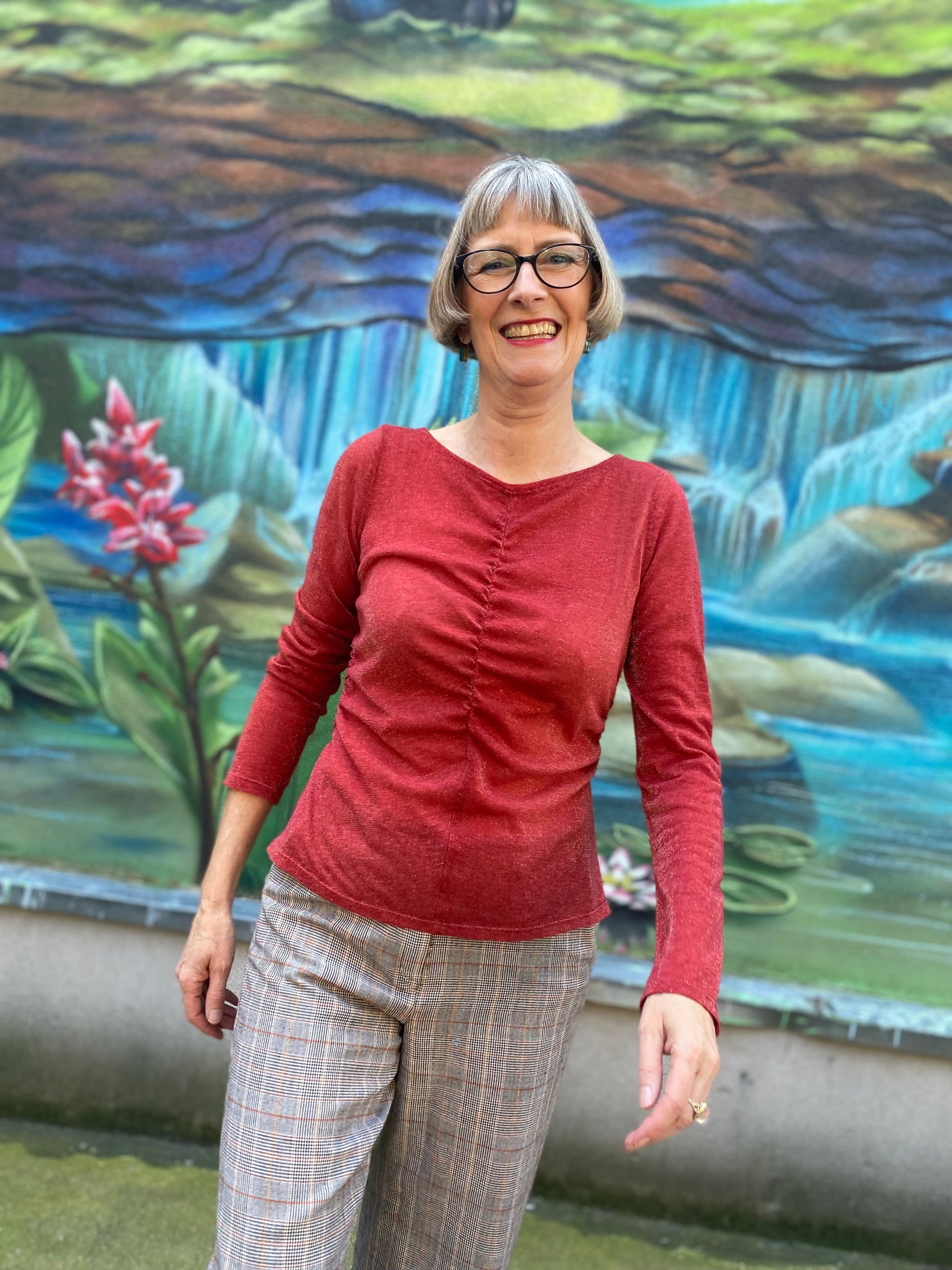 Die Teilungsnaht in der vorderen Mitte sorgt für einen spannenden Look und wird lässig eingekraust, was dem Shirt eine extra Portion Coolness und Bewegung schenkt. Diese zarten Raffungen vorne und an den Seiten entstehen durch eingesteppte Gummis und zaubern wunderschöne Falten ins Vorderteil – feminin, aber nicht verspielt, edgy, aber nicht übertrieben.