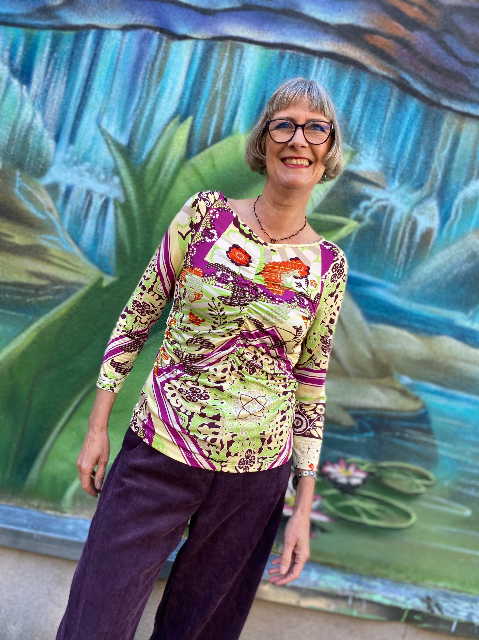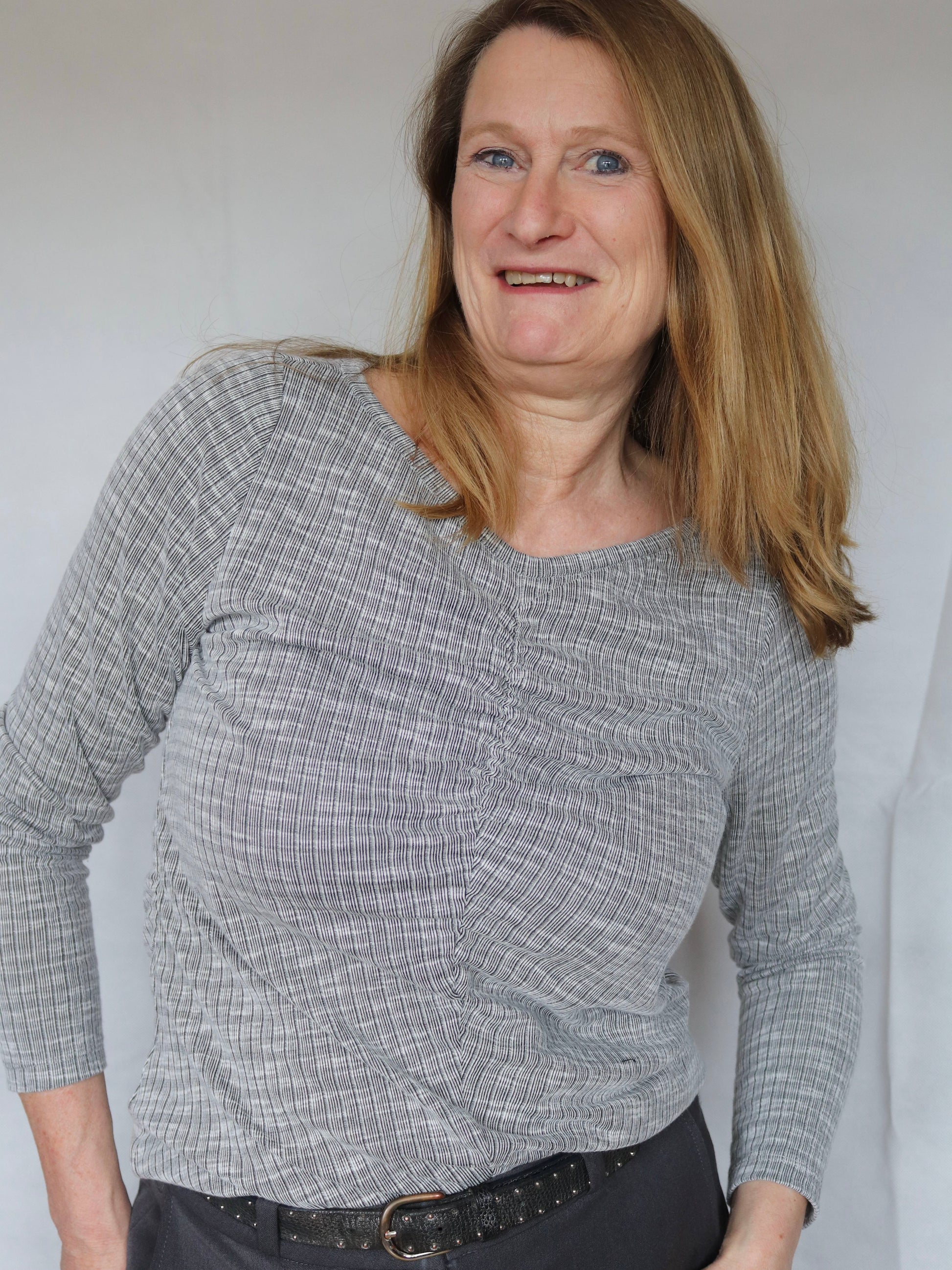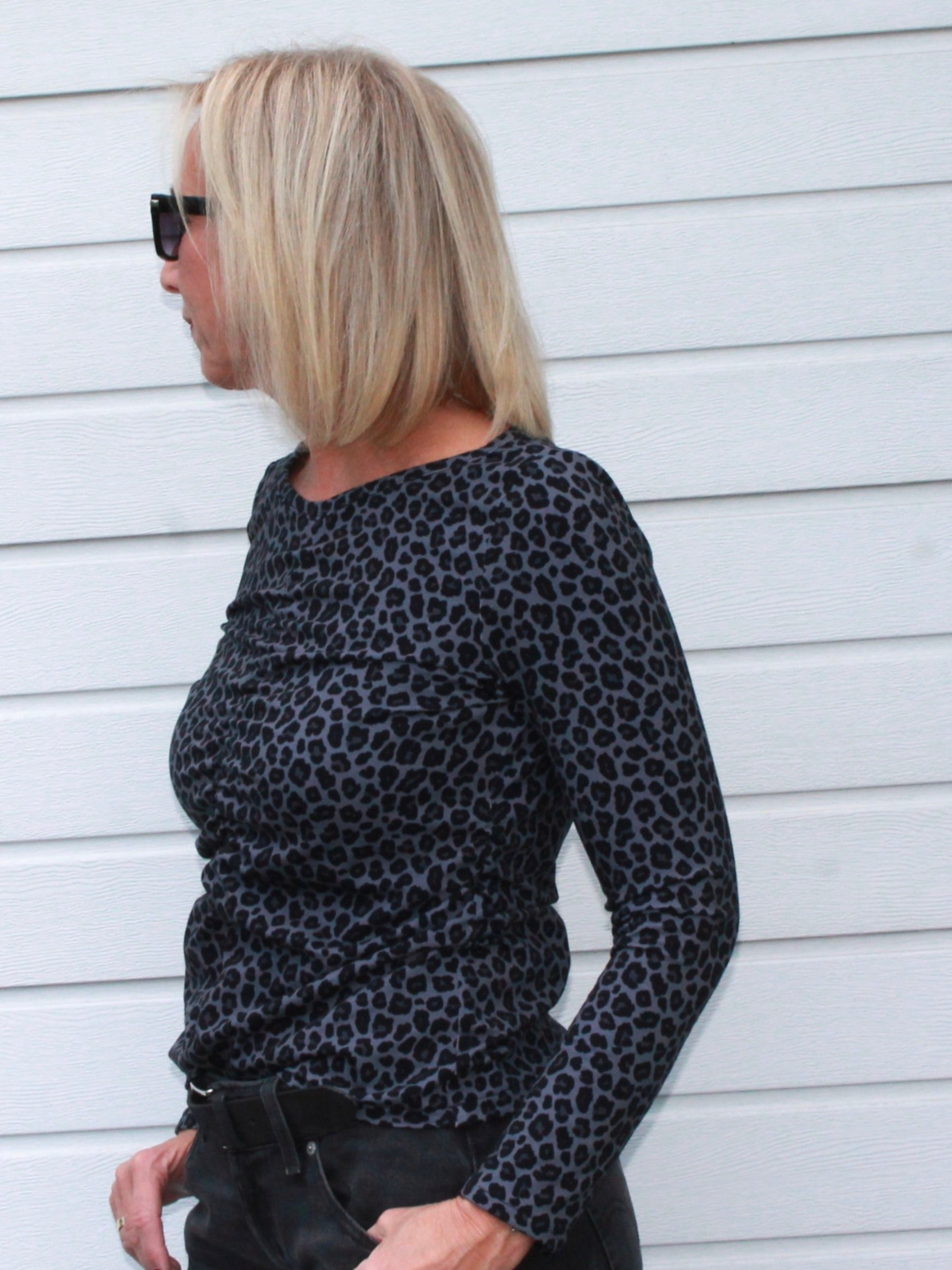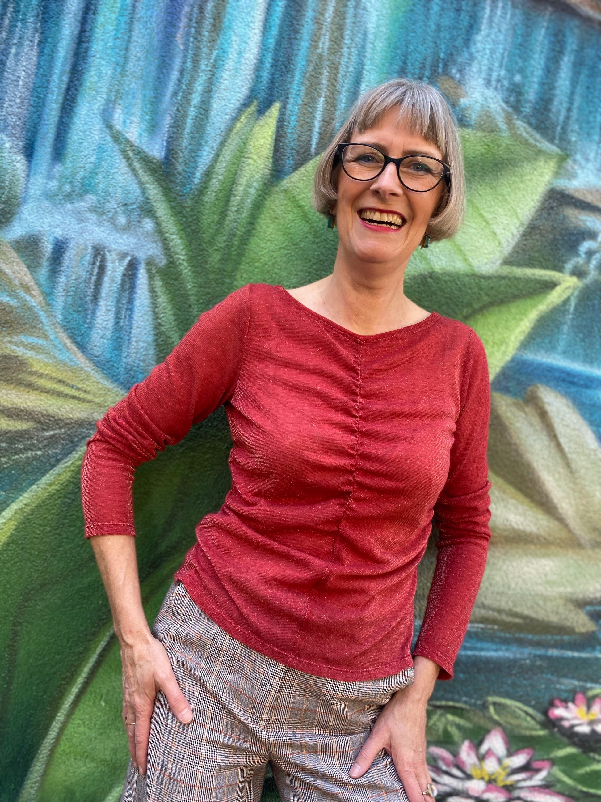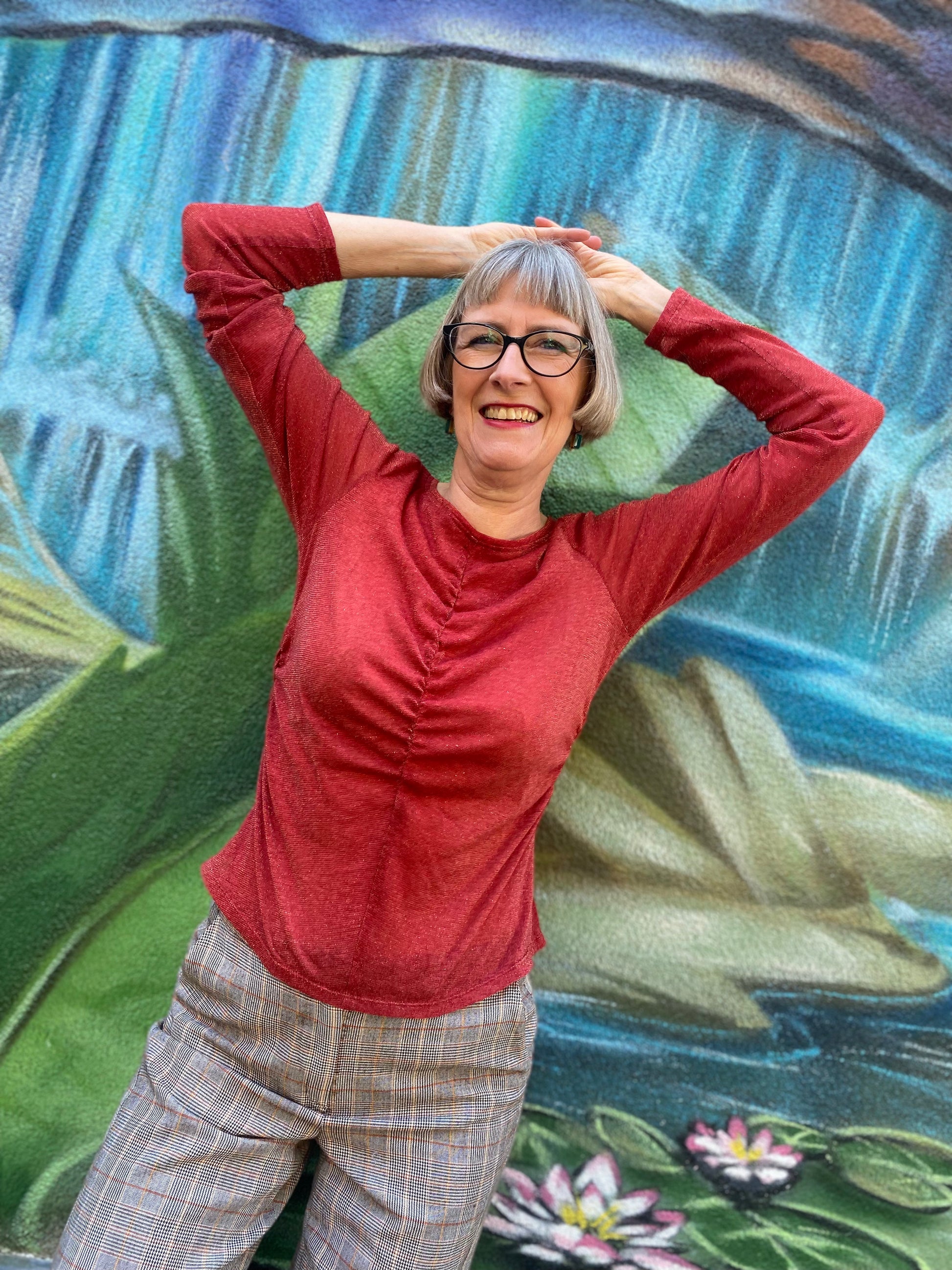 Die Teilungsnaht in der vorderen Mitte sorgt für einen spannenden Look und wird lässig eingekraust, was dem Shirt eine extra Portion Coolness und Bewegung schenkt. Diese zarten Raffungen vorne und an den Seiten entstehen durch eingesteppte Gummis und zaubern wunderschöne Falten ins Vorderteil – feminin, aber nicht verspielt, edgy, aber nicht übertrieben.