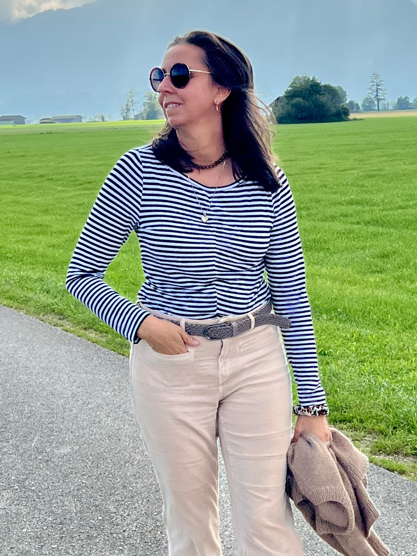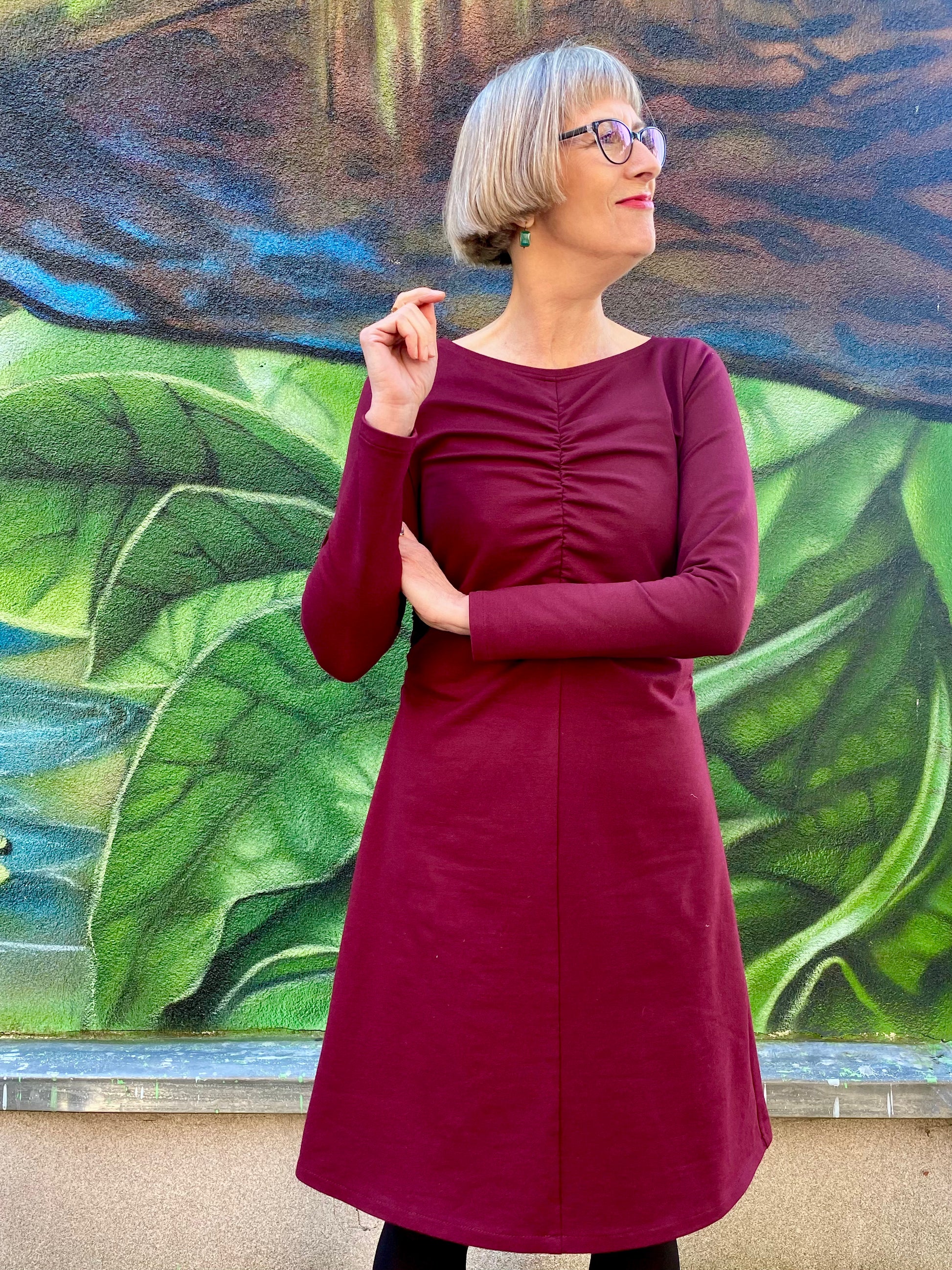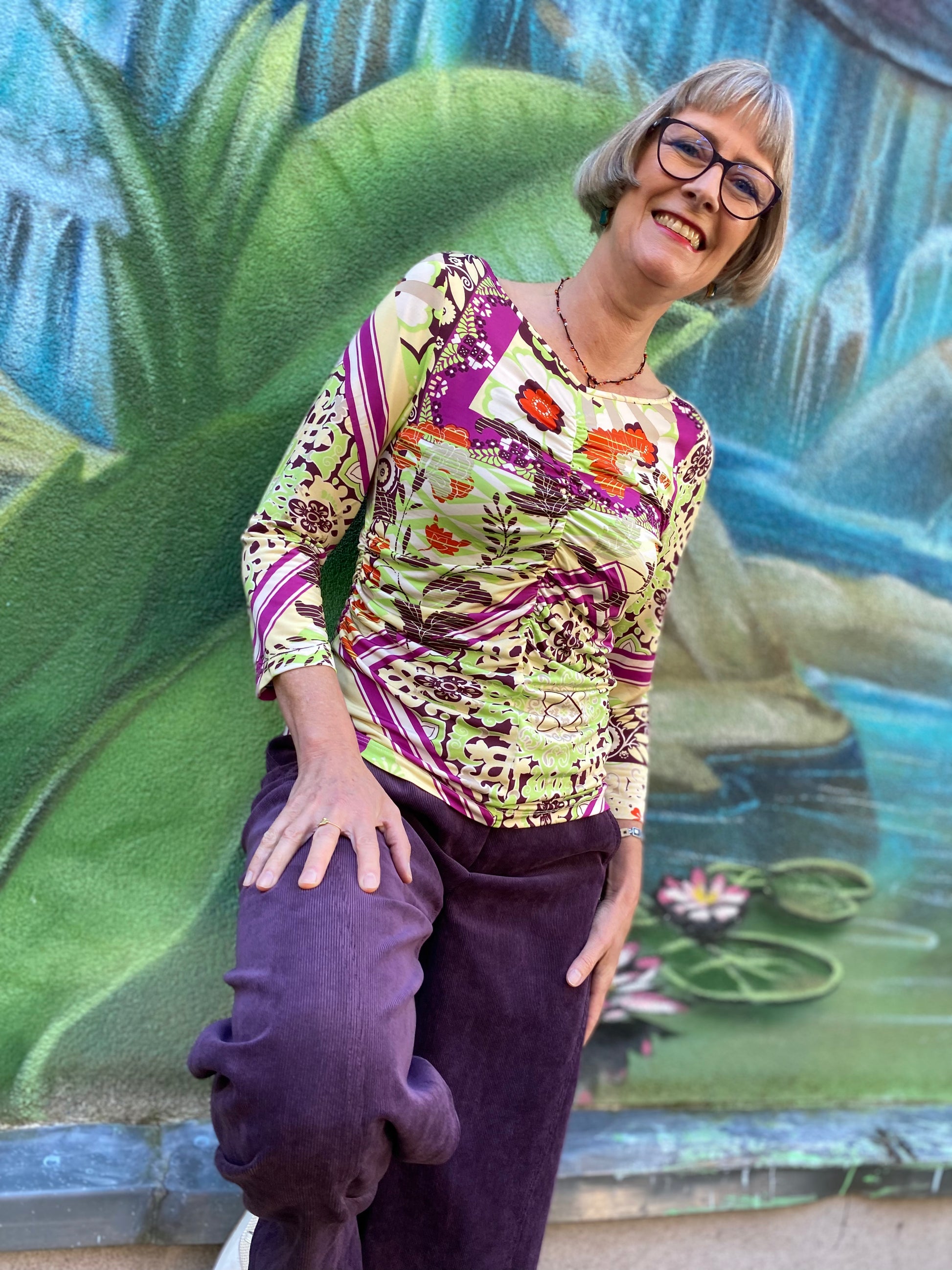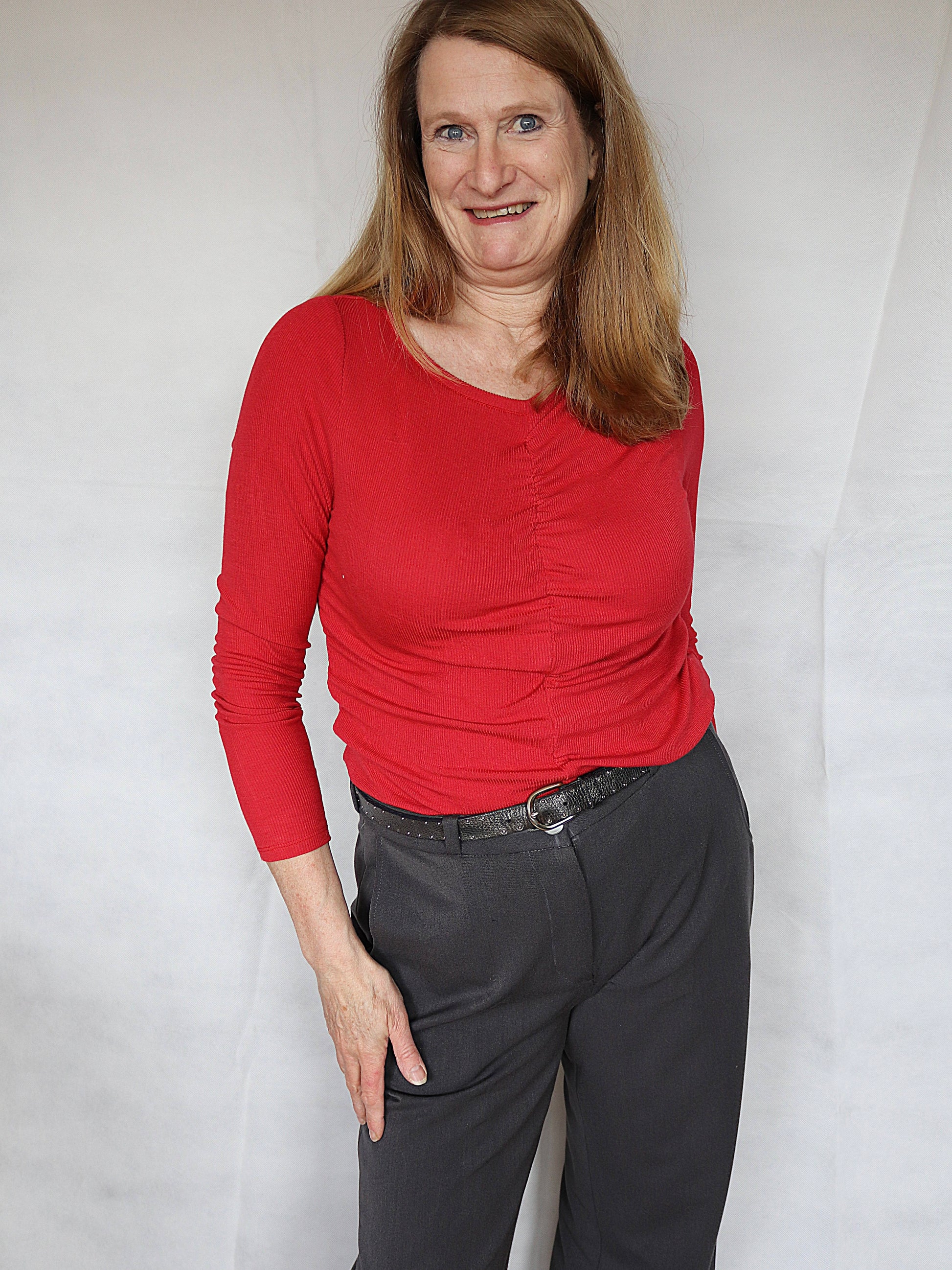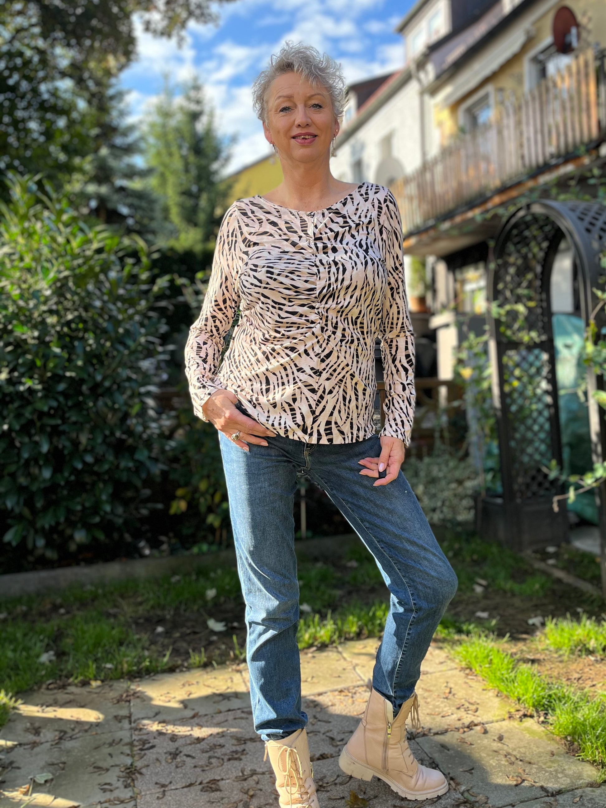 Die Teilungsnaht in der vorderen Mitte sorgt für einen spannenden Look und wird lässig eingekraust, was dem Shirt eine extra Portion Coolness und Bewegung schenkt. Diese zarten Raffungen vorne und an den Seiten entstehen durch eingesteppte Gummis und zaubern wunderschöne Falten ins Vorderteil – feminin, aber nicht verspielt, edgy, aber nicht übertrieben.
