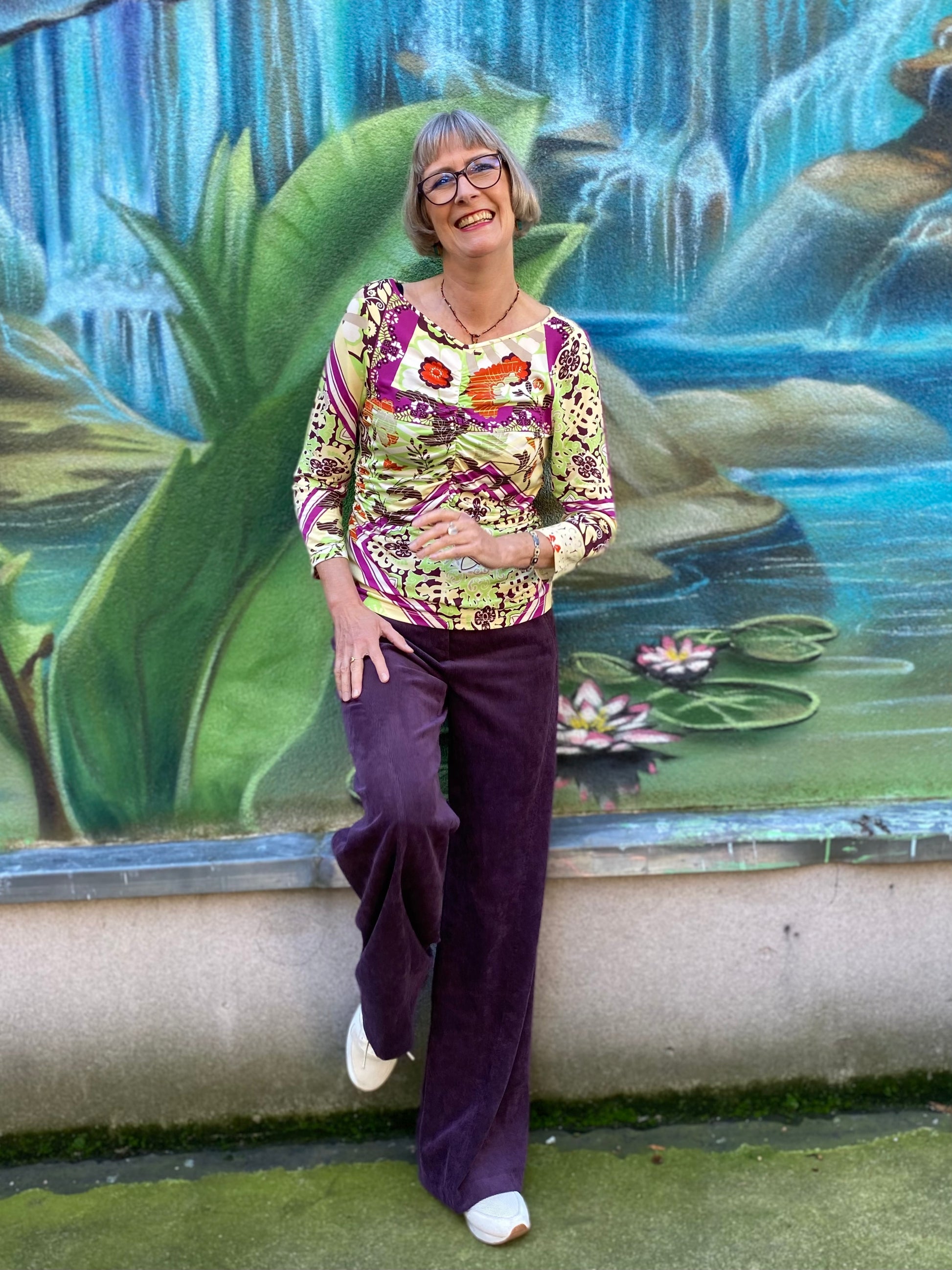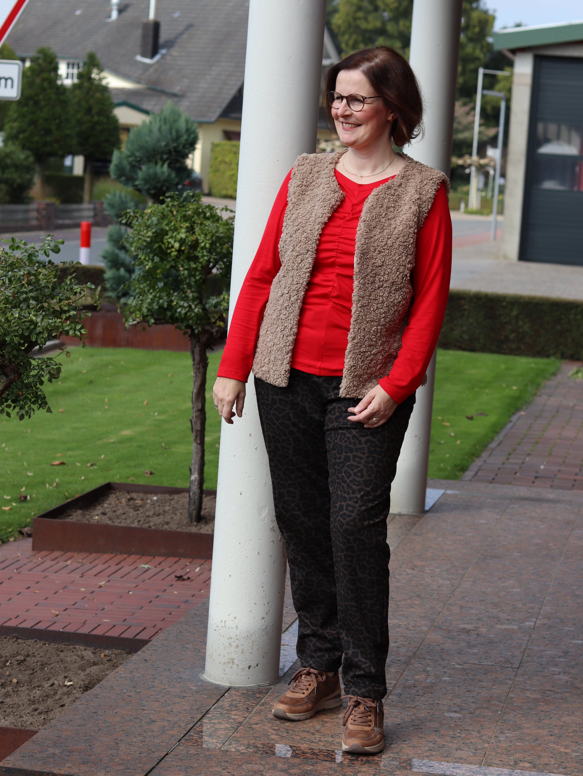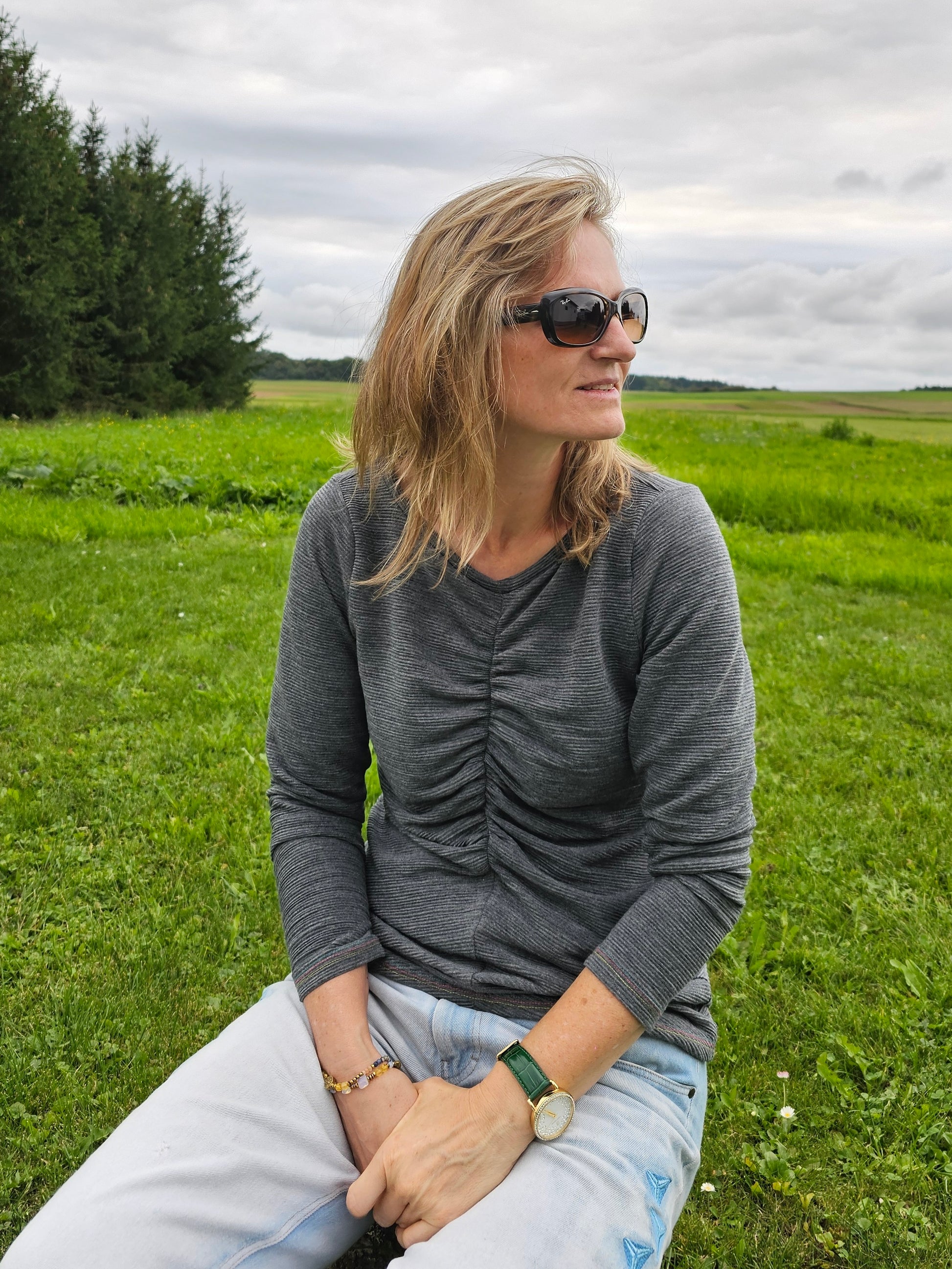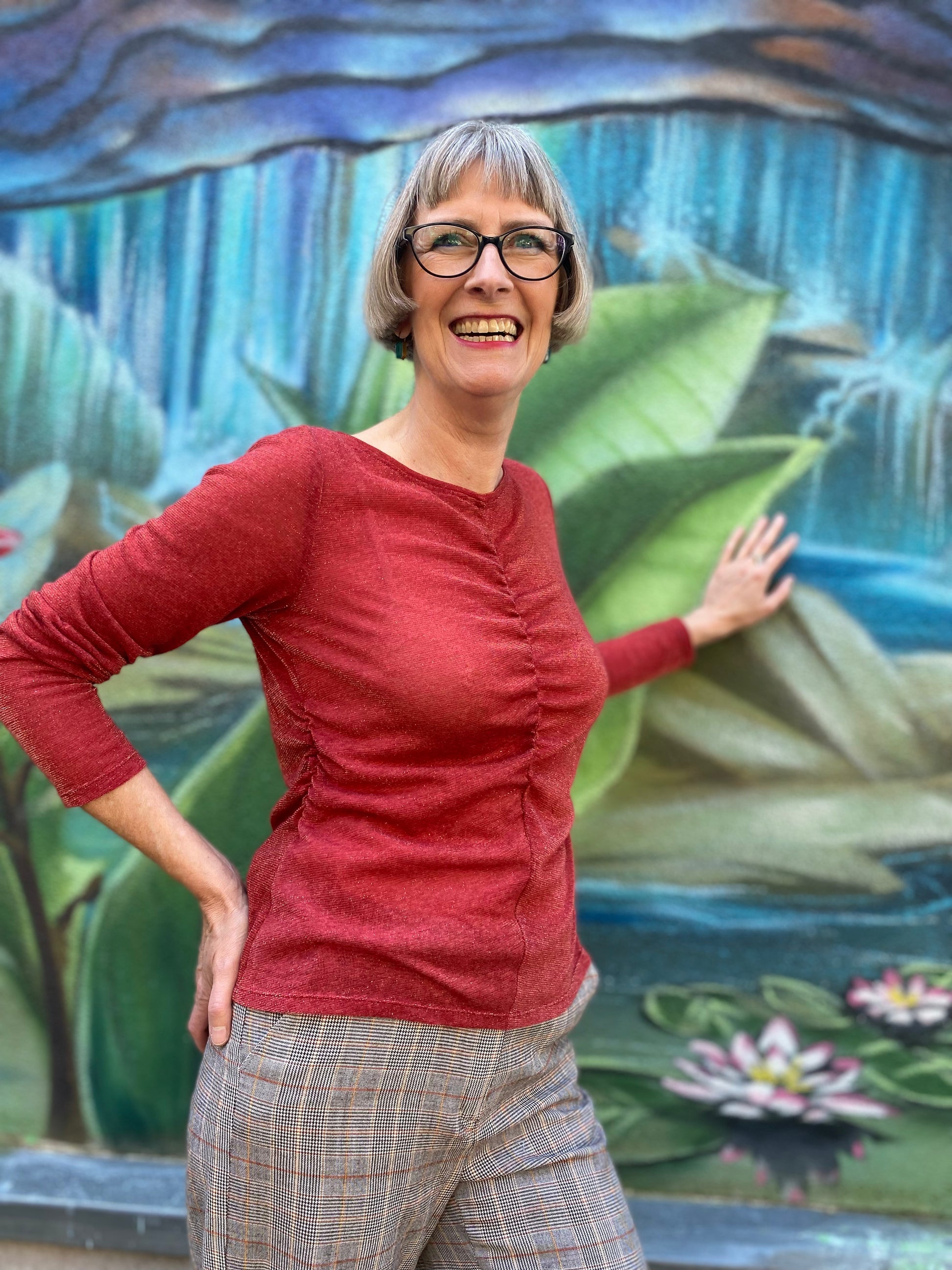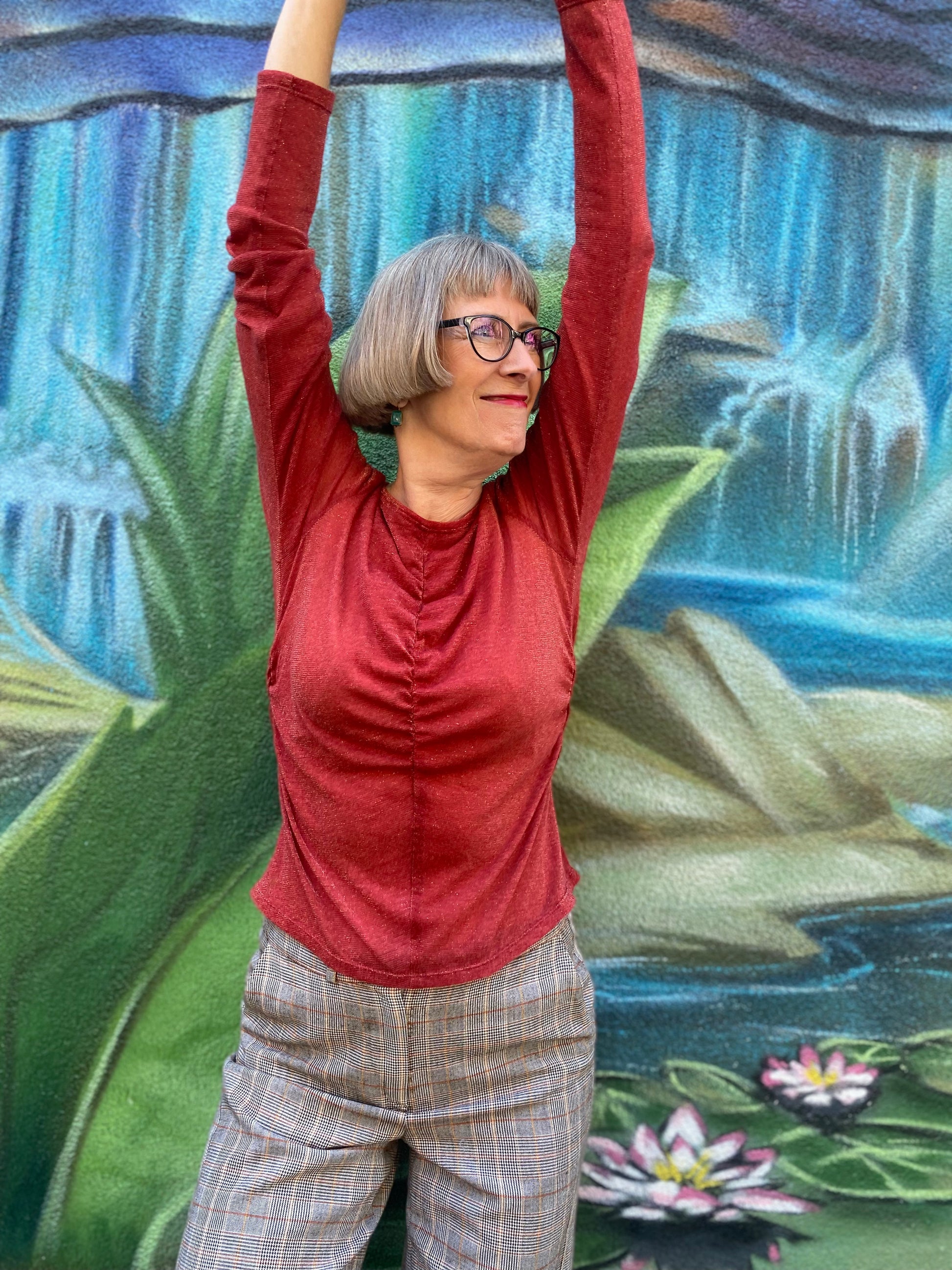 Die Teilungsnaht in der vorderen Mitte sorgt für einen spannenden Look und wird lässig eingekraust, was dem Shirt eine extra Portion Coolness und Bewegung schenkt. Diese zarten Raffungen vorne und an den Seiten entstehen durch eingesteppte Gummis und zaubern wunderschöne Falten ins Vorderteil – feminin, aber nicht verspielt, edgy, aber nicht übertrieben.