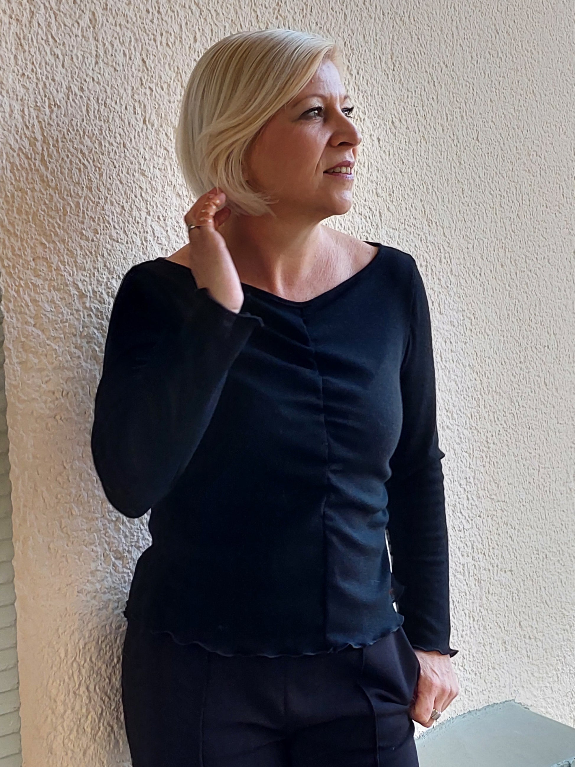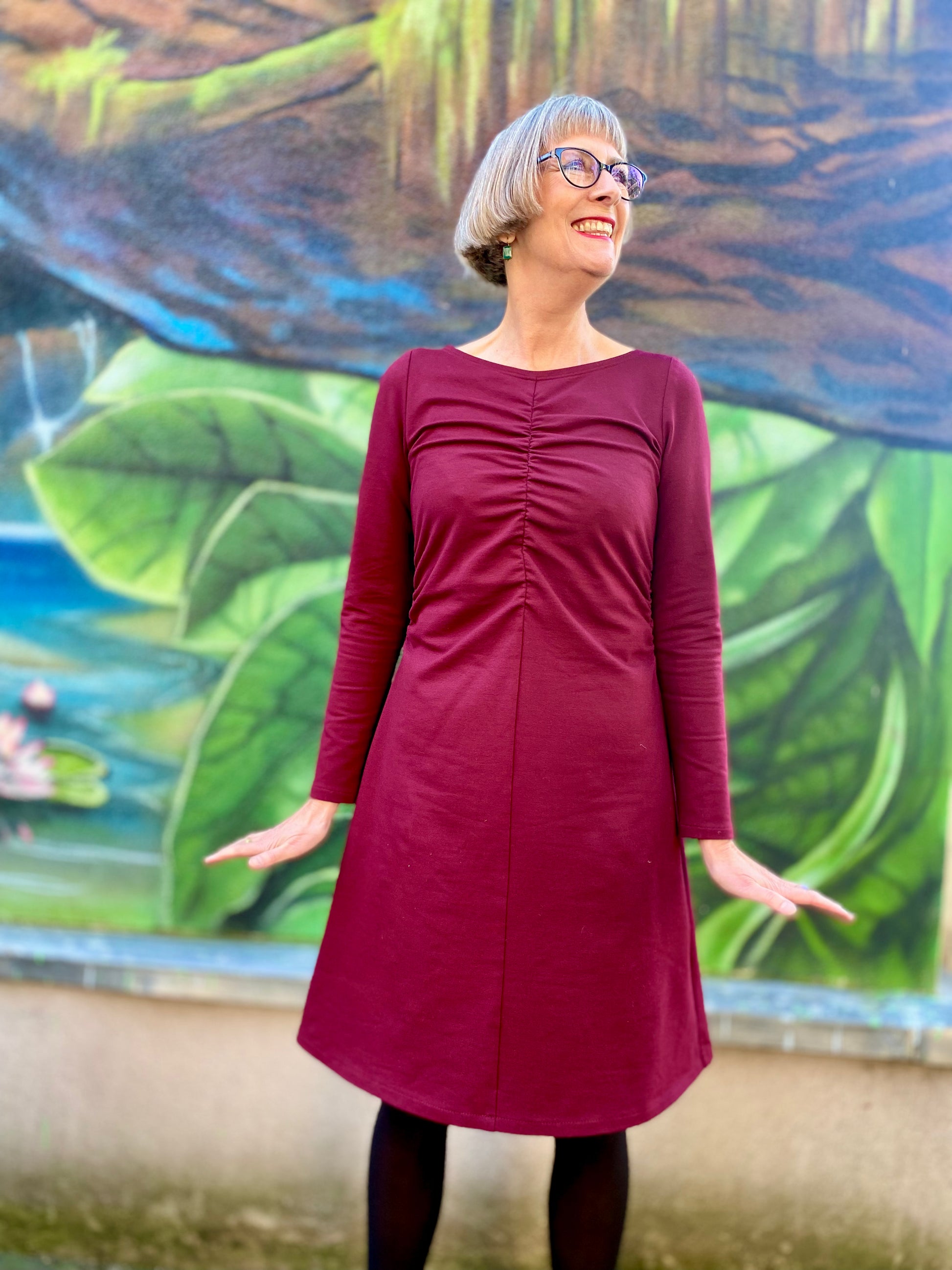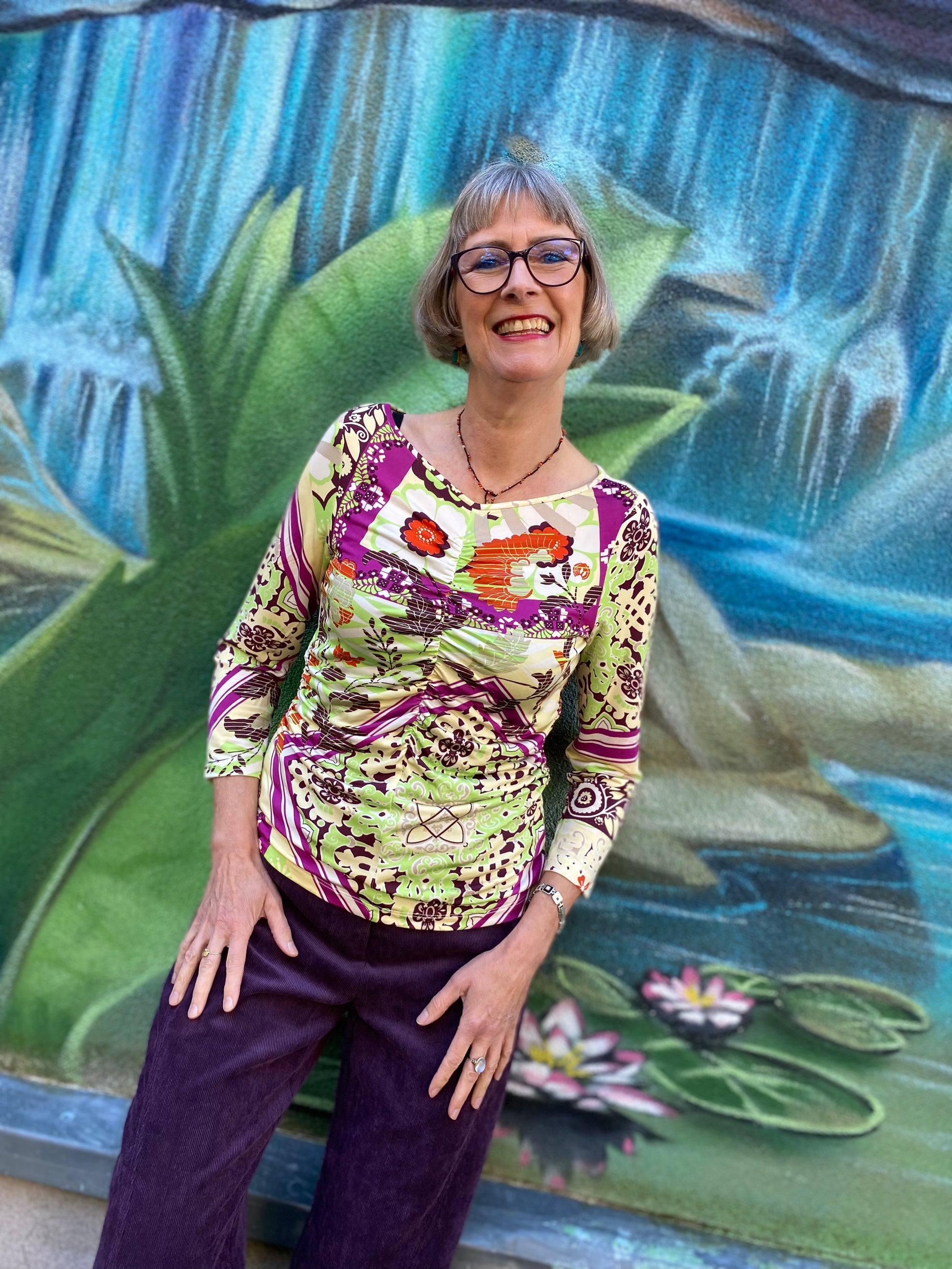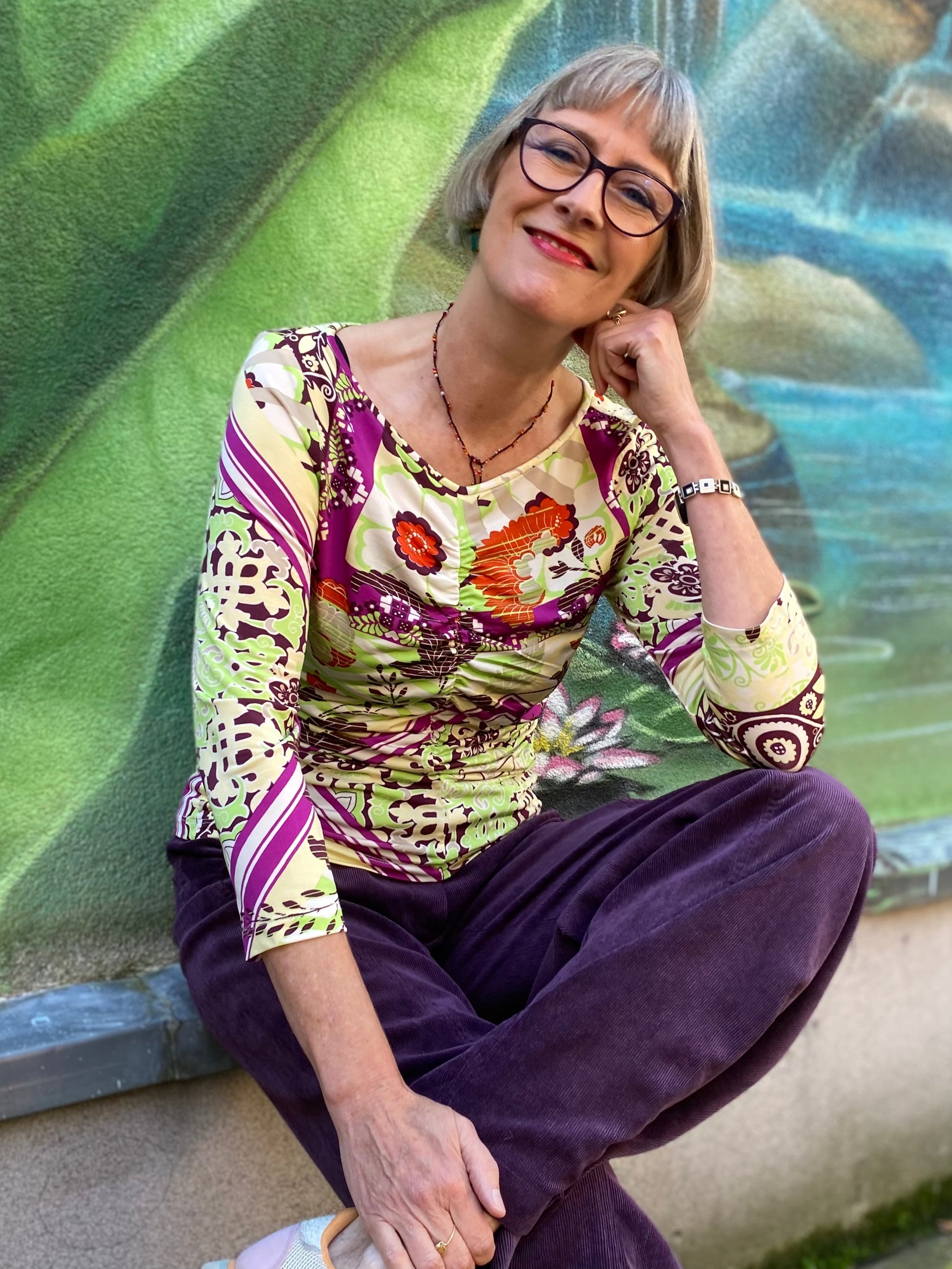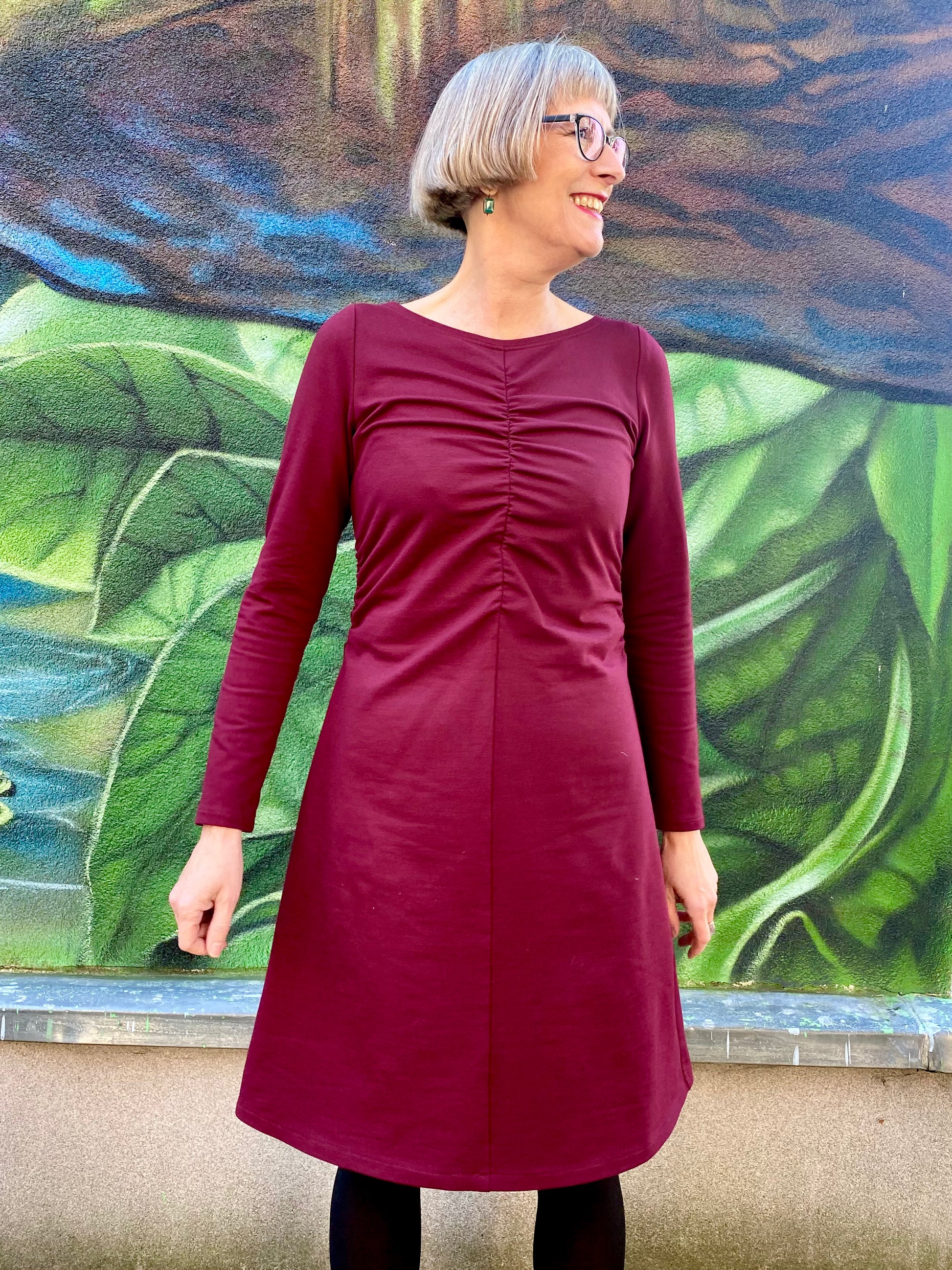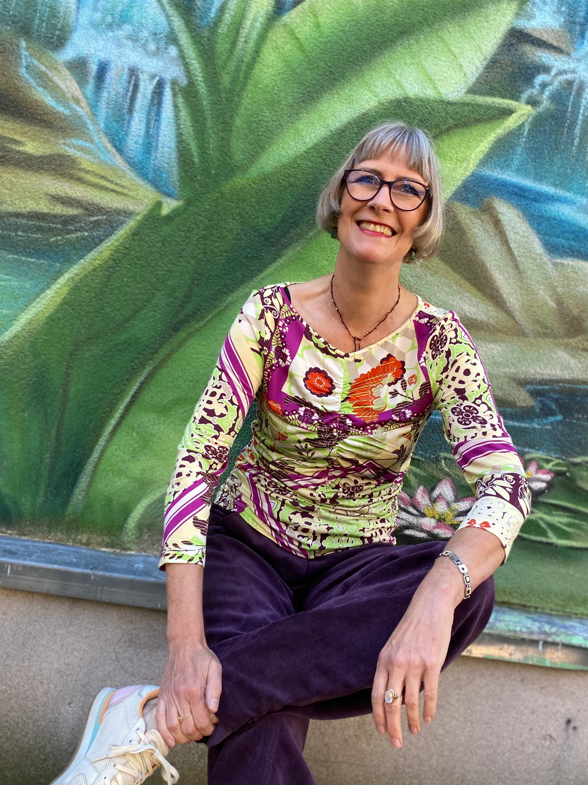 Die Teilungsnaht in der vorderen Mitte sorgt für einen spannenden Look und wird lässig eingekraust, was dem Shirt eine extra Portion Coolness und Bewegung schenkt. Diese zarten Raffungen vorne und an den Seiten entstehen durch eingesteppte Gummis und zaubern wunderschöne Falten ins Vorderteil – feminin, aber nicht verspielt, edgy, aber nicht übertrieben.
