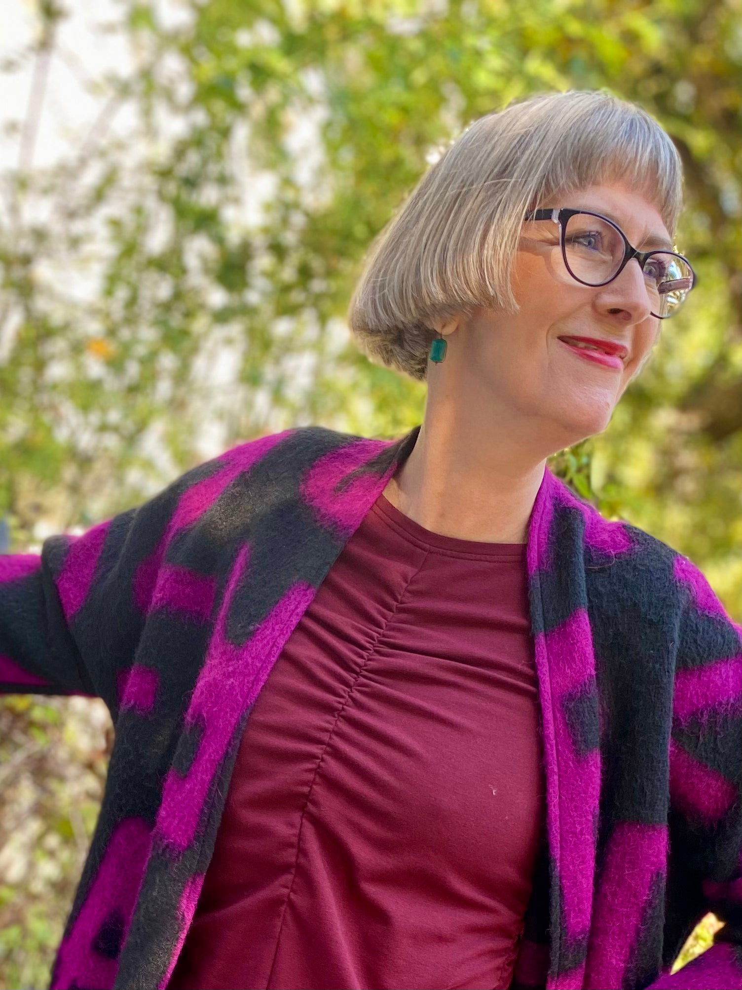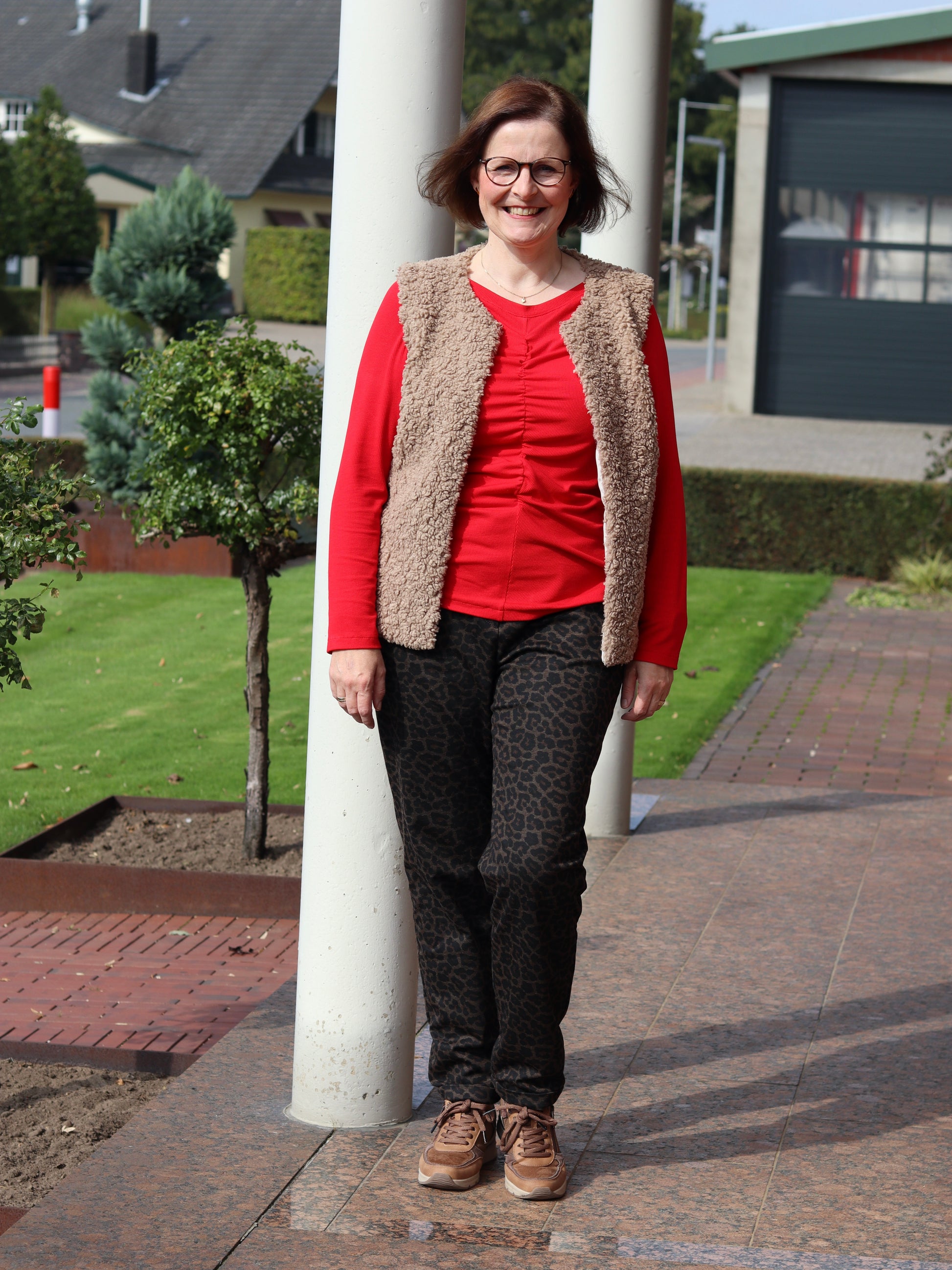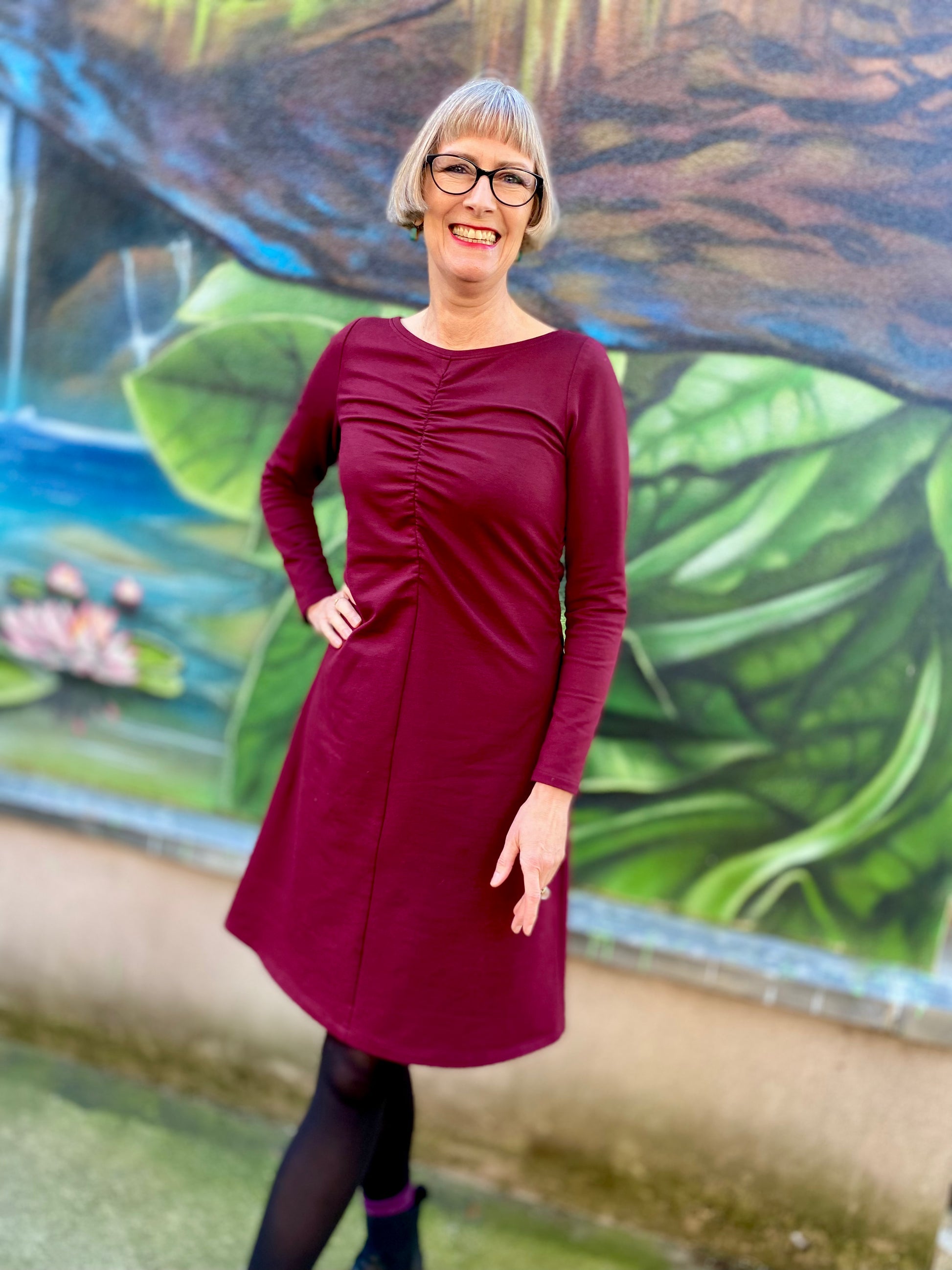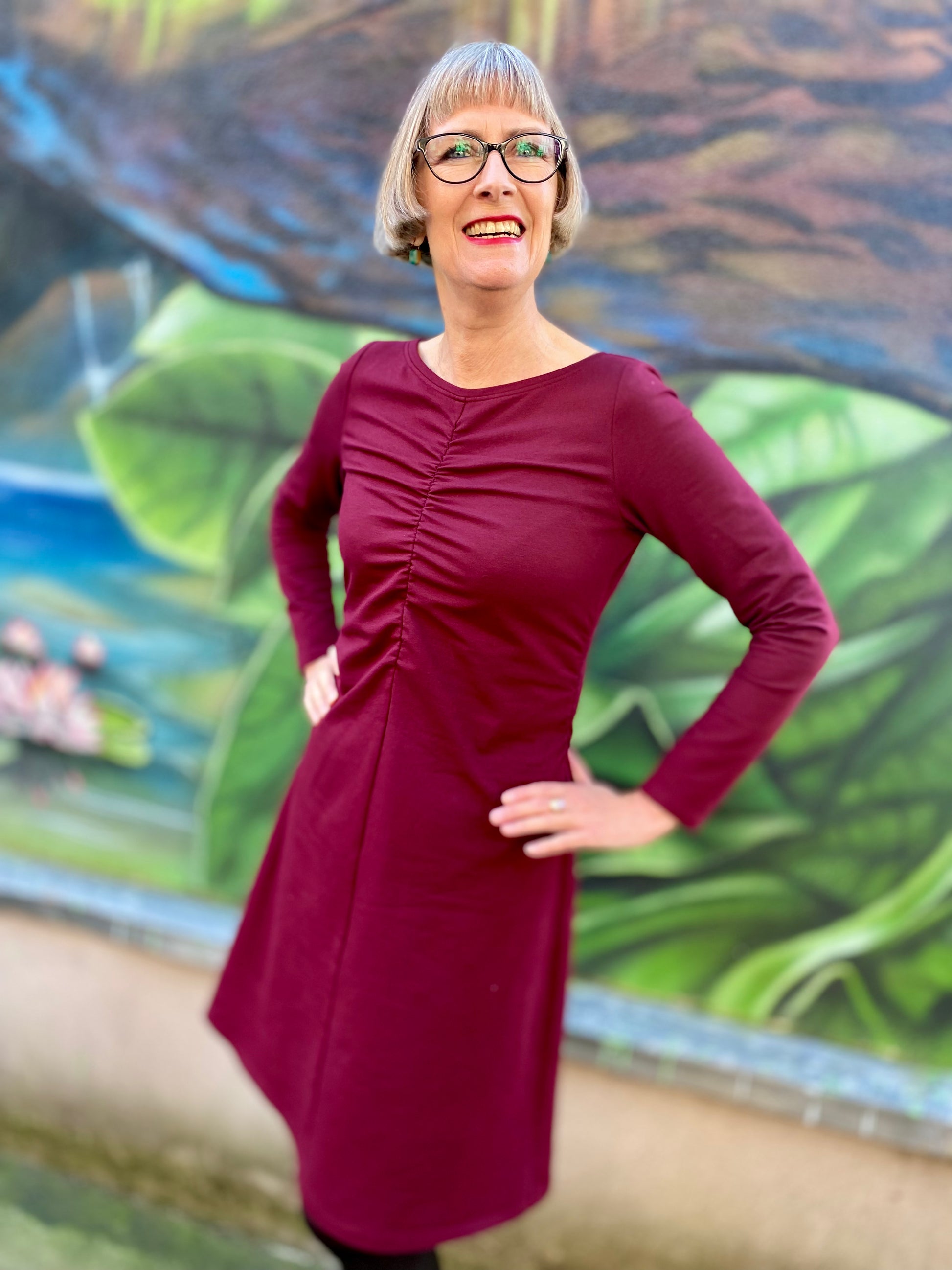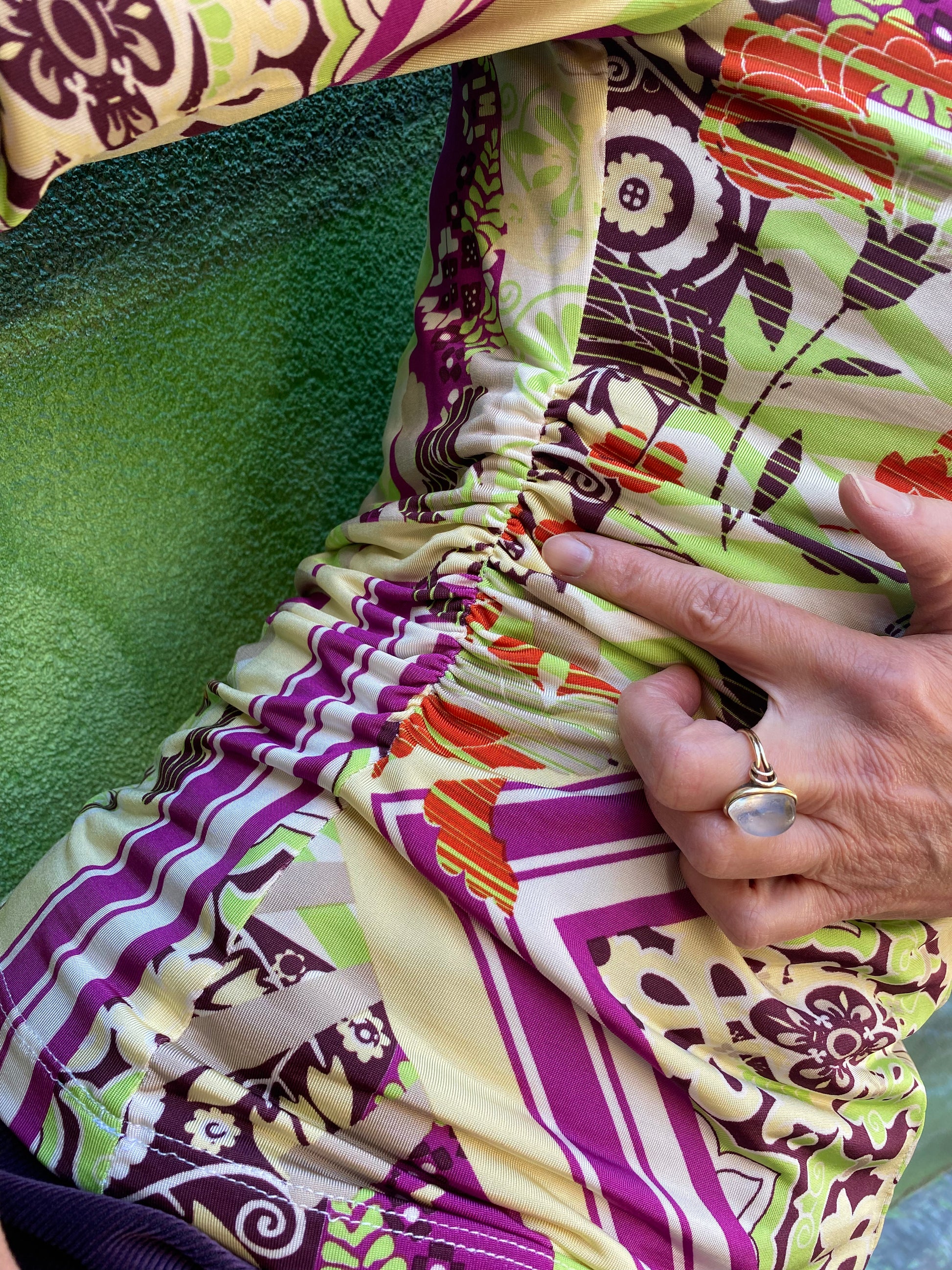 Die Teilungsnaht in der vorderen Mitte sorgt für einen spannenden Look und wird lässig eingekraust, was dem Shirt eine extra Portion Coolness und Bewegung schenkt. Diese zarten Raffungen vorne und an den Seiten entstehen durch eingesteppte Gummis und zaubern wunderschöne Falten ins Vorderteil – feminin, aber nicht verspielt, edgy, aber nicht übertrieben.
