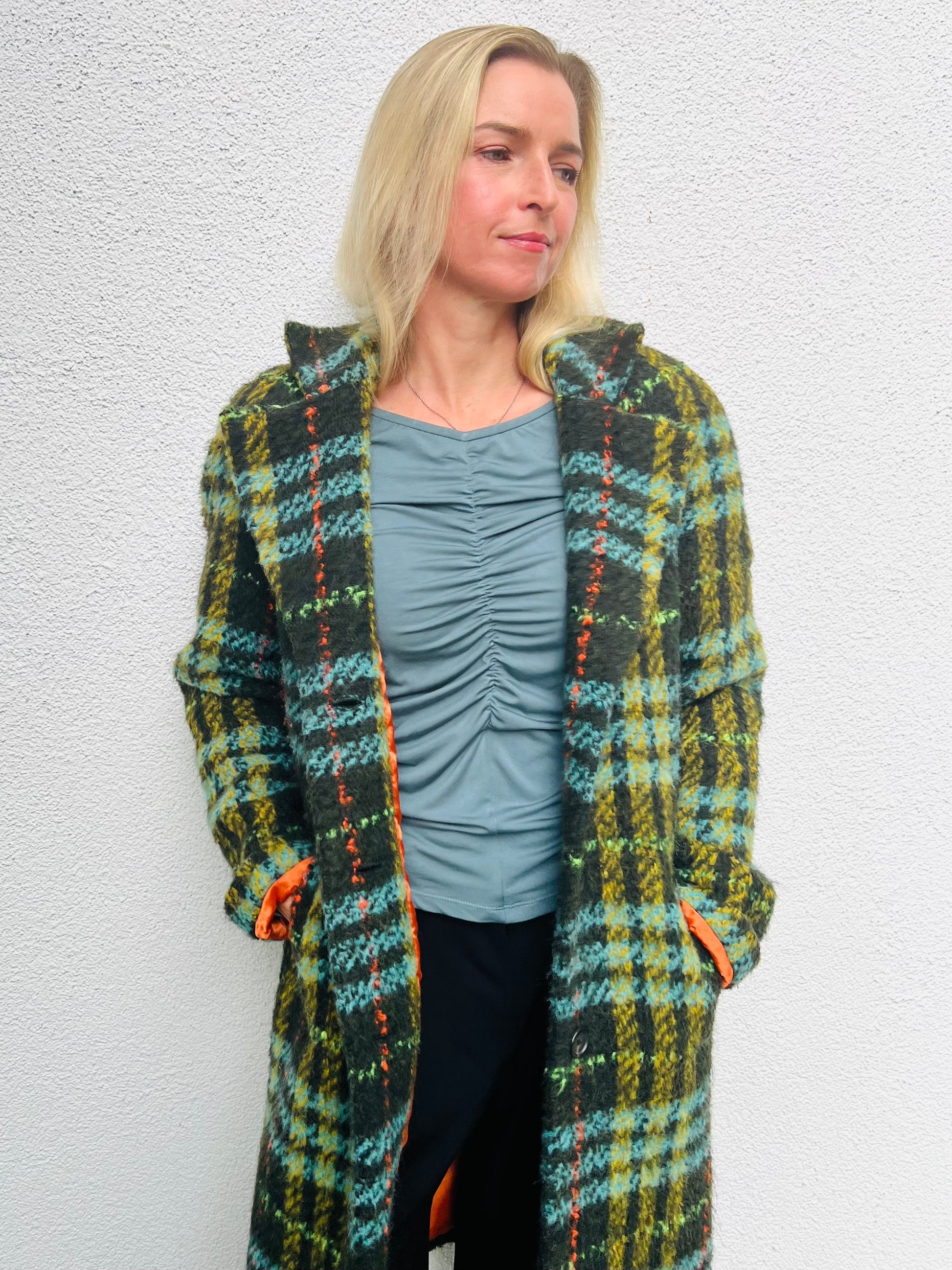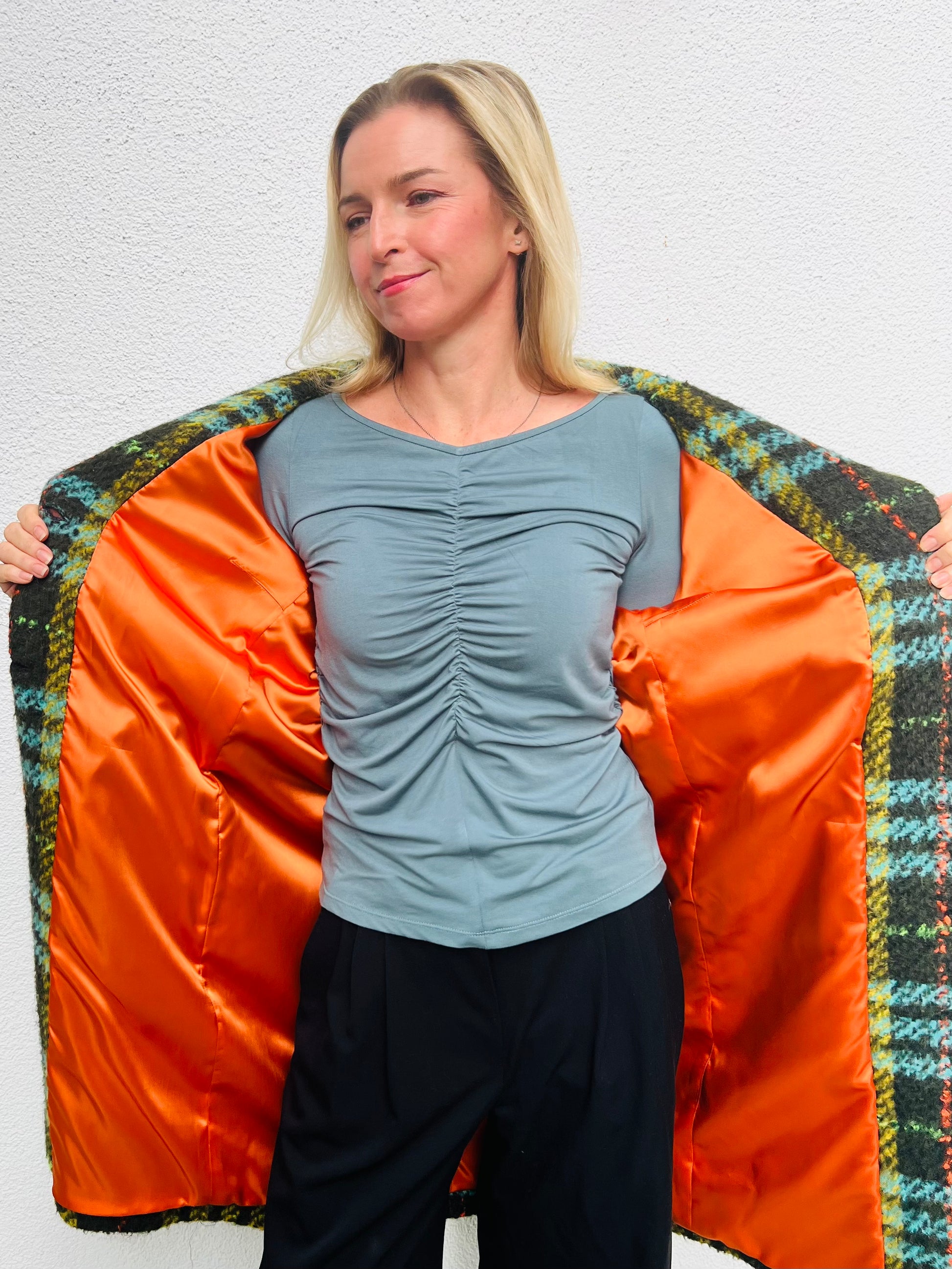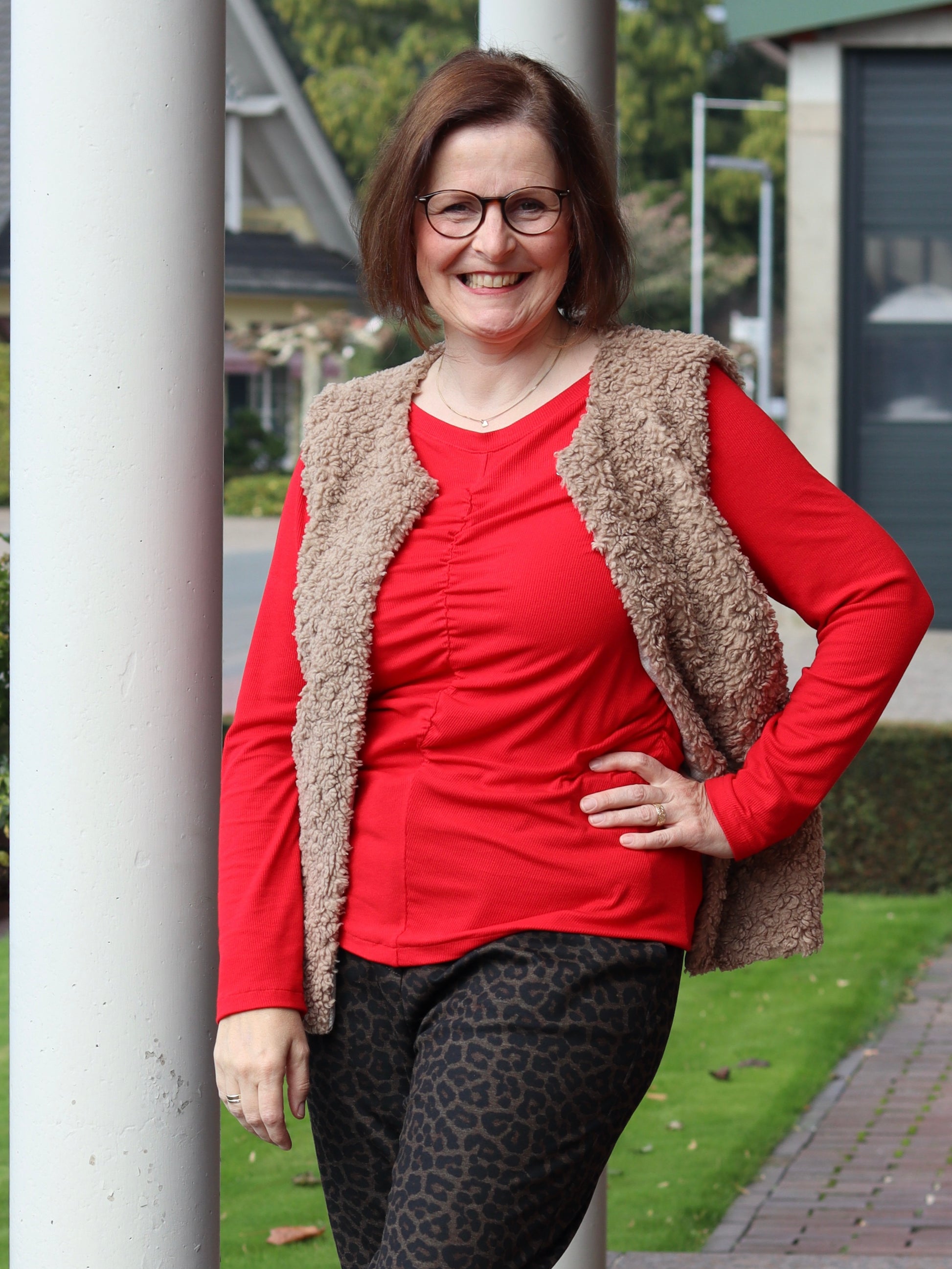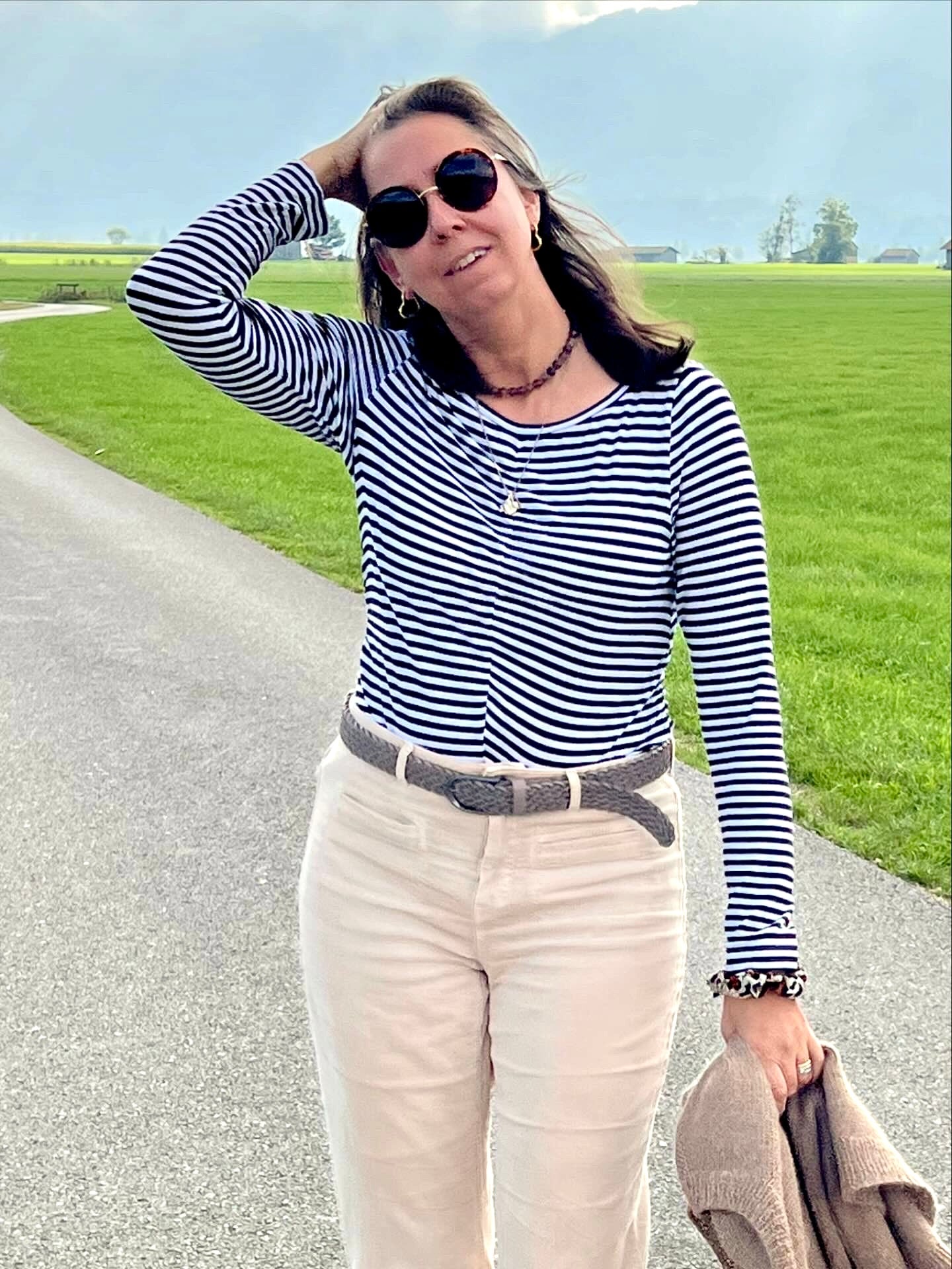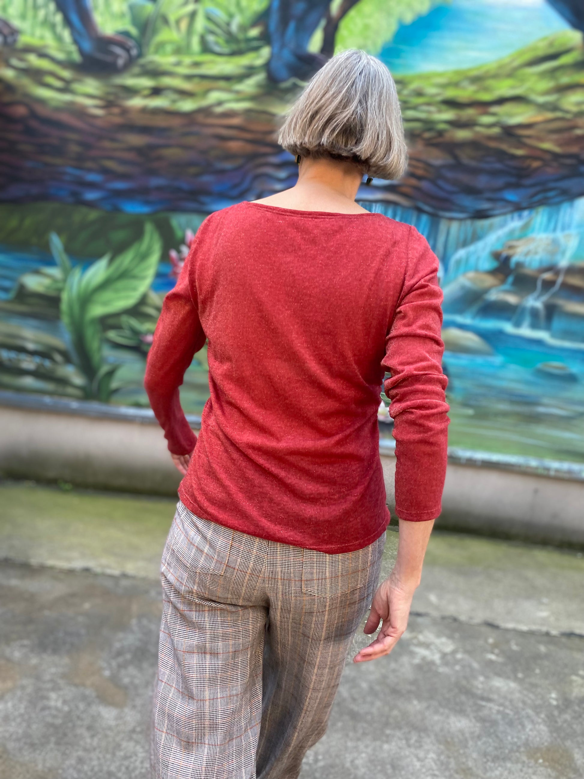 Die Teilungsnaht in der vorderen Mitte sorgt für einen spannenden Look und wird lässig eingekraust, was dem Shirt eine extra Portion Coolness und Bewegung schenkt. Diese zarten Raffungen vorne und an den Seiten entstehen durch eingesteppte Gummis und zaubern wunderschöne Falten ins Vorderteil – feminin, aber nicht verspielt, edgy, aber nicht übertrieben.