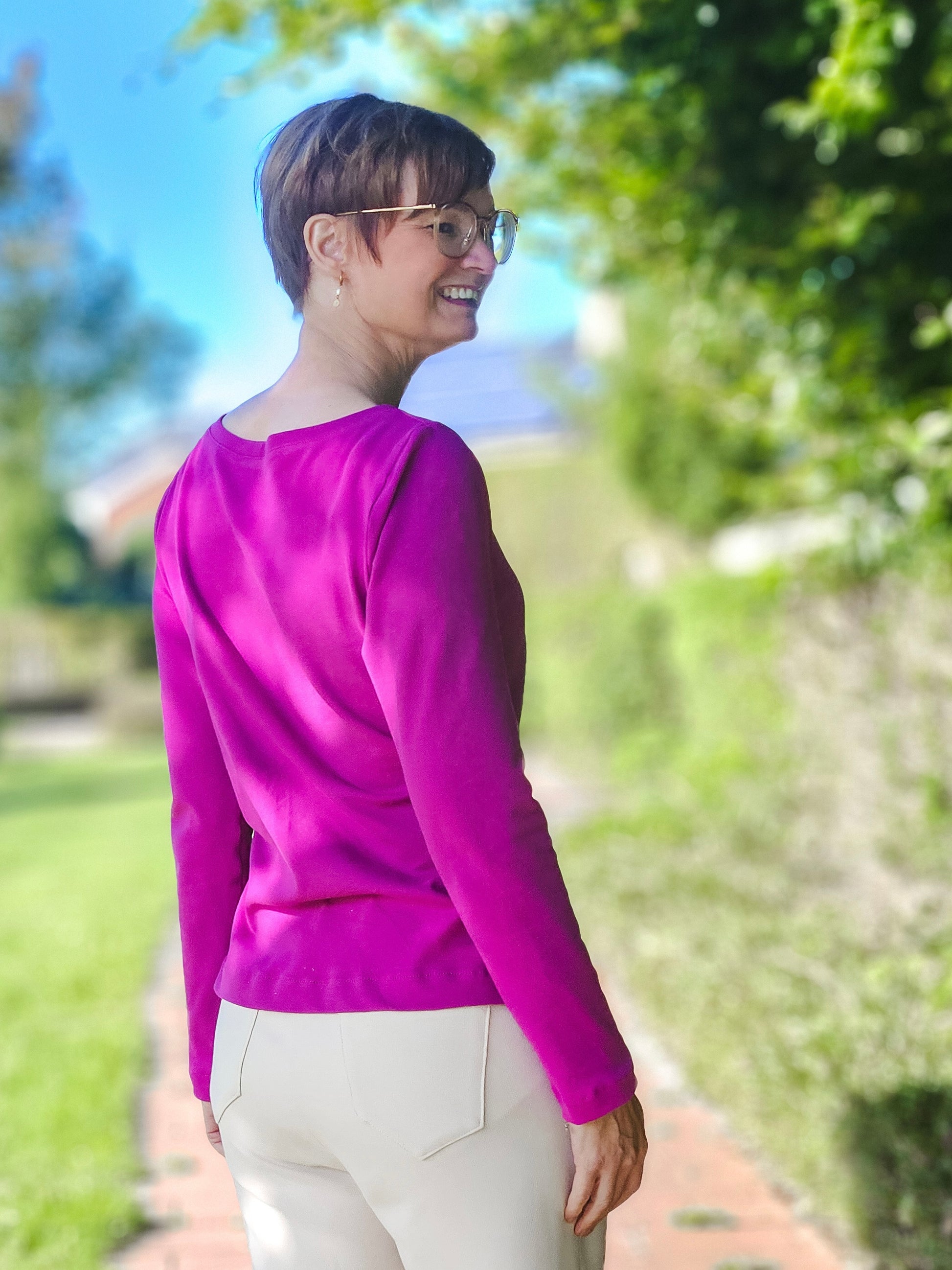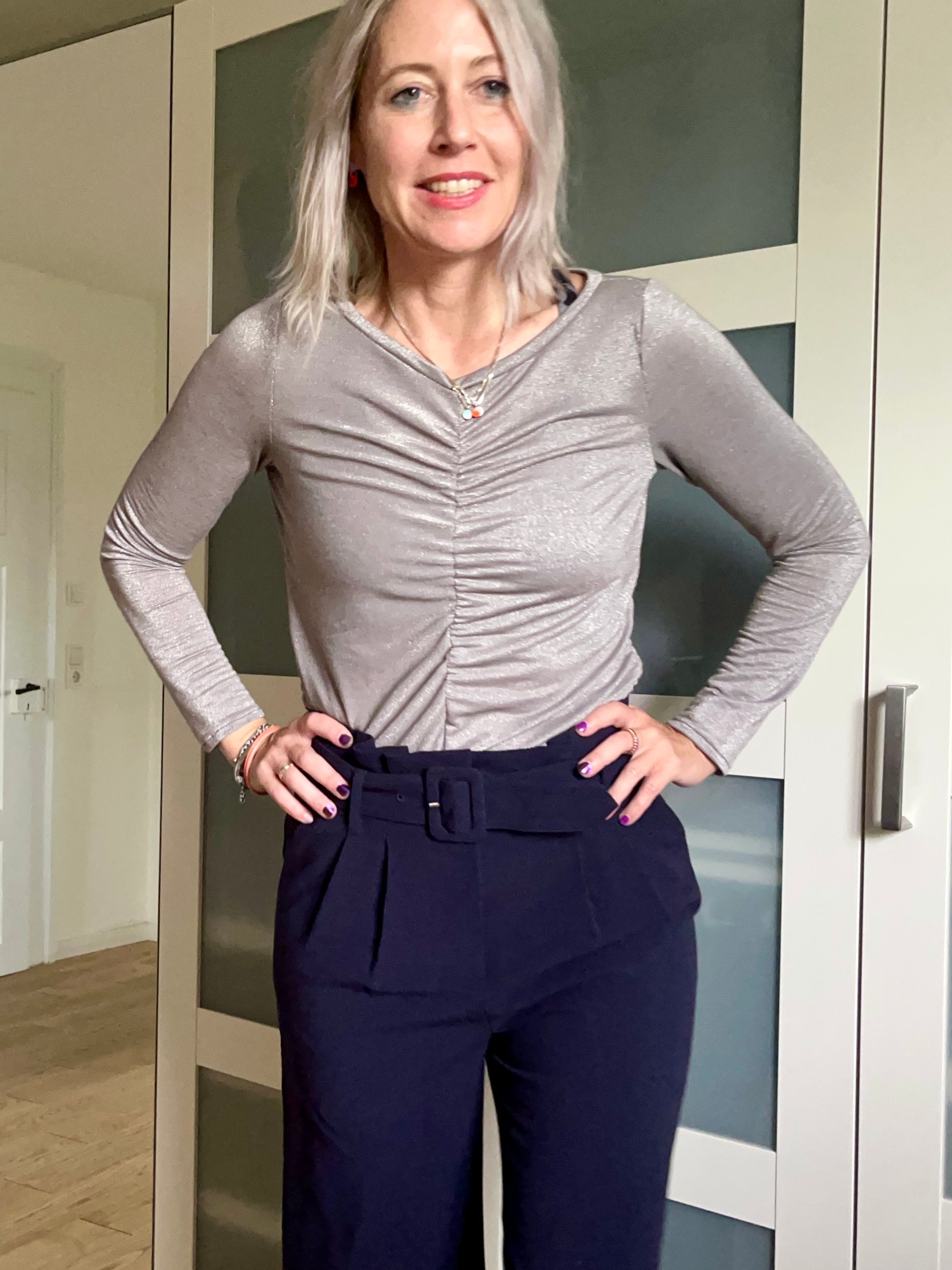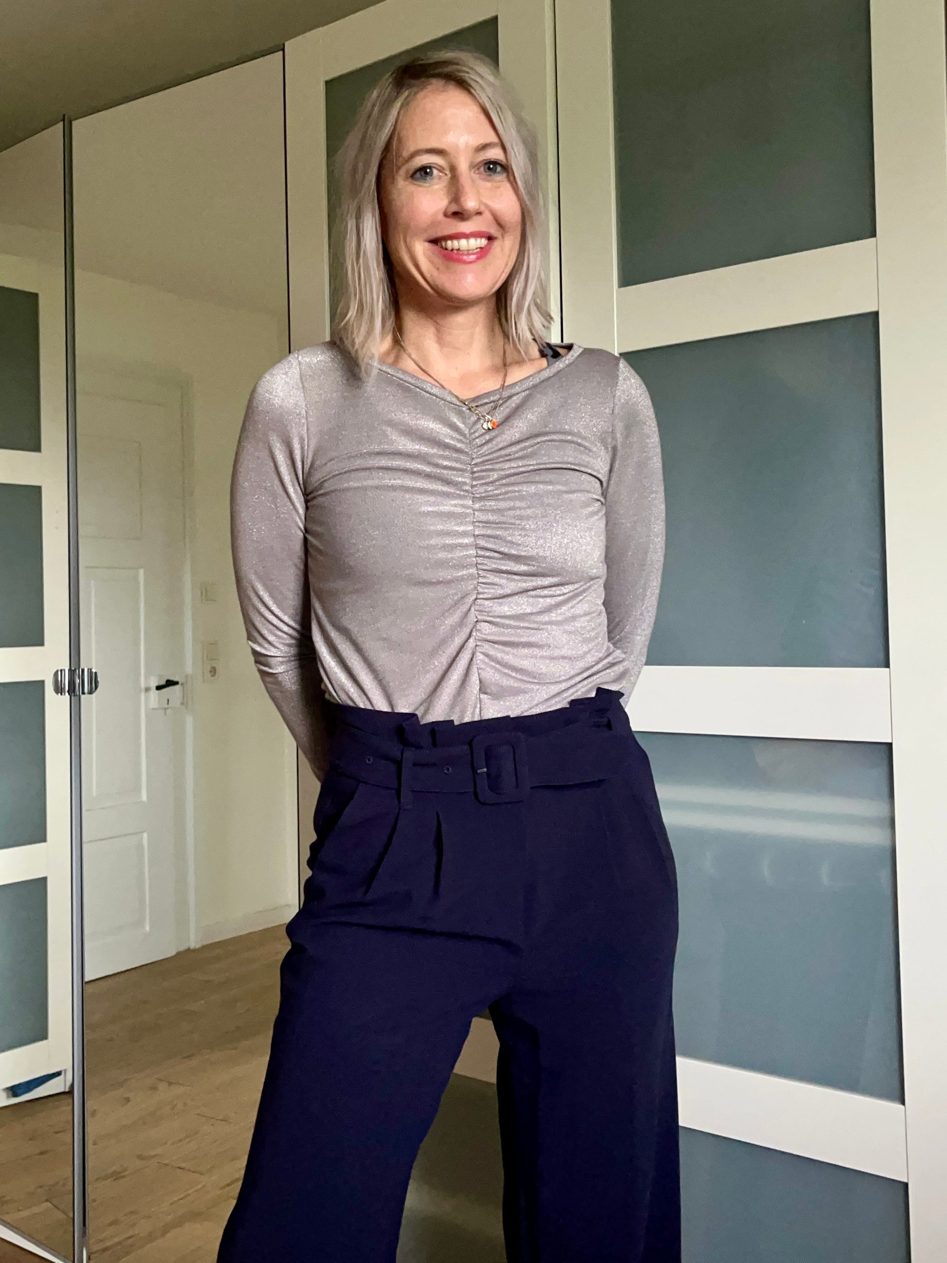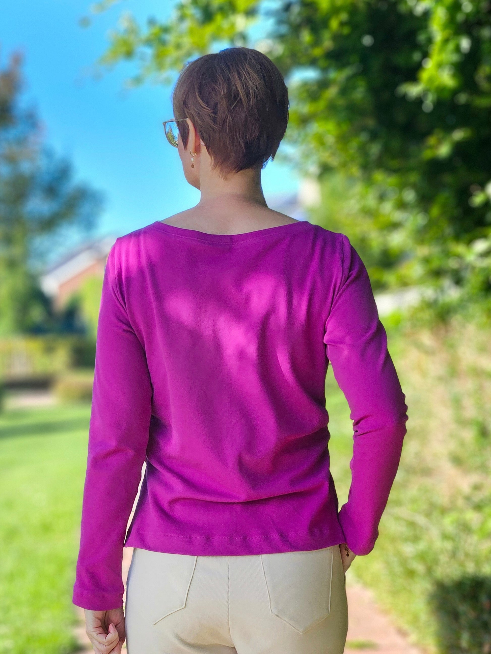 Die Ärmel und der Rücken bleiben bewusst klassisch gehalten, damit der Fokus ganz auf dem besonderen Front-Design liegt. Und wer das Ganze in Glitzerjersey näht, braucht keine Accessoires mehr – dieses Shirt glänzt einfach für sich!
