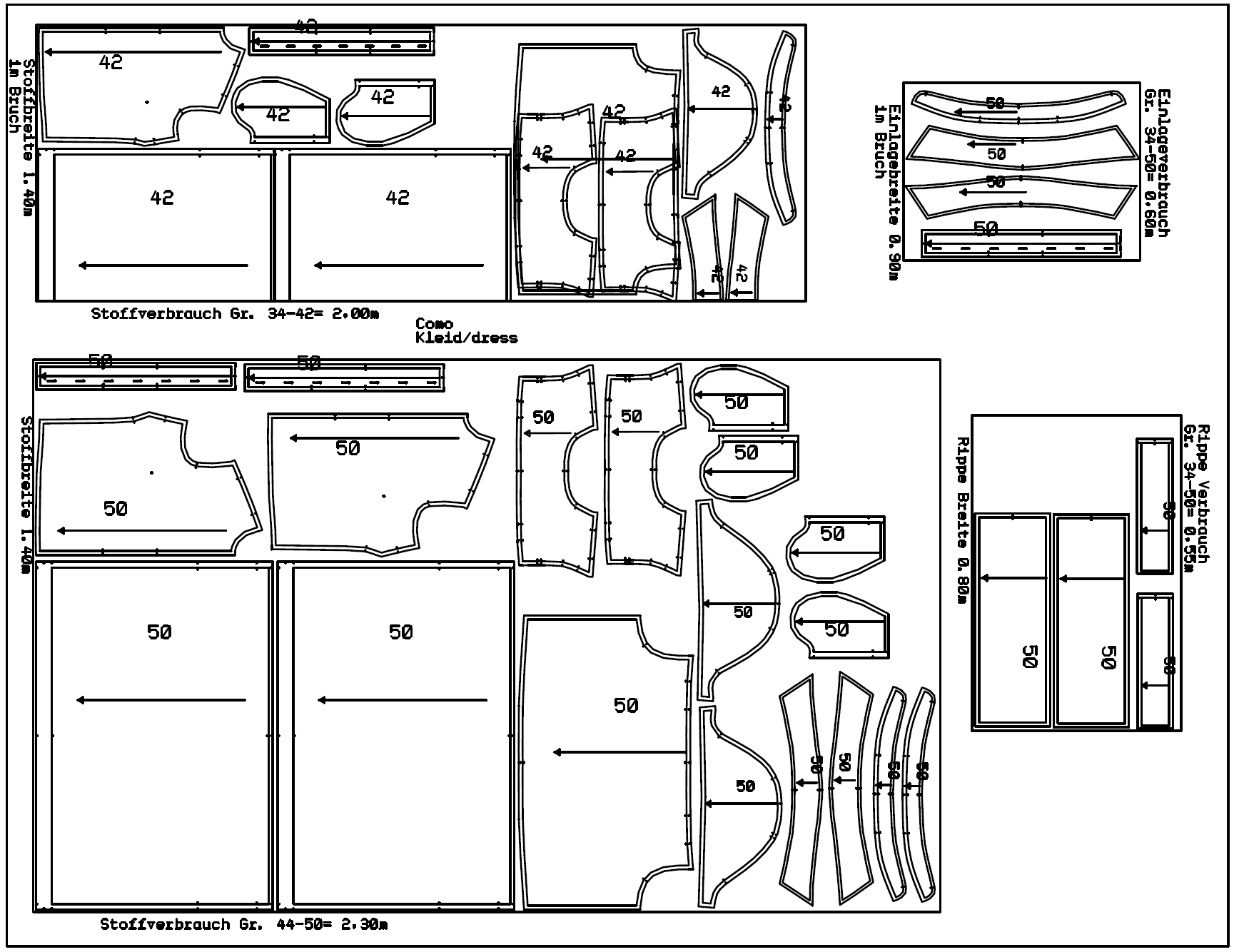 Natürlich ändert sich dein Stoffverbrauch je nach gewünschter Kleidlänge. Unsere Variante ist knielang und der Stoffverbrauch liegt bei 2 m (Gr. 34-42) bzw. 2,30m (Gr. 44-50).