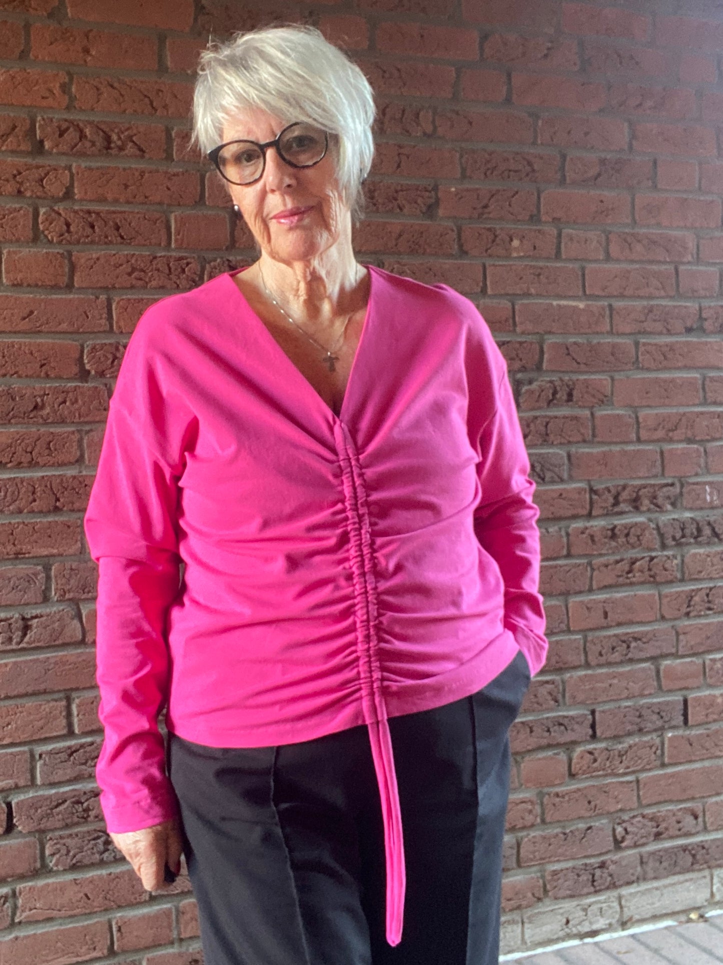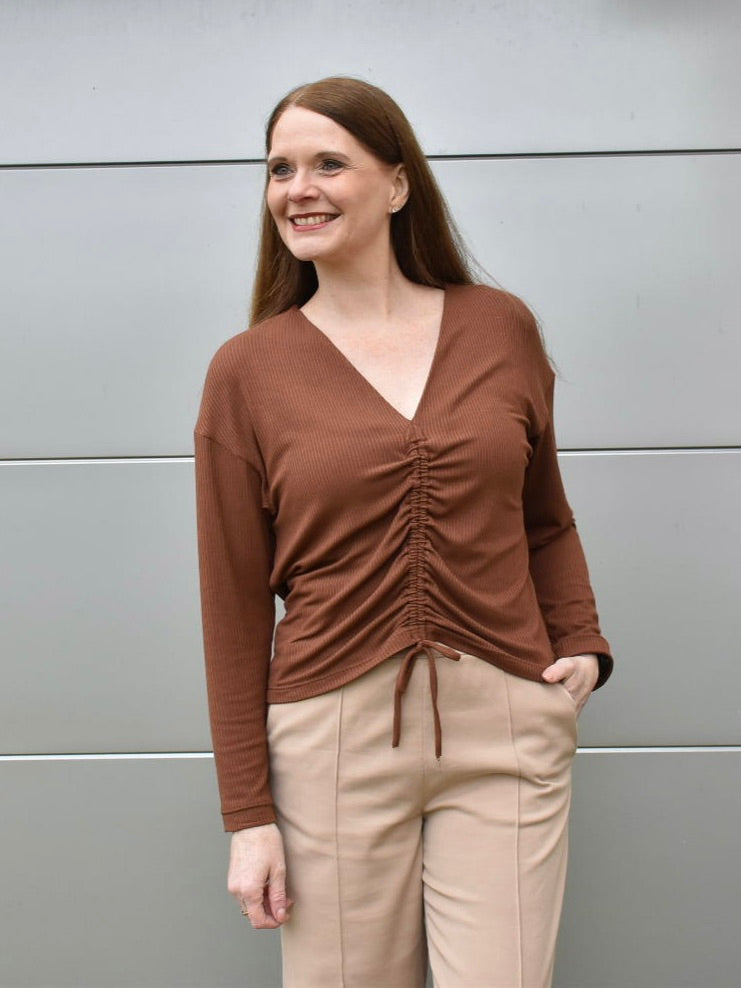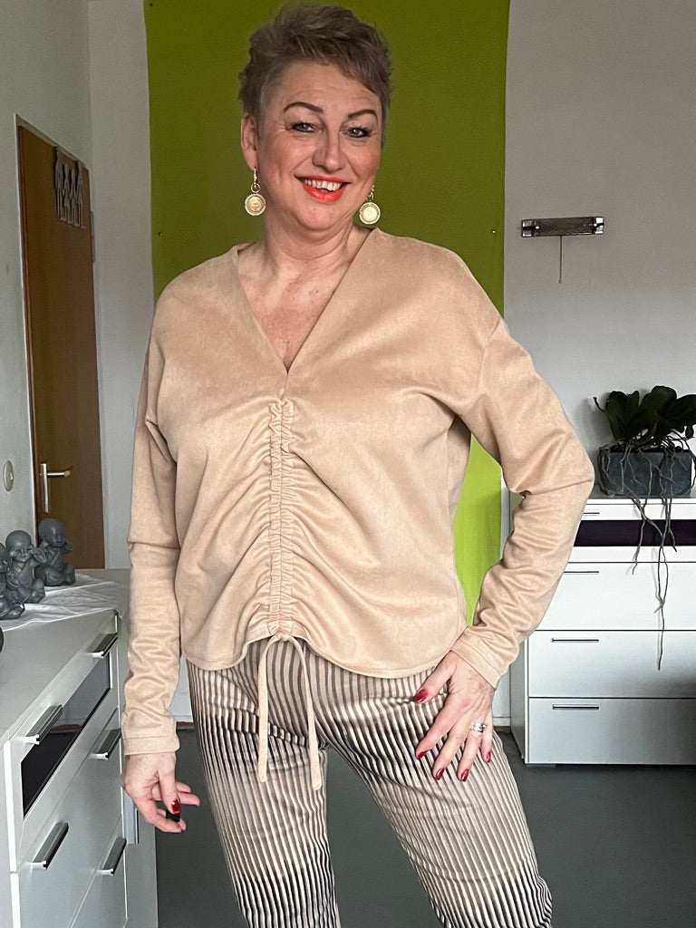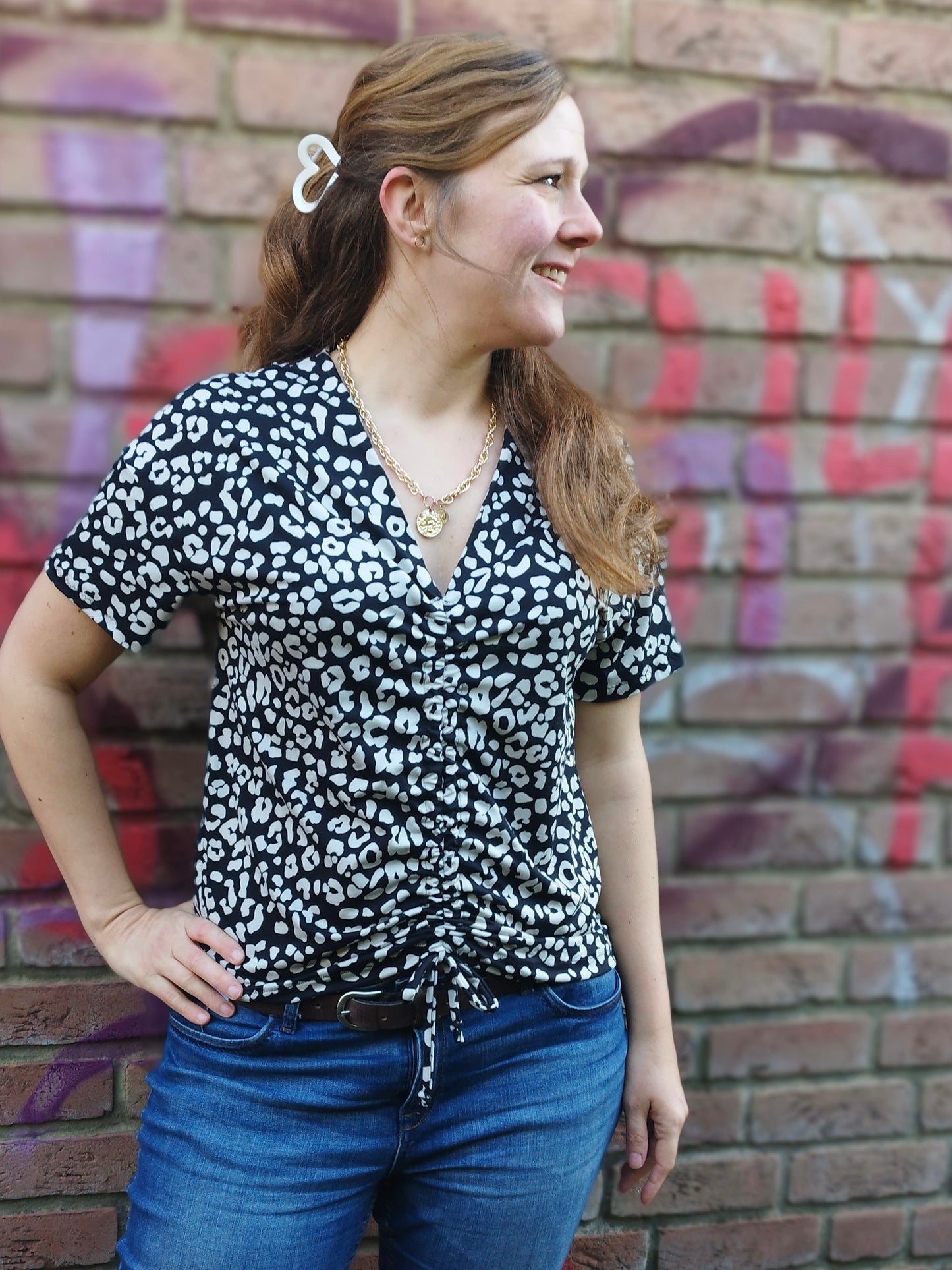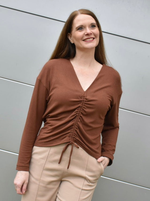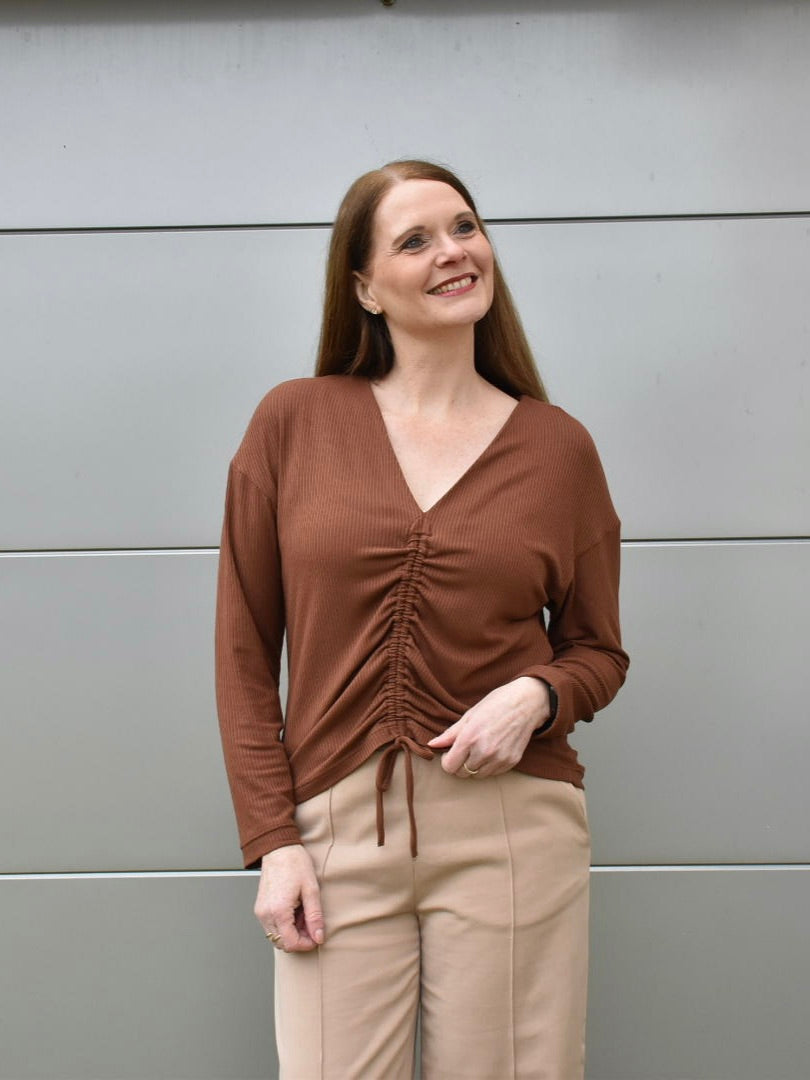 Der Tunnel für die Raffung beginnt direkt unter dem V-Ausschnitt und zieht sich durch die vordere Mitte.
