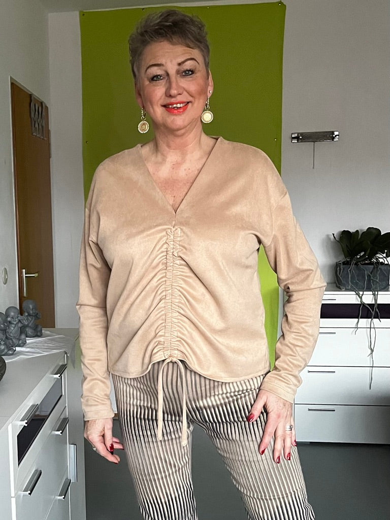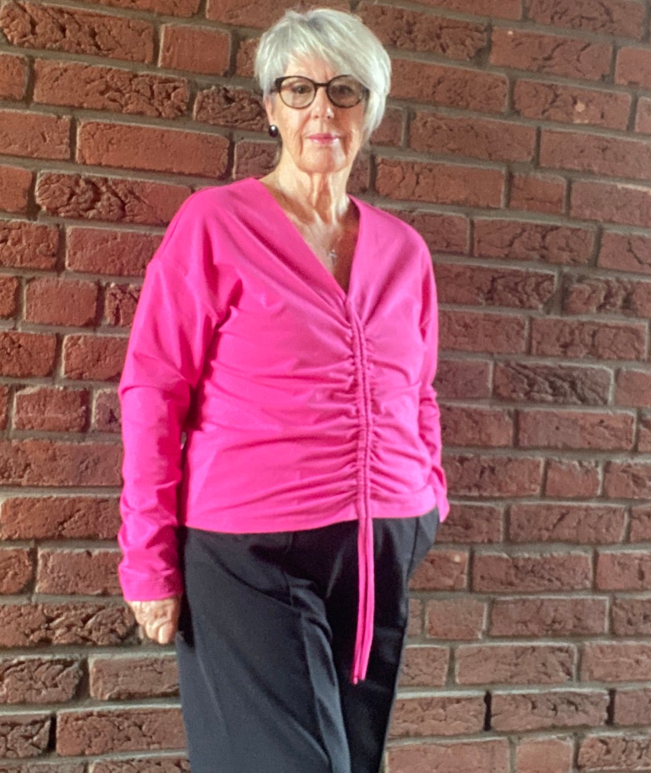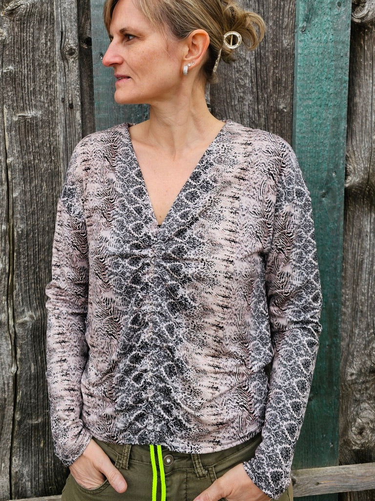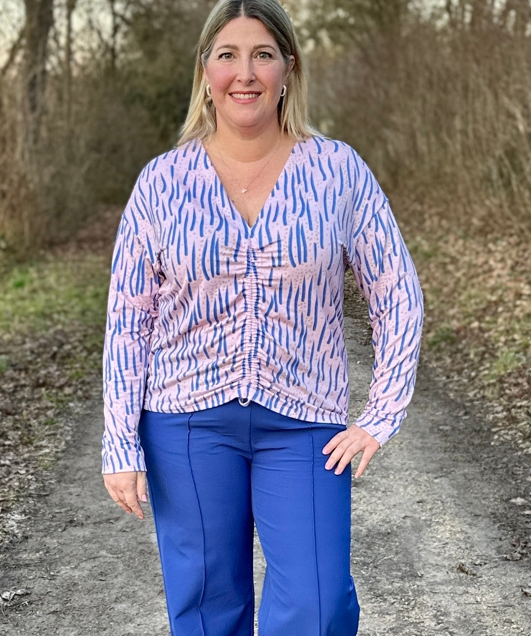 Der Tunnel für die Raffung beginnt direkt unter dem V-Ausschnitt und zieht sich durch die vordere Mitte.
