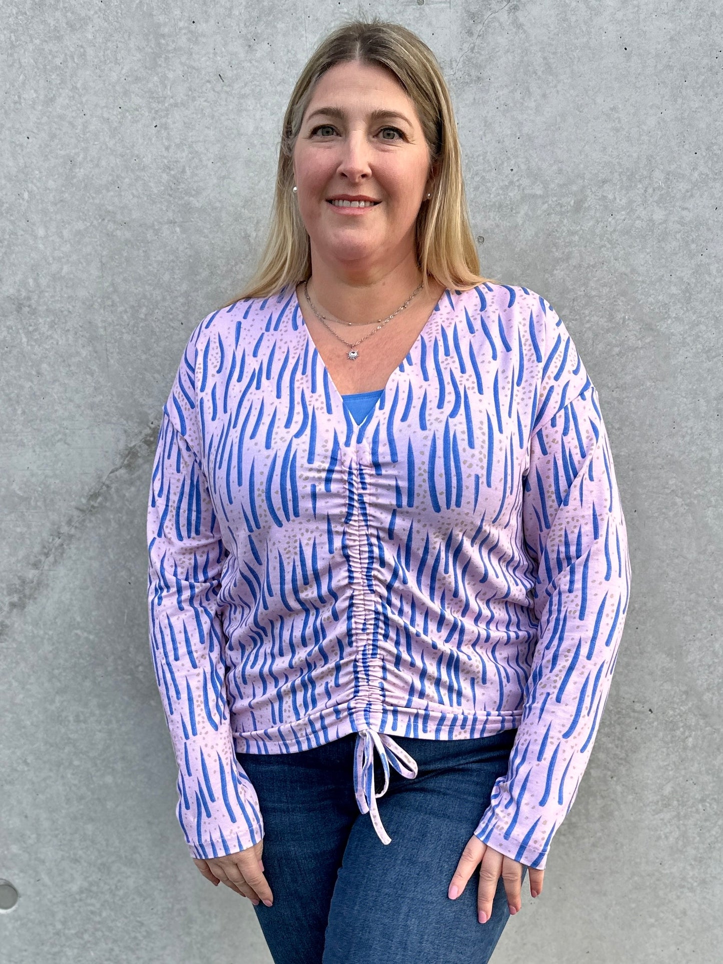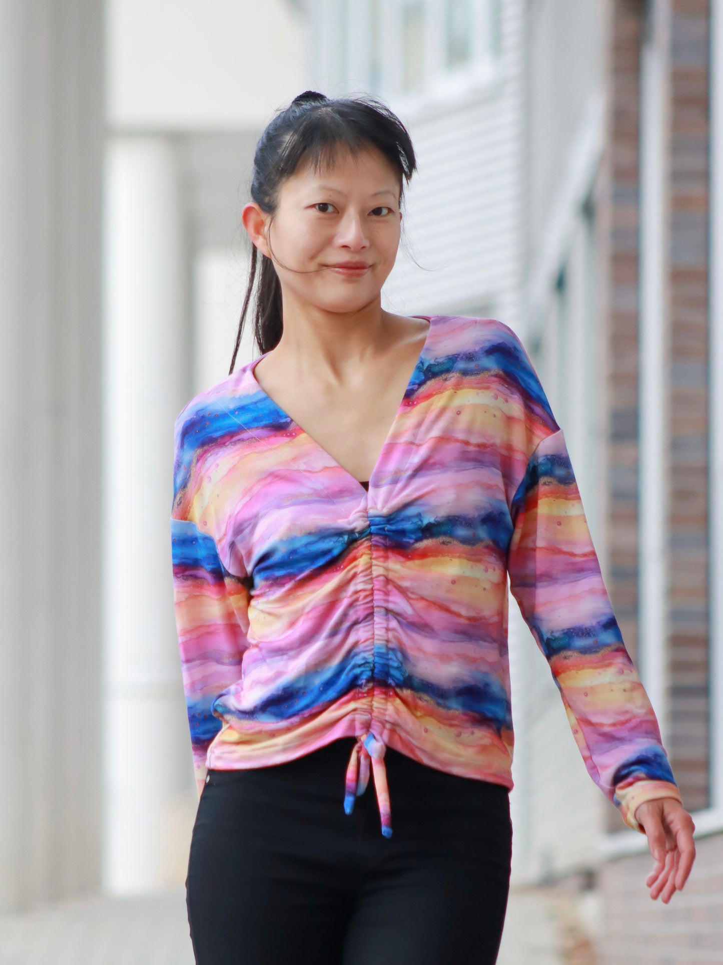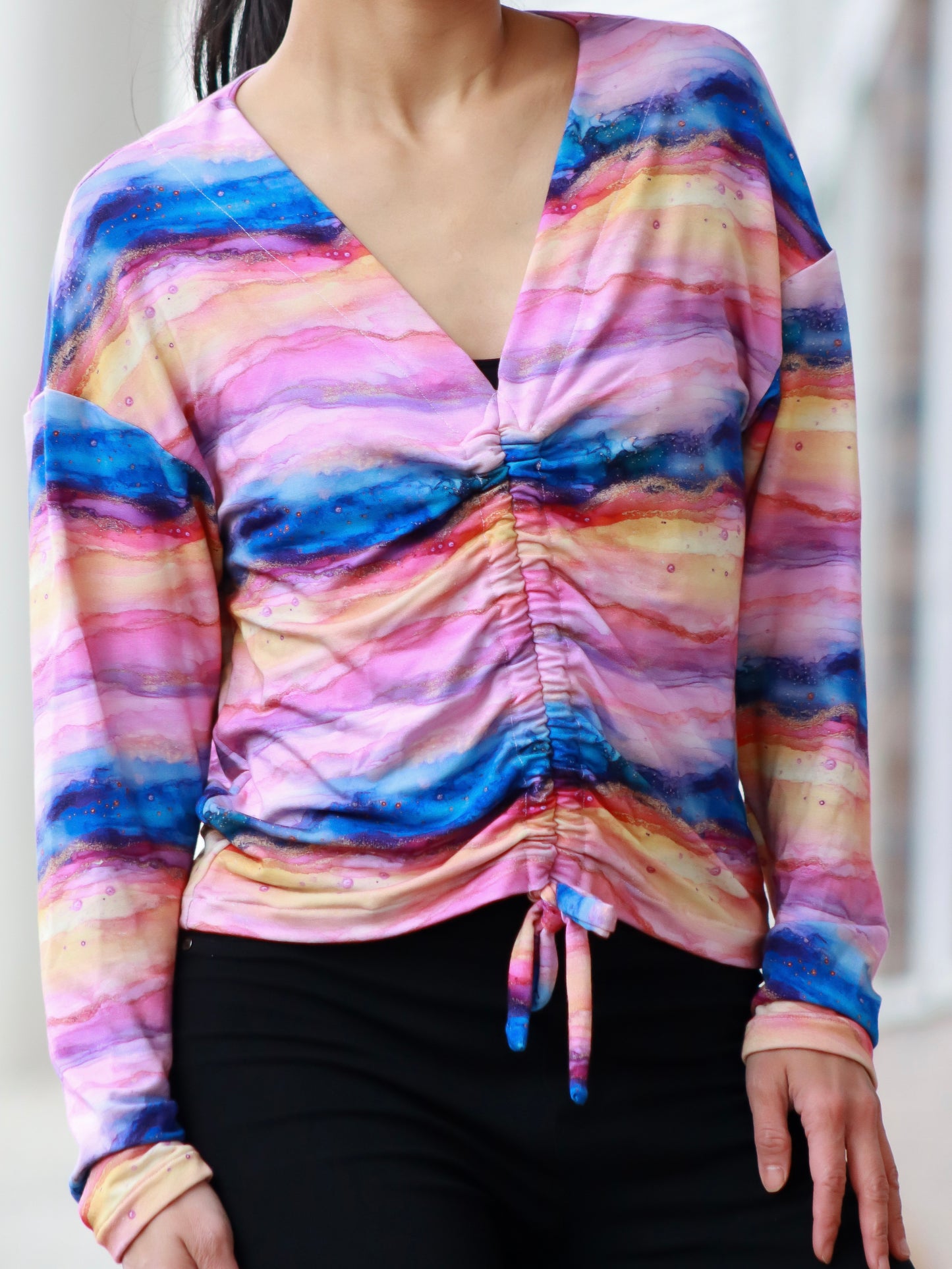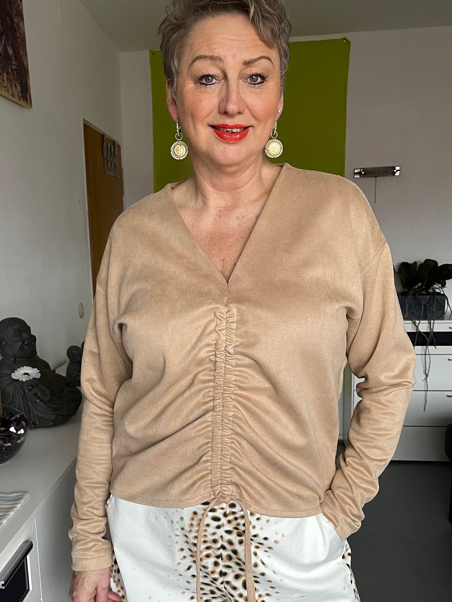 Der Tunnel für die Raffung beginnt direkt unter dem V-Ausschnitt und zieht sich durch die vordere Mitte.
