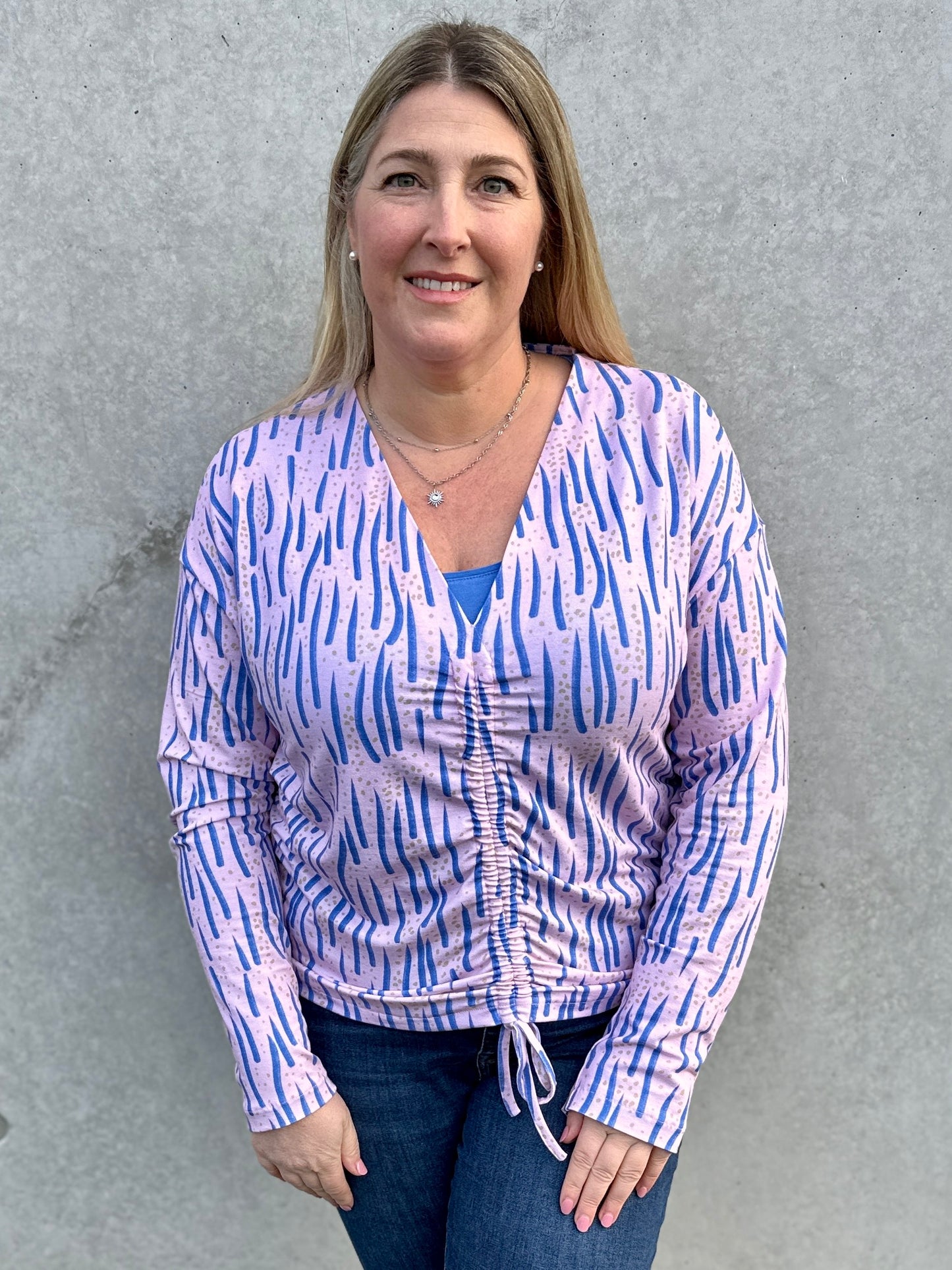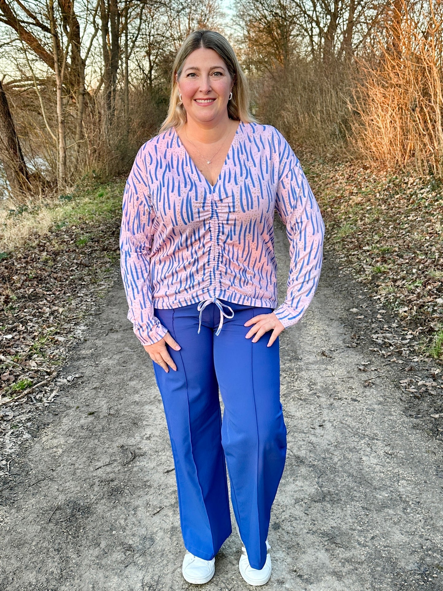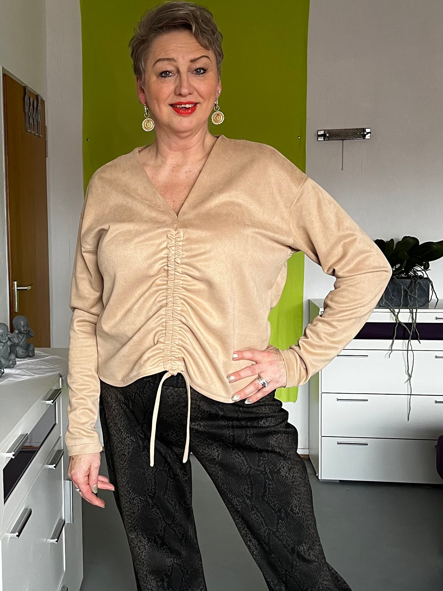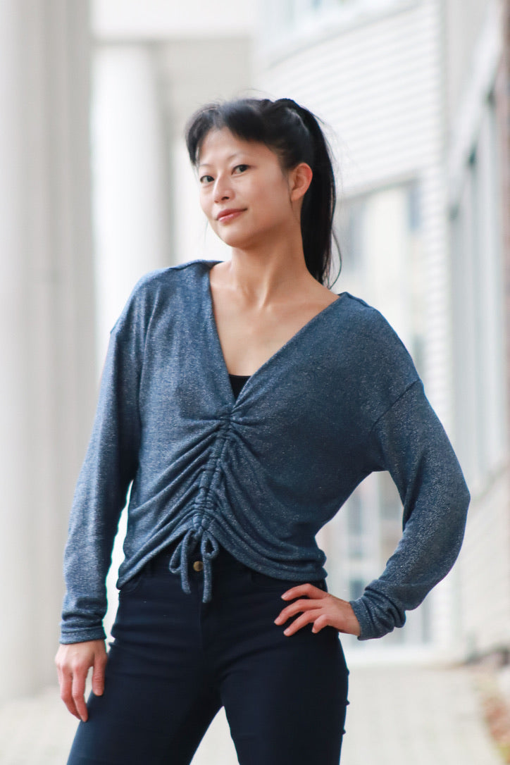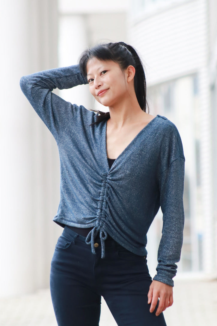 Der Tunnel für die Raffung beginnt direkt unter dem V-Ausschnitt und zieht sich durch die vordere Mitte.