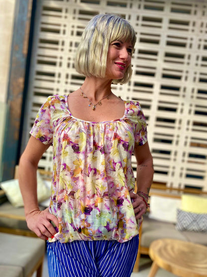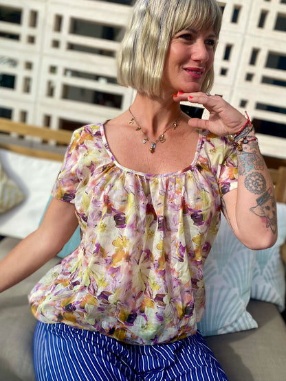 Das Shirt wird oben eingekraust und sorgt so für eine tolle Silhouette, während ein Gummiband im Saum das Pluder-Shirt perfekt in Form bringt.
