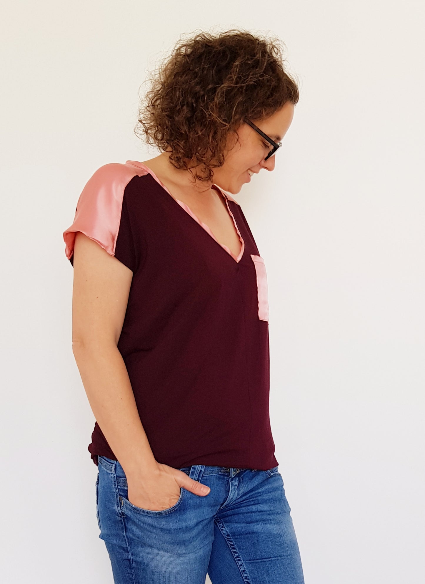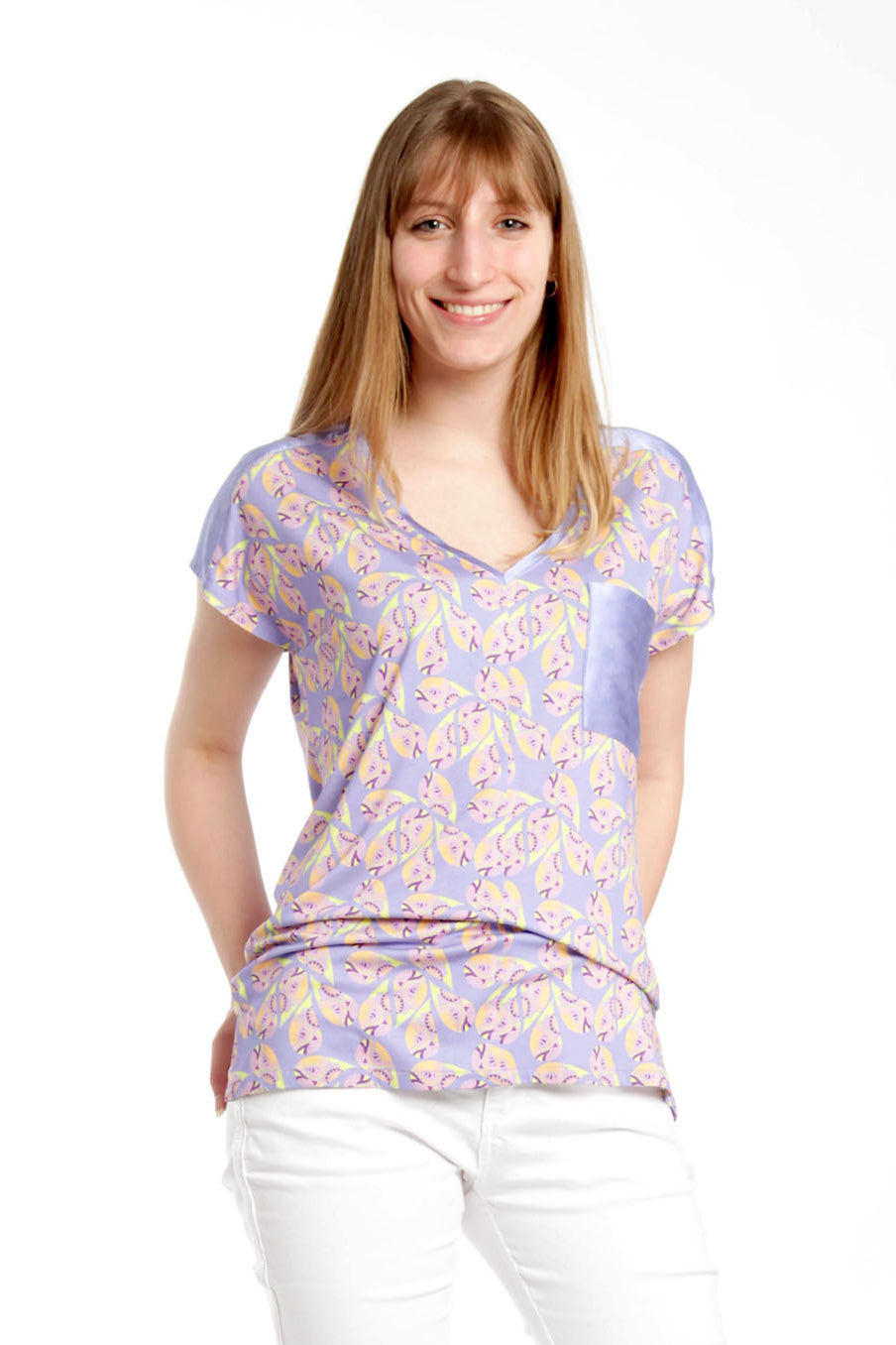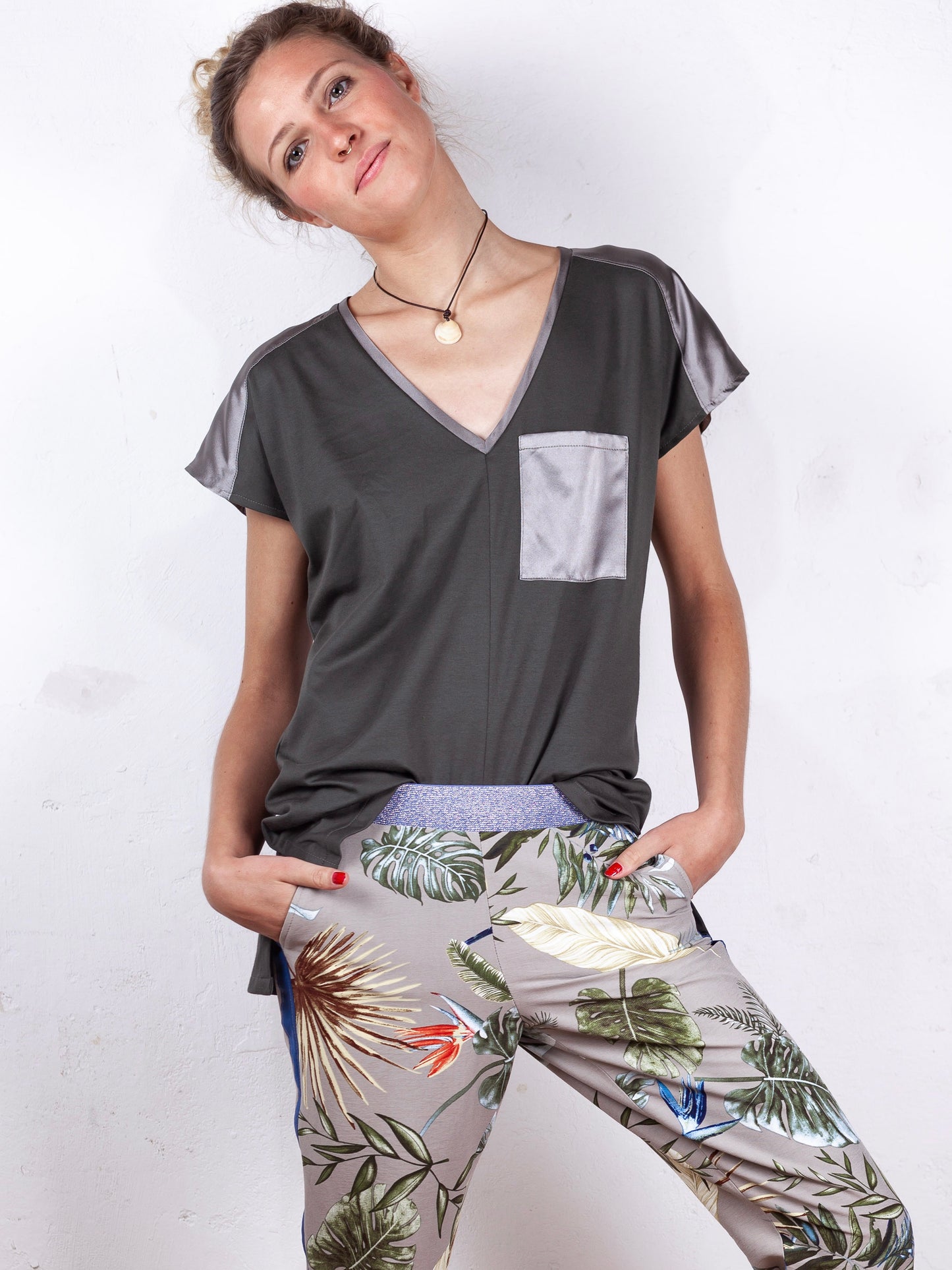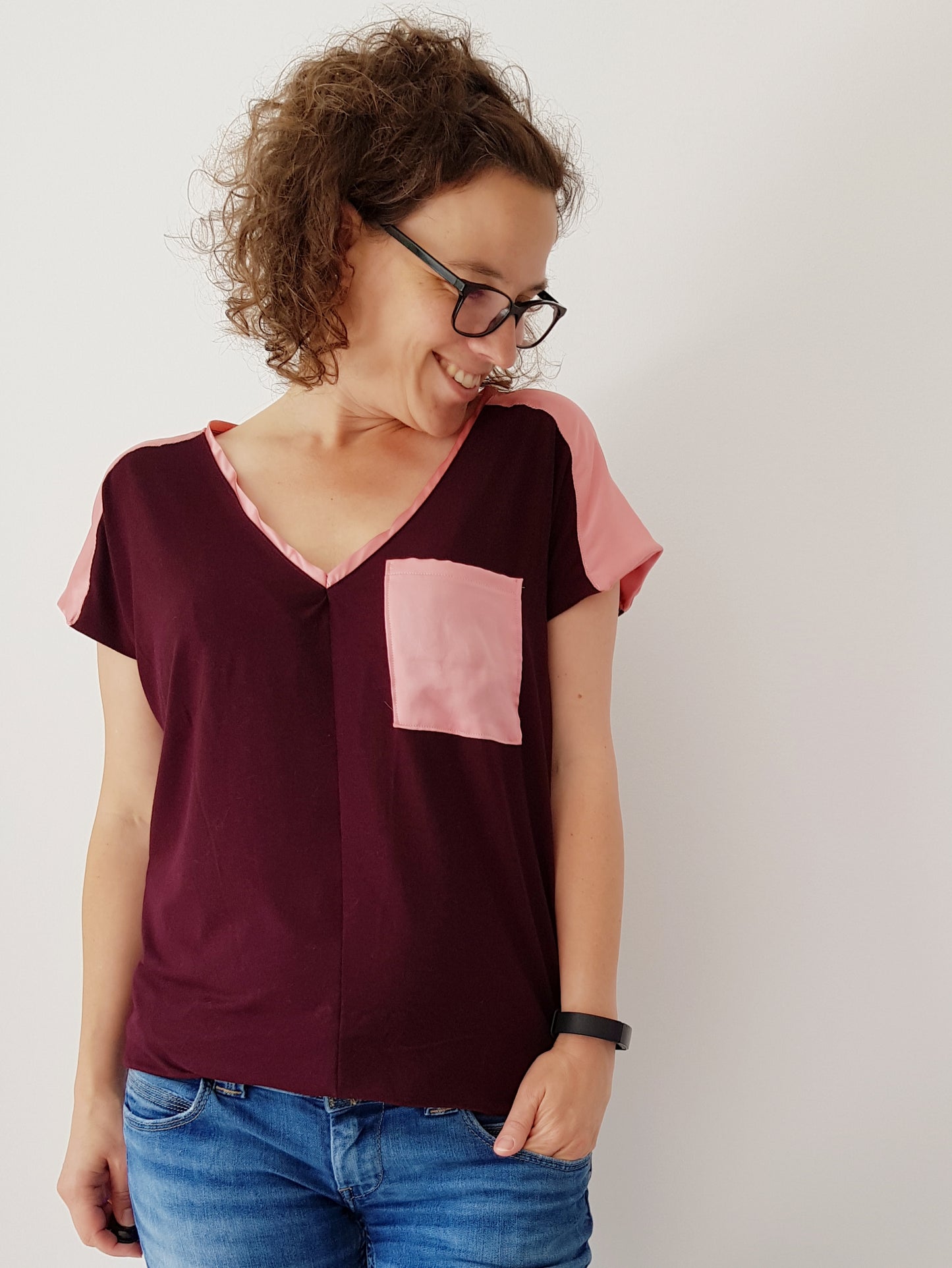 Wer denkt, Shirt ist doch gleich Shirt, sieht am Beispiel unseres Schnittmusters Olga, dass es auch in diesem Bereich unglaublich viele Varianten gibt. Wir sind unserer Liebe zum Patchen von verschiedenen Stoffen auch diesmal treu geblieben und haben daraus ein tolles und lässiges Shirt mit überschnittenen Schultern entworfen. Die Besonderheit liegt wie immer im Detail: die einteilige Schulterpasse, die aufgesetzte Tasche und der schmale Streifen im V-Ausschnitt sind aus Kontraststoff gefertigt.