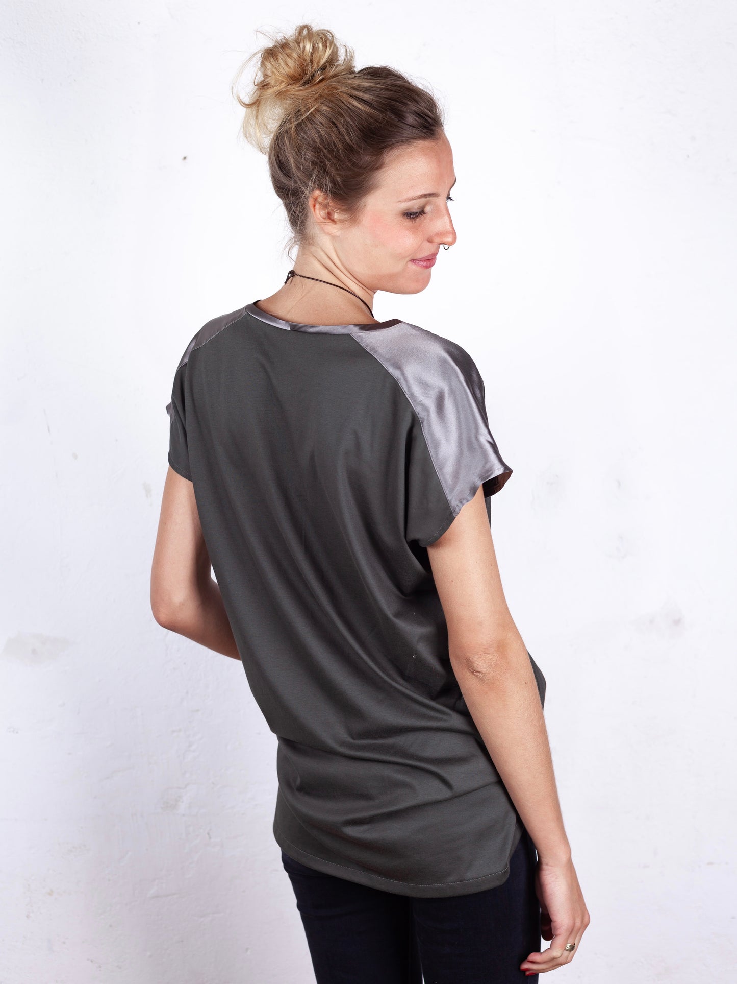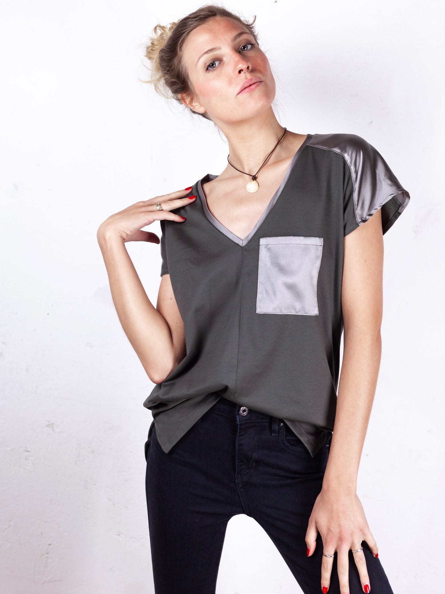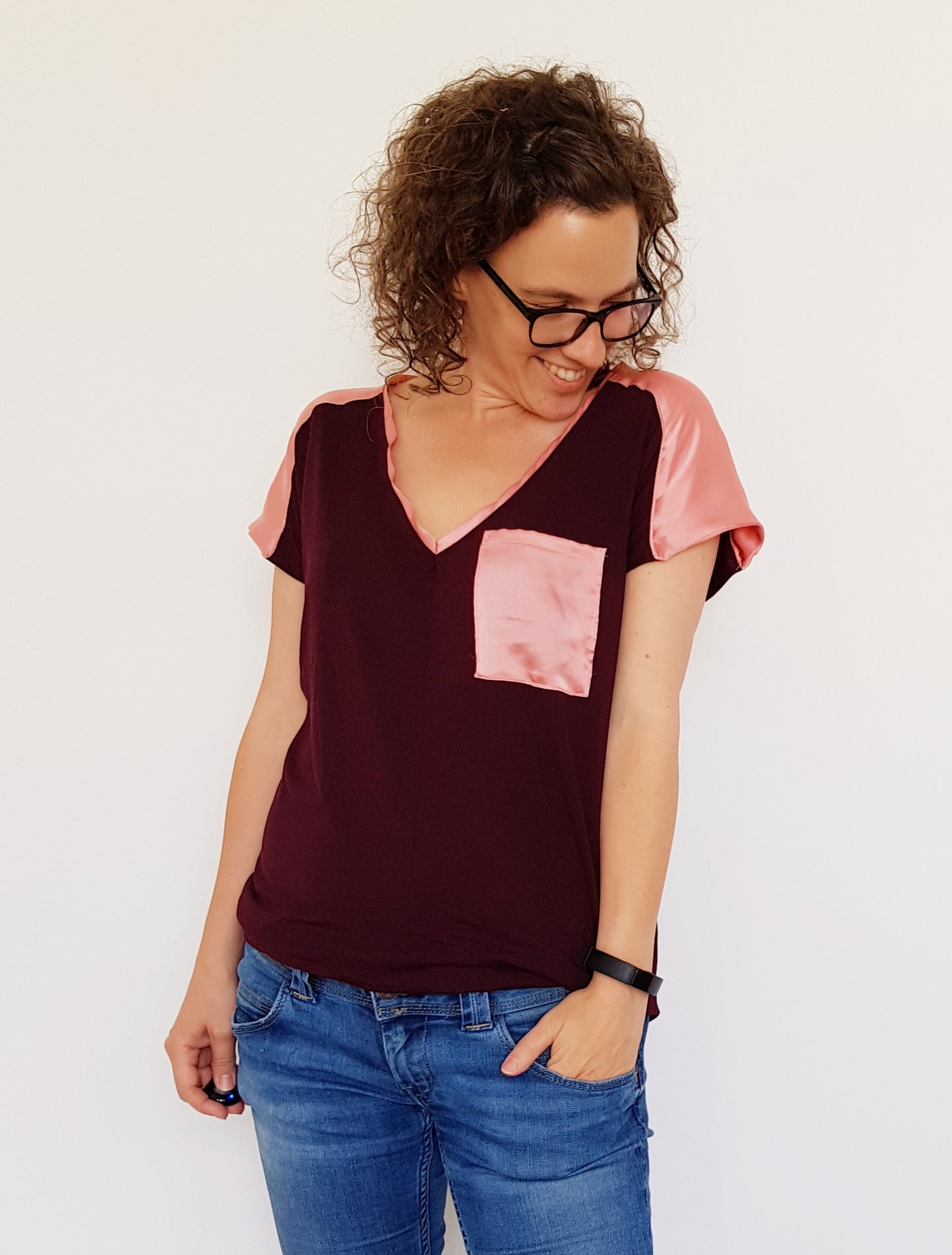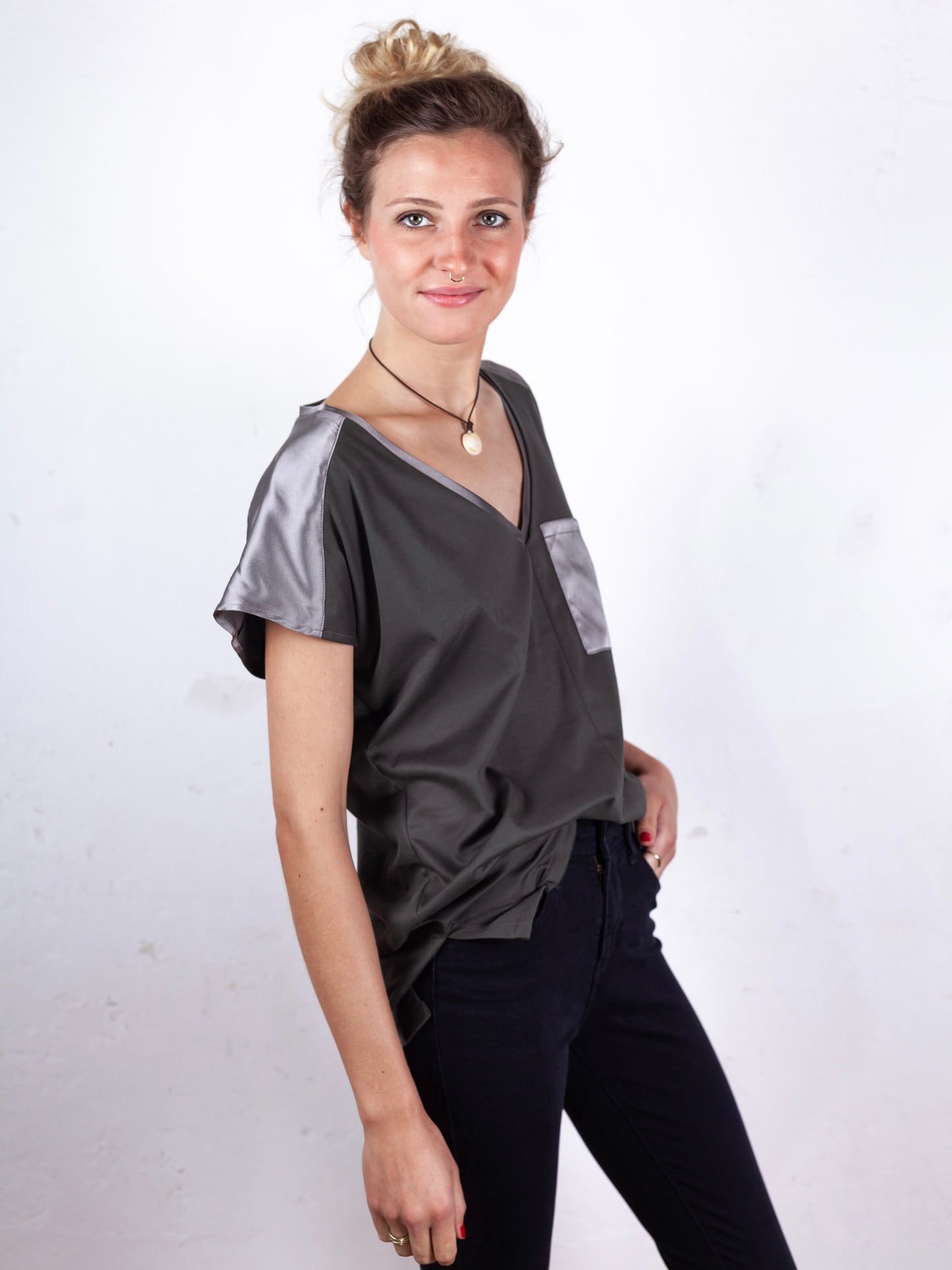 Wer denkt, Shirt ist doch gleich Shirt, sieht am Beispiel unseres Schnittmusters Olga, dass es auch in diesem Bereich unglaublich viele Varianten gibt. Wir sind unserer Liebe zum Patchen von verschiedenen Stoffen auch diesmal treu geblieben und haben daraus ein tolles und lässiges Shirt mit überschnittenen Schultern entworfen. Die Besonderheit liegt wie immer im Detail: die einteilige Schulterpasse, die aufgesetzte Tasche und der schmale Streifen im V-Ausschnitt sind aus Kontraststoff gefertigt.