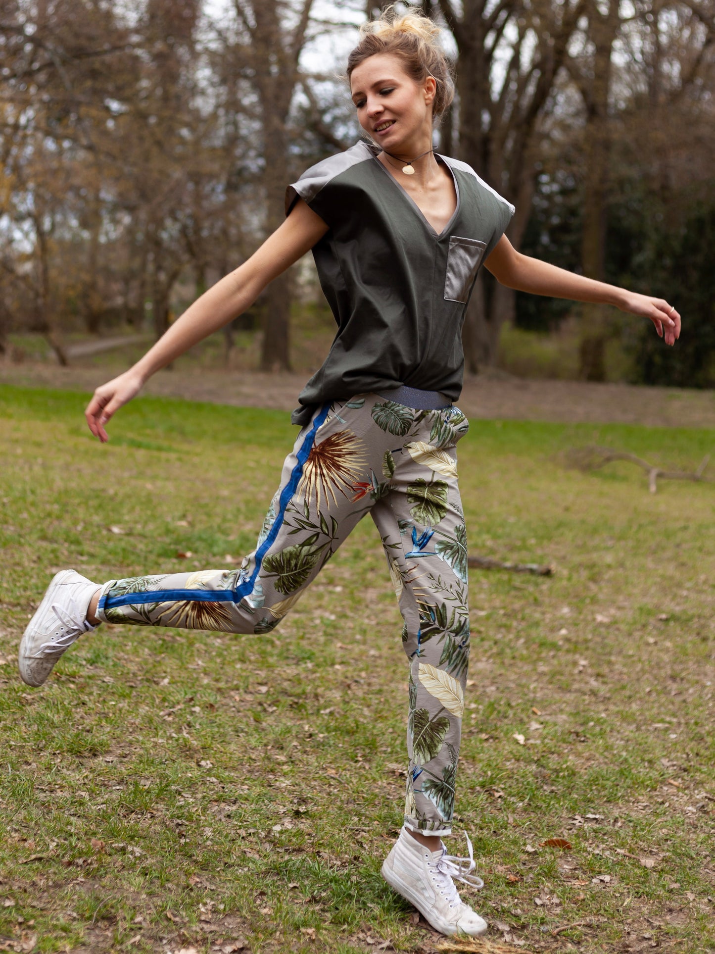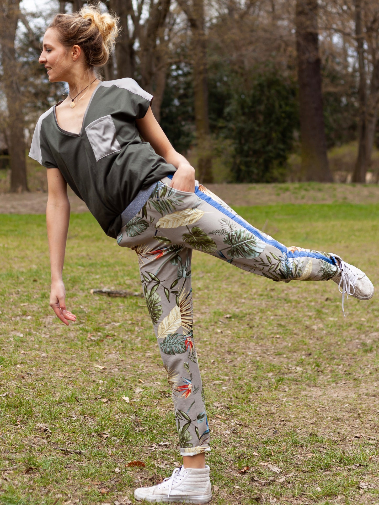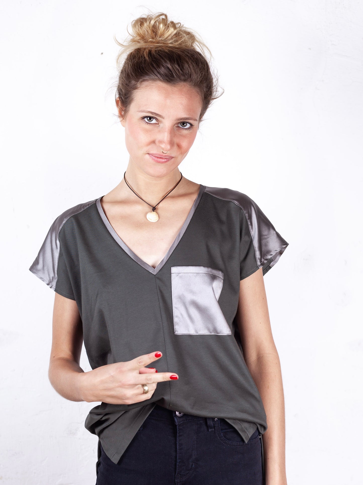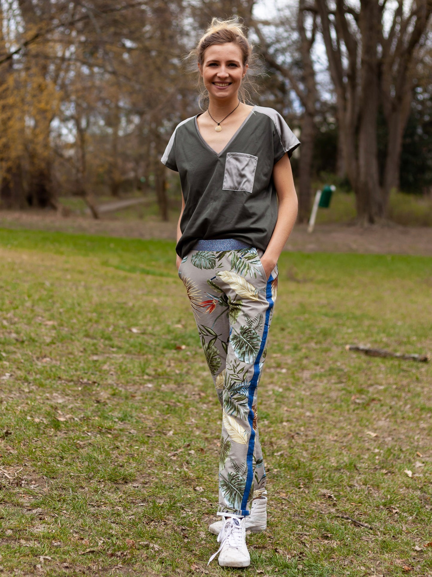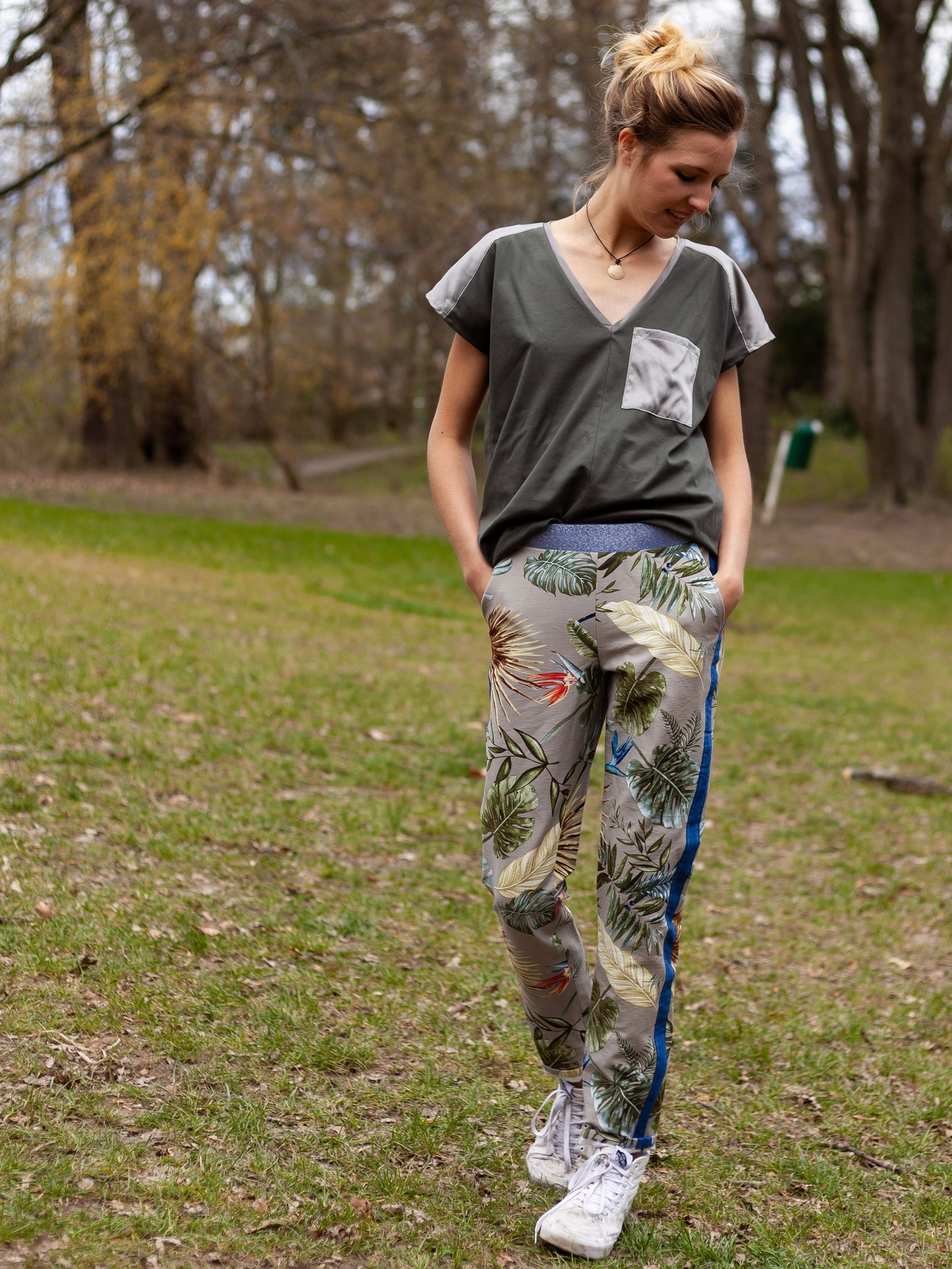 Wer denkt, Shirt ist doch gleich Shirt, sieht am Beispiel unseres Schnittmusters Olga, dass es auch in diesem Bereich unglaublich viele Varianten gibt. Wir sind unserer Liebe zum Patchen von verschiedenen Stoffen auch diesmal treu geblieben und haben daraus ein tolles und lässiges Shirt mit überschnittenen Schultern entworfen. Die Besonderheit liegt wie immer im Detail: die einteilige Schulterpasse, die aufgesetzte Tasche und der schmale Streifen im V-Ausschnitt sind aus Kontraststoff gefertigt.