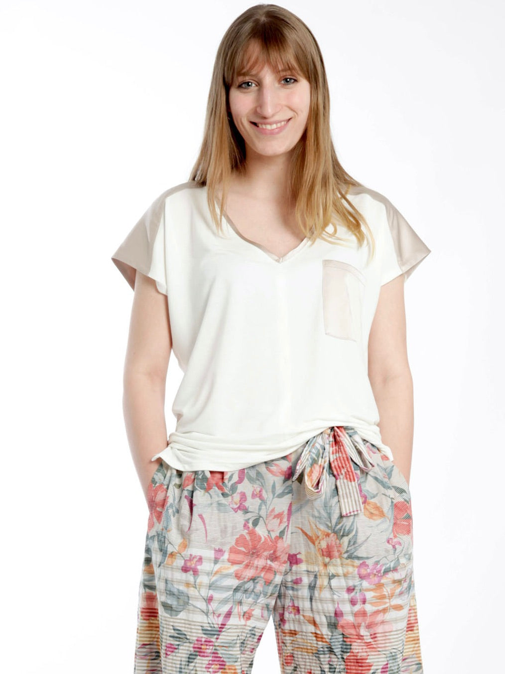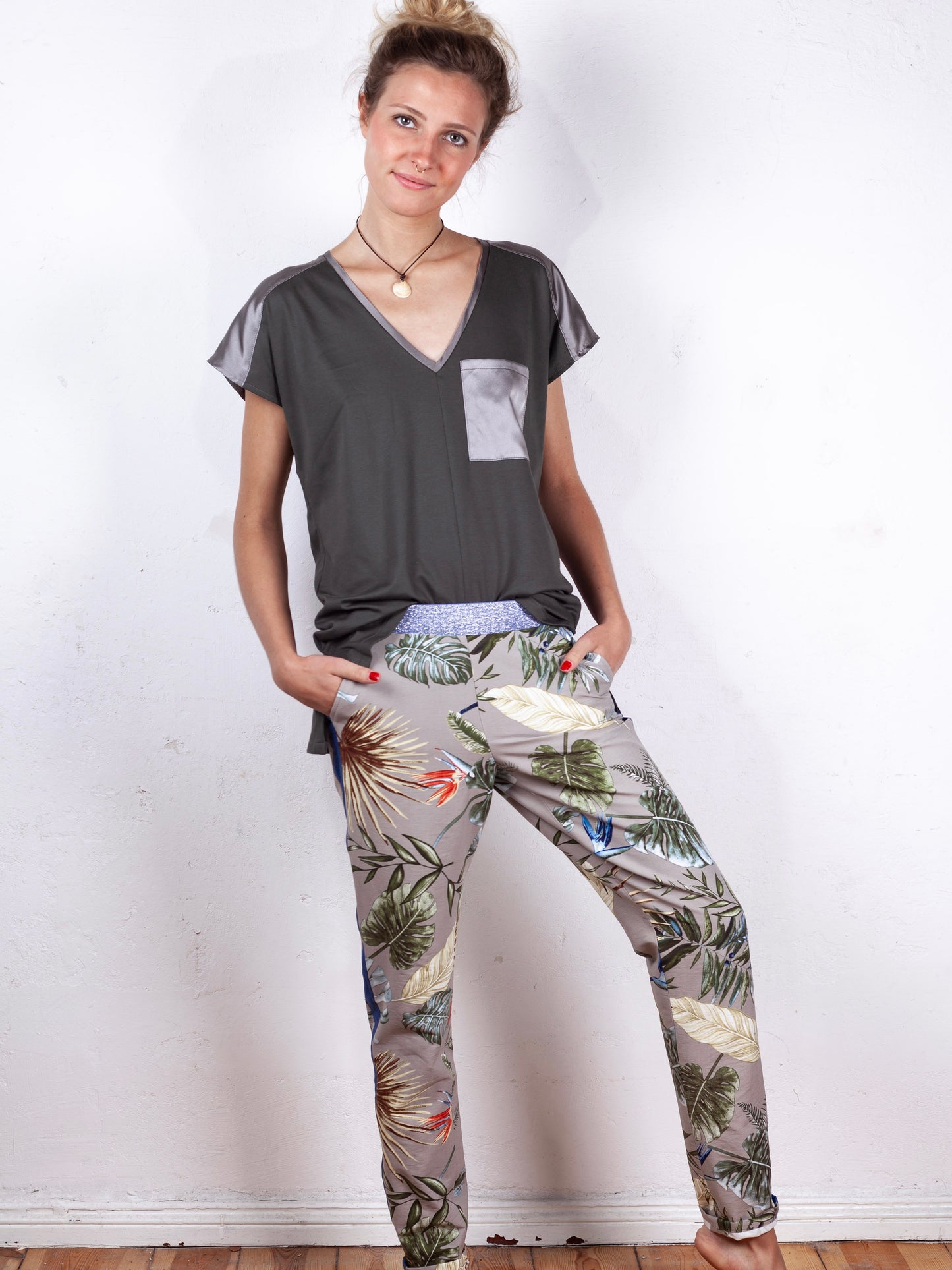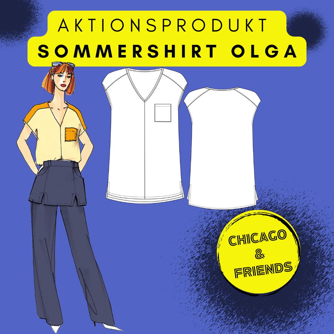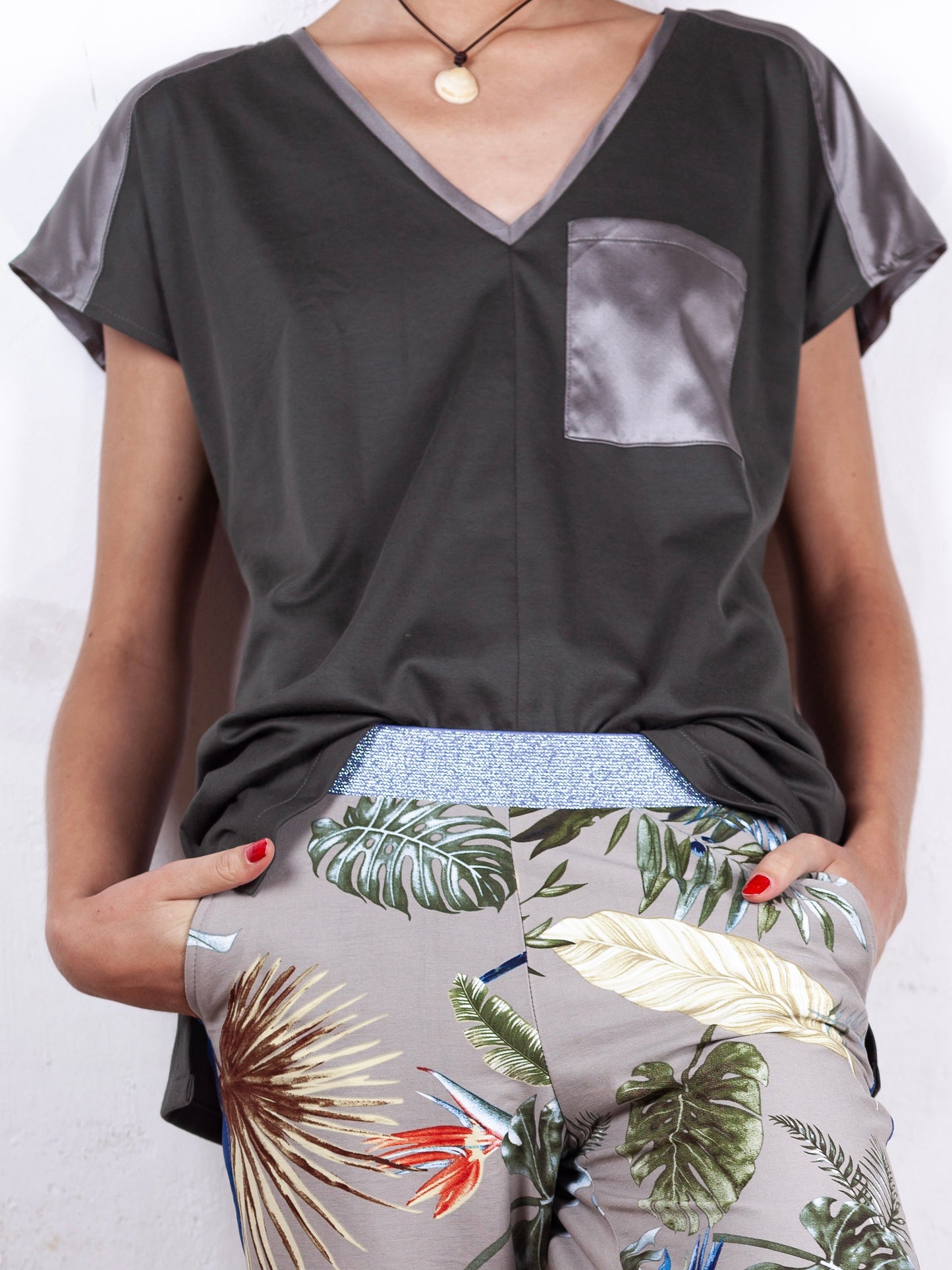 Wer denkt, Shirt ist doch gleich Shirt, sieht am Beispiel unseres Schnittmusters Olga, dass es auch in diesem Bereich unglaublich viele Varianten gibt. Wir sind unserer Liebe zum Patchen von verschiedenen Stoffen auch diesmal treu geblieben und haben daraus ein tolles und lässiges Shirt mit überschnittenen Schultern entworfen. Die Besonderheit liegt wie immer im Detail: die einteilige Schulterpasse, die aufgesetzte Tasche und der schmale Streifen im V-Ausschnitt sind aus Kontraststoff gefertigt.