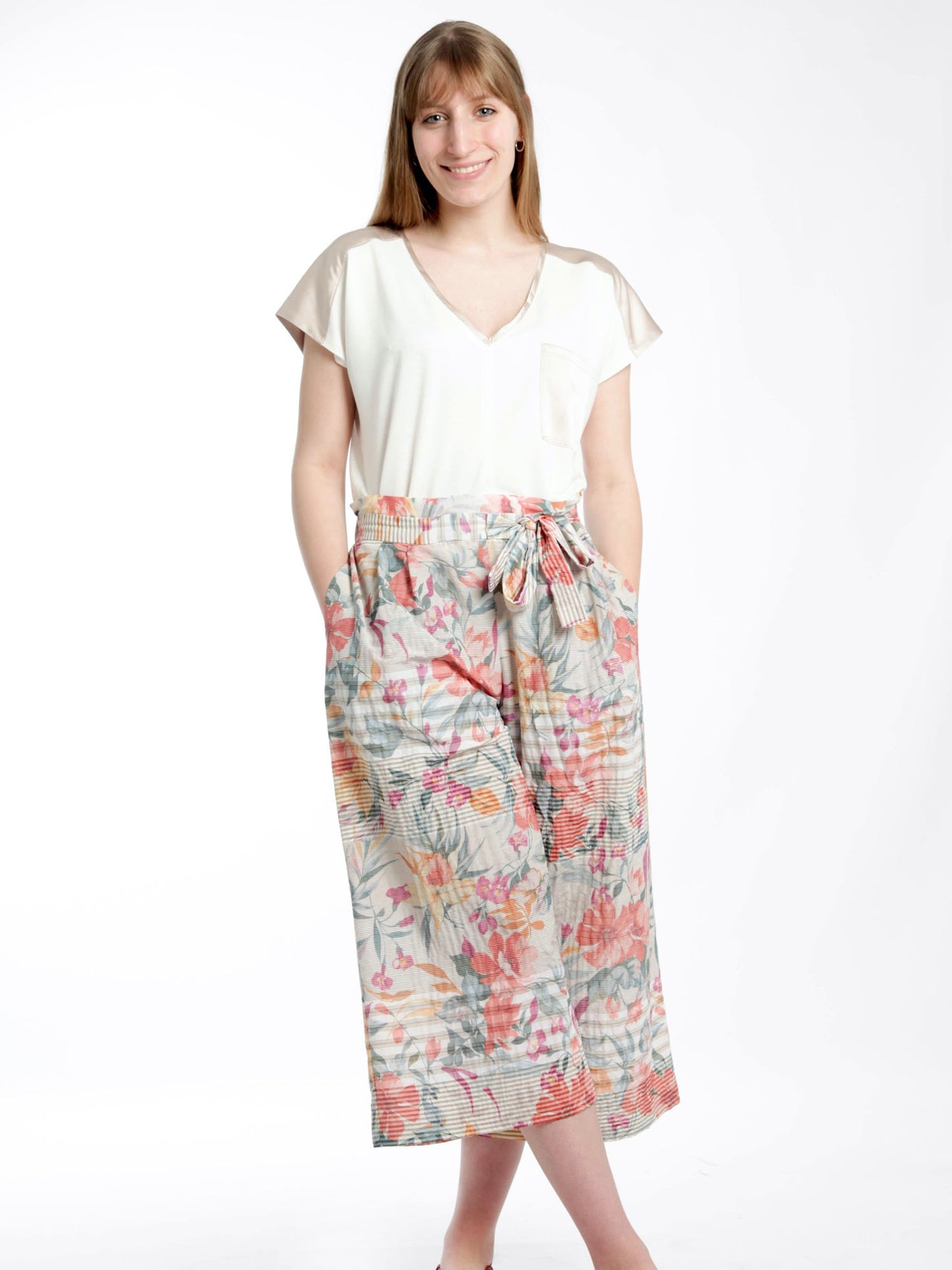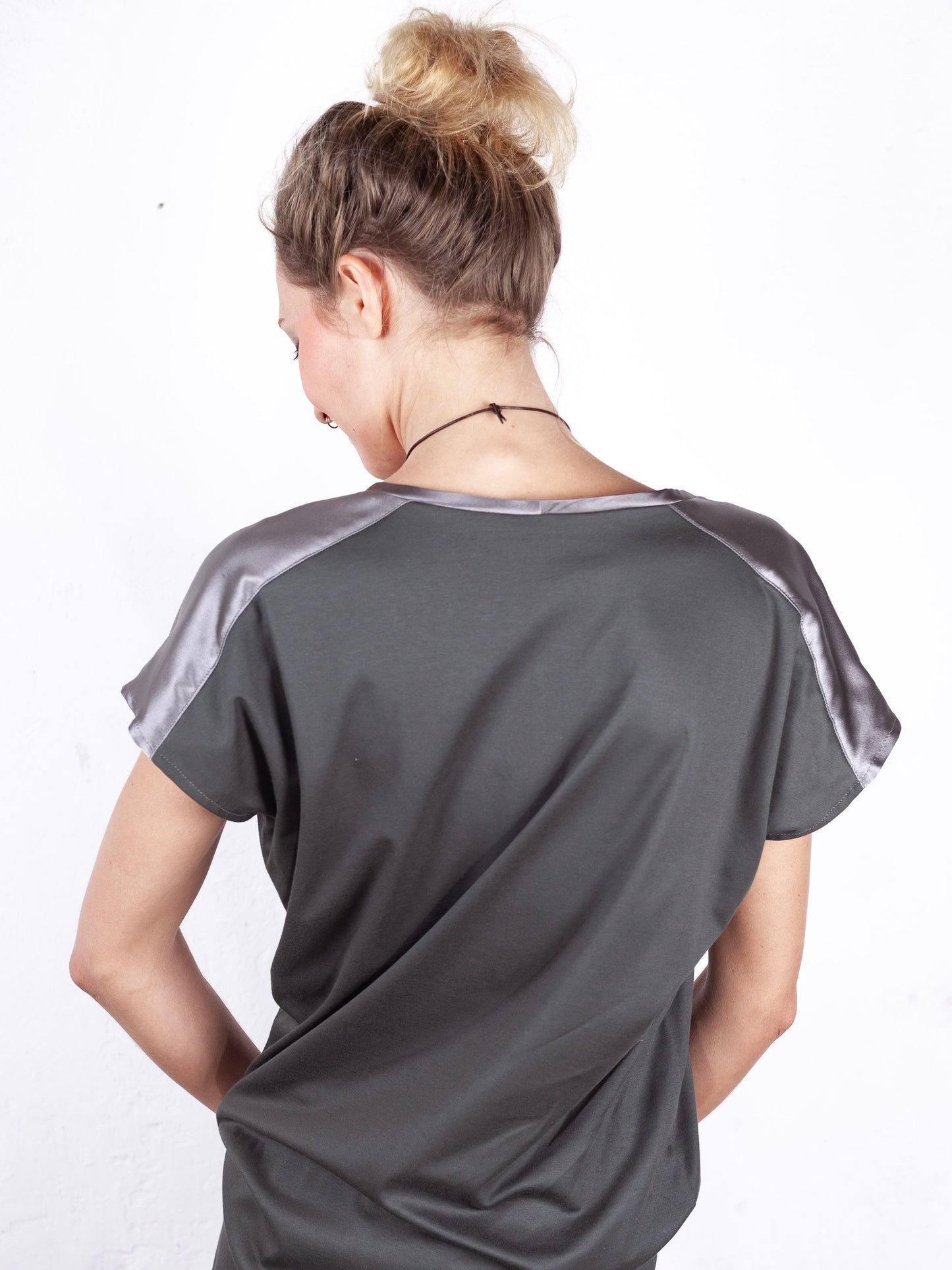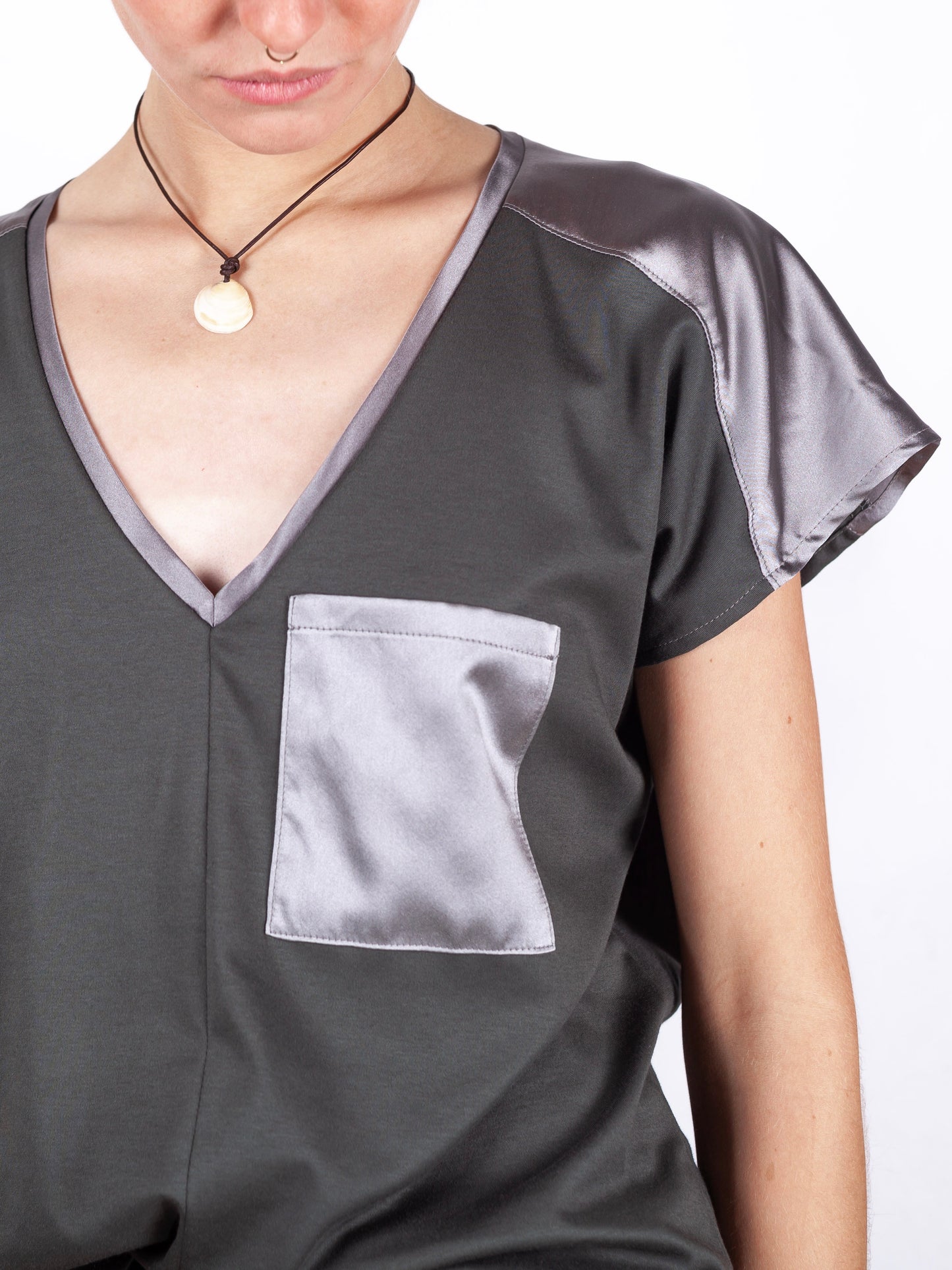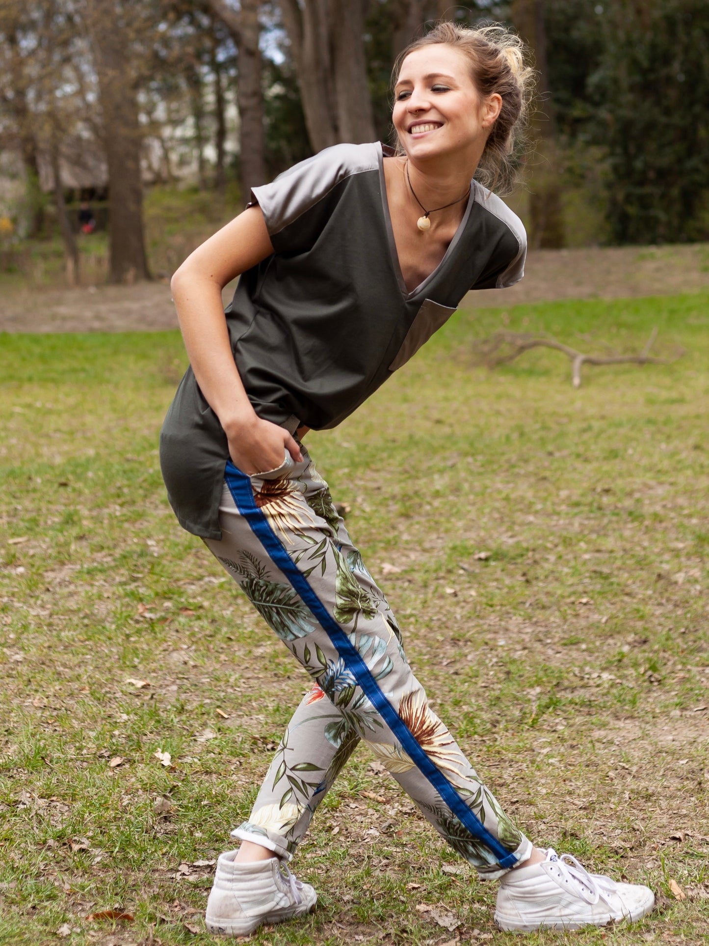 Wer denkt, Shirt ist doch gleich Shirt, sieht am Beispiel unseres Schnittmusters Olga, dass es auch in diesem Bereich unglaublich viele Varianten gibt. Wir sind unserer Liebe zum Patchen von verschiedenen Stoffen auch diesmal treu geblieben und haben daraus ein tolles und lässiges Shirt mit überschnittenen Schultern entworfen. Die Besonderheit liegt wie immer im Detail: die einteilige Schulterpasse, die aufgesetzte Tasche und der schmale Streifen im V-Ausschnitt sind aus Kontraststoff gefertigt.